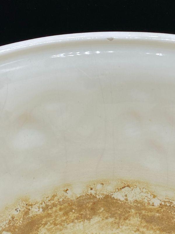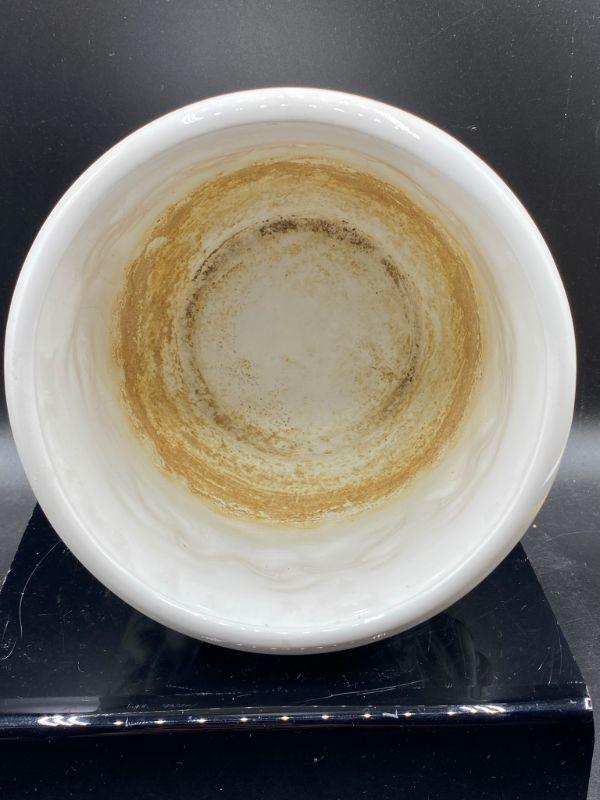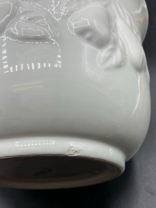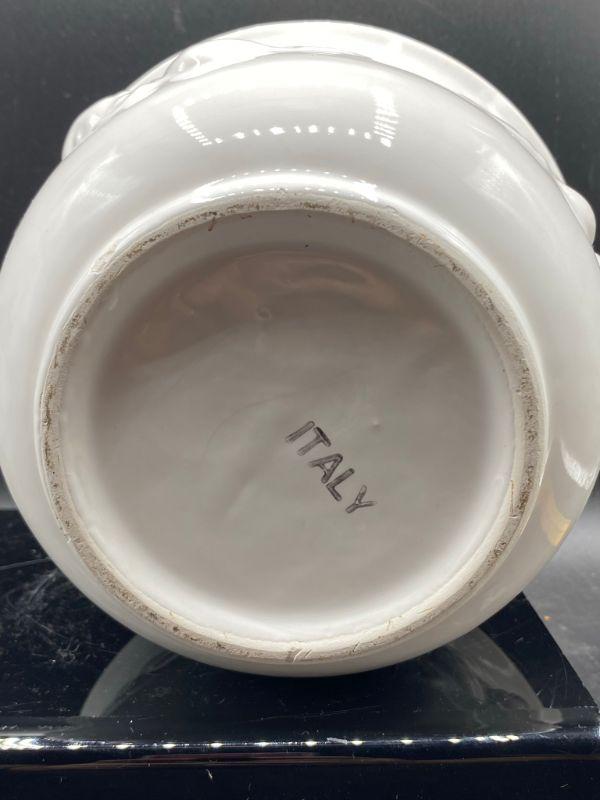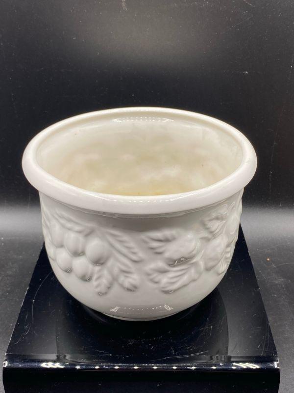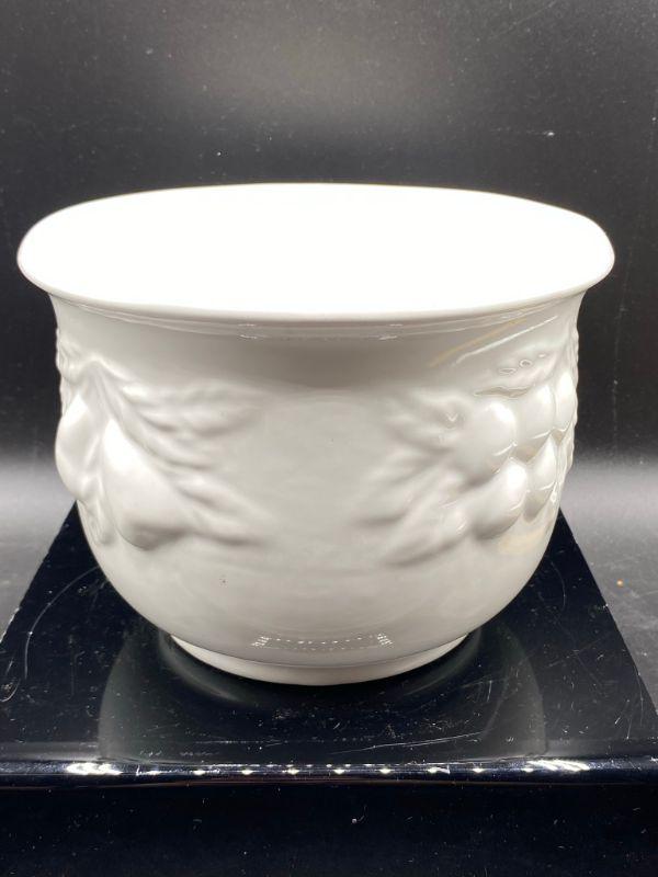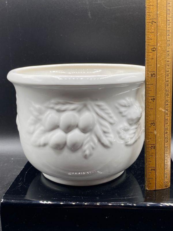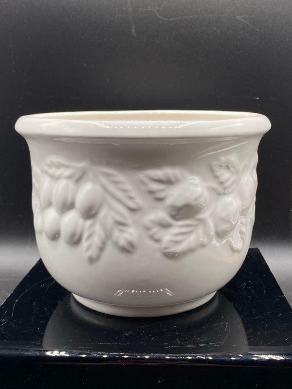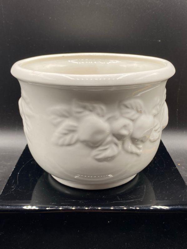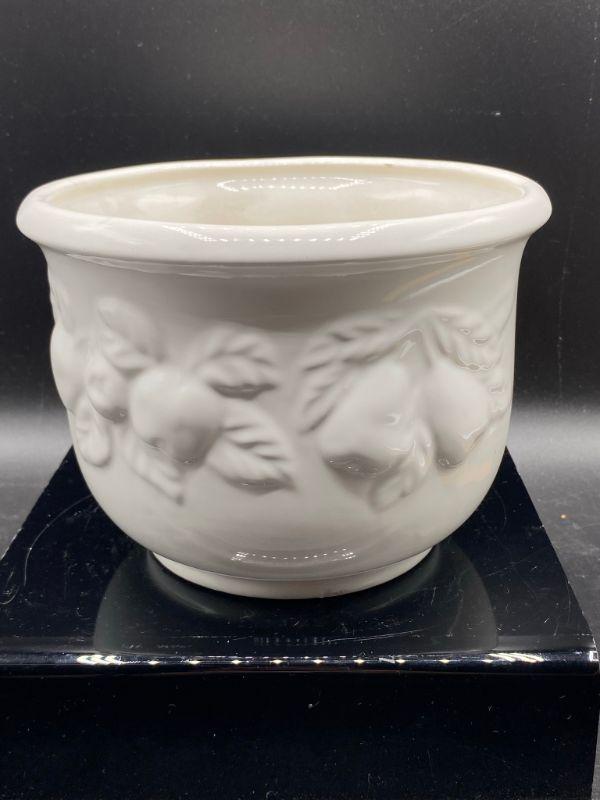 Fruit embossed planter pot. White ceramic. Previously used for a plant. Made in Italy. Stands about 5". Good condition.