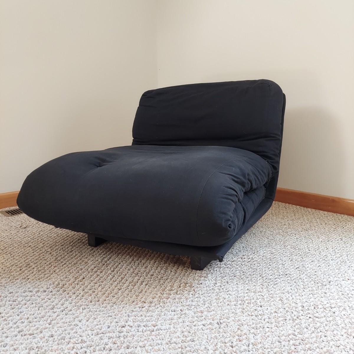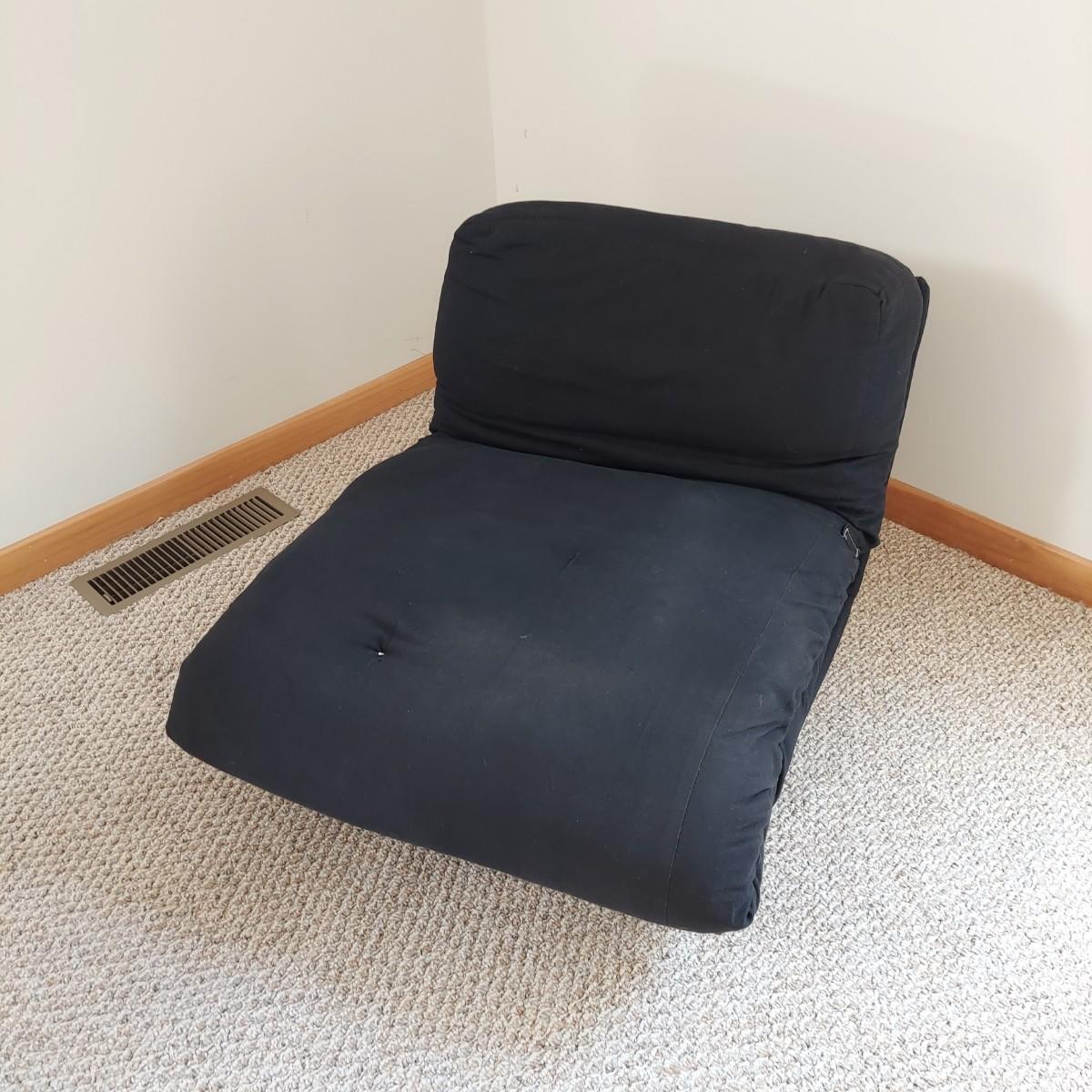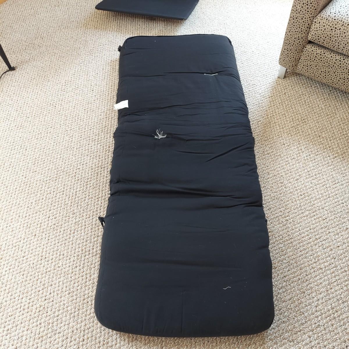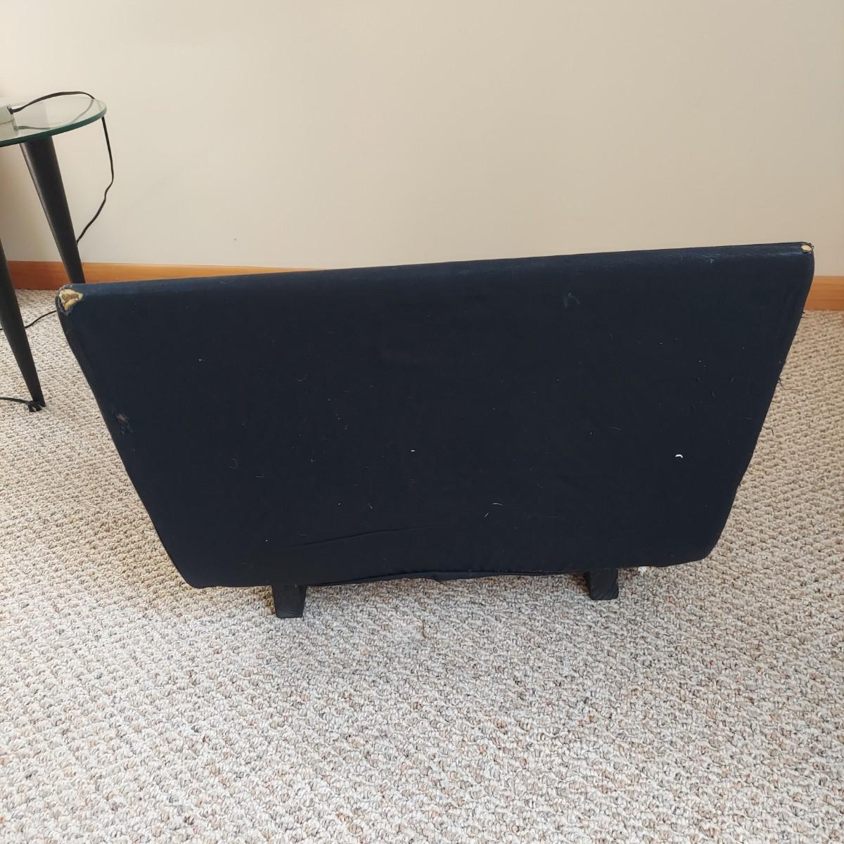 Black futon style low lounge chair. Wooden base with slip cover. Removable pad that can be stretched out as a sleeping mat. Some wear to base. Please see photos. Dimensions are seen on the tag. Local Pickup Only.