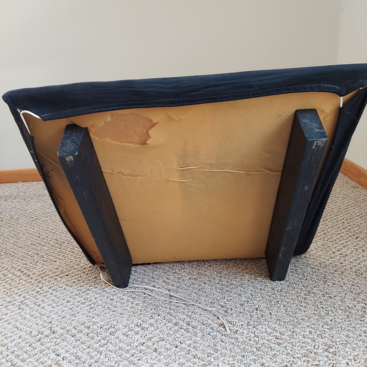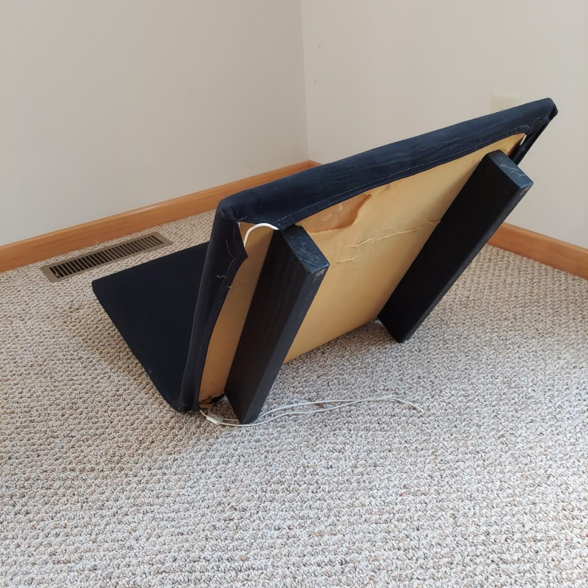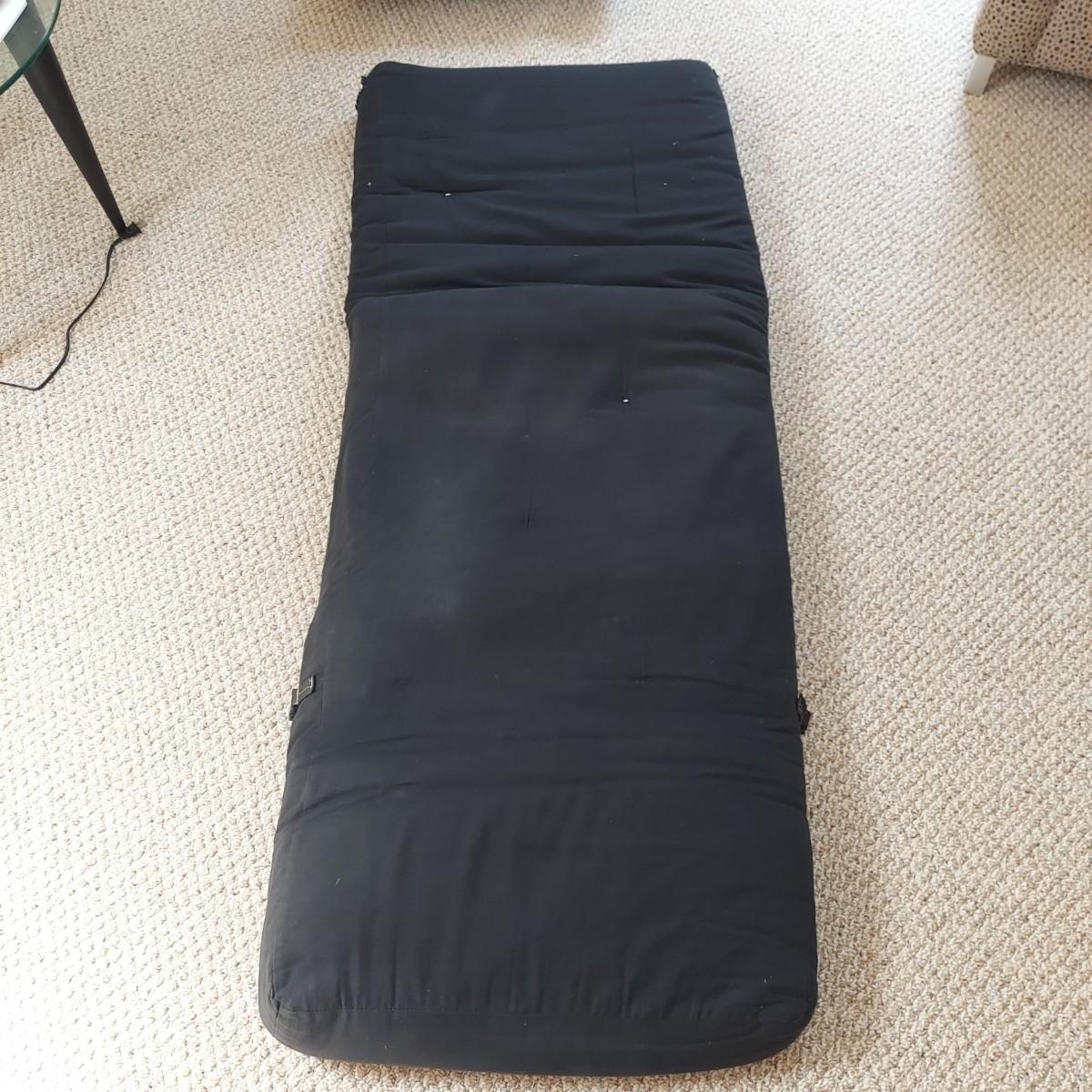 Black futon style low lounge chair. Wooden base with slip cover. Removable pad that can be stretched out as a sleeping mat. Some wear to base. Please see photos. Dimensions are seen on the tag. Local Pickup Only.
