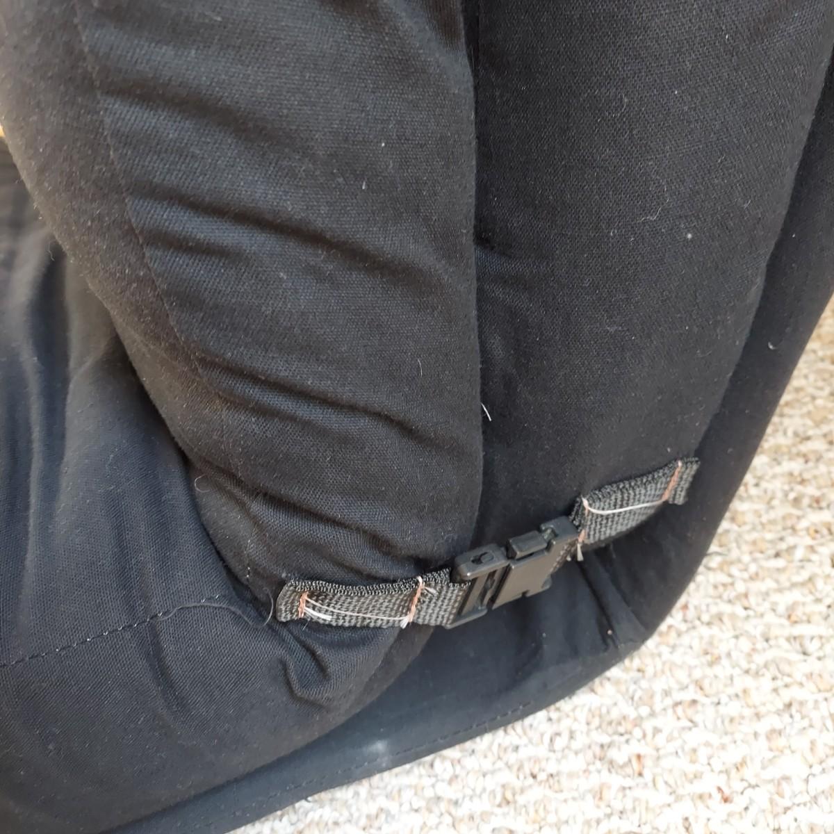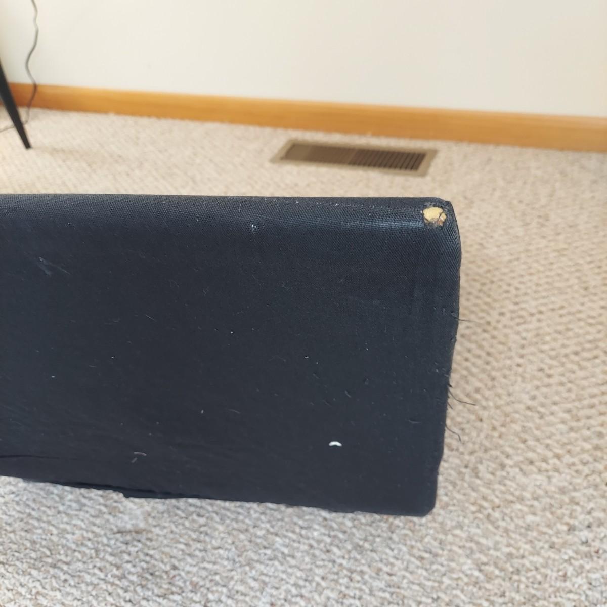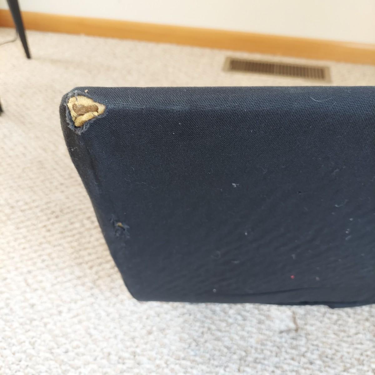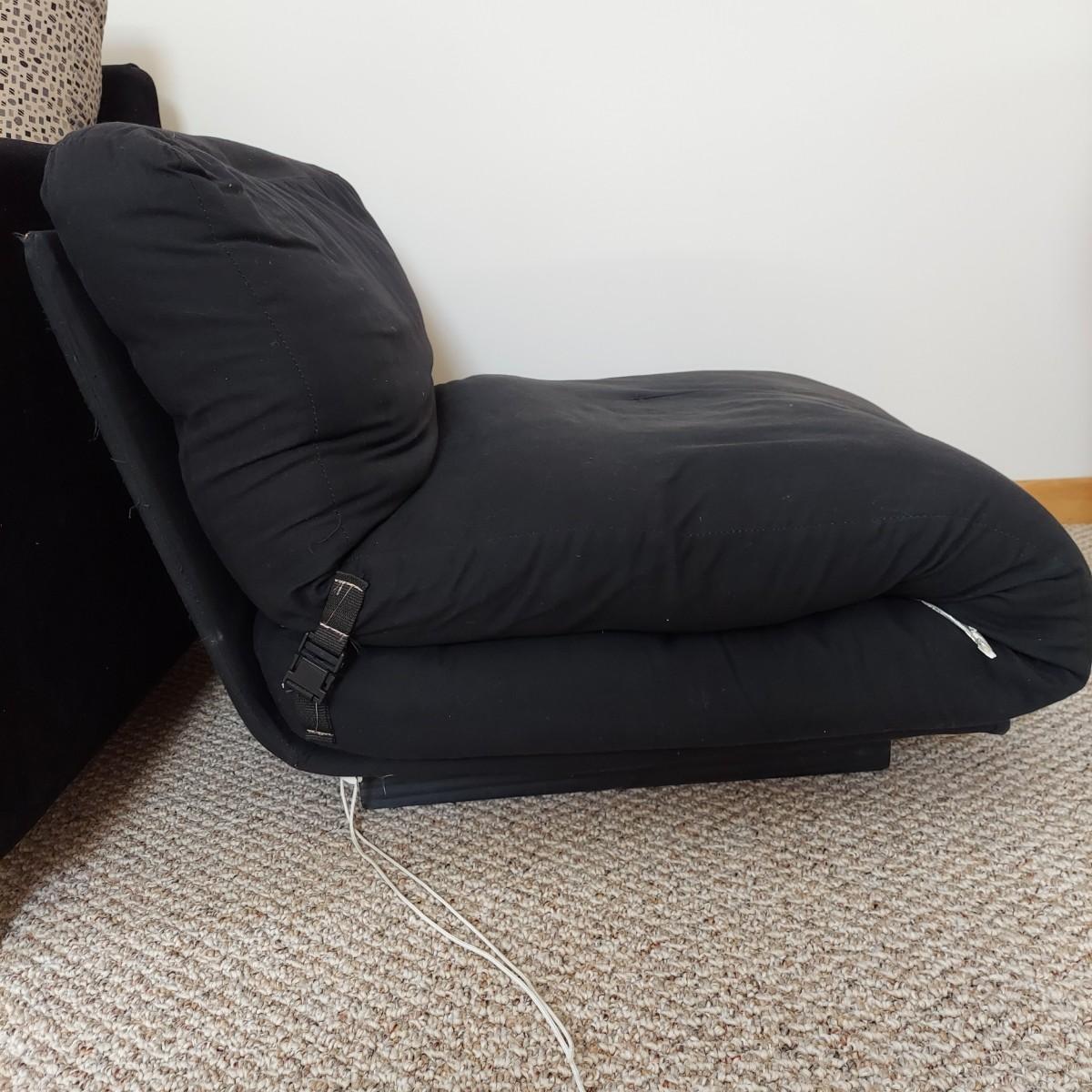 Black futon style low lounge chair. Wooden base with slip cover. Removable pad that can be stretched out as a sleeping mat. Some wear to base. Please see photos. Dimensions are seen on the tag. Local Pickup Only.