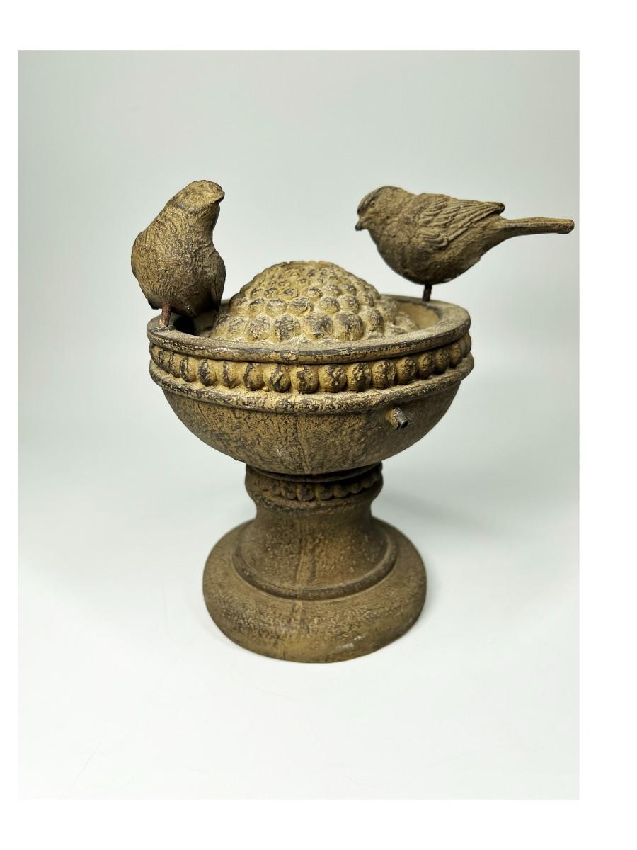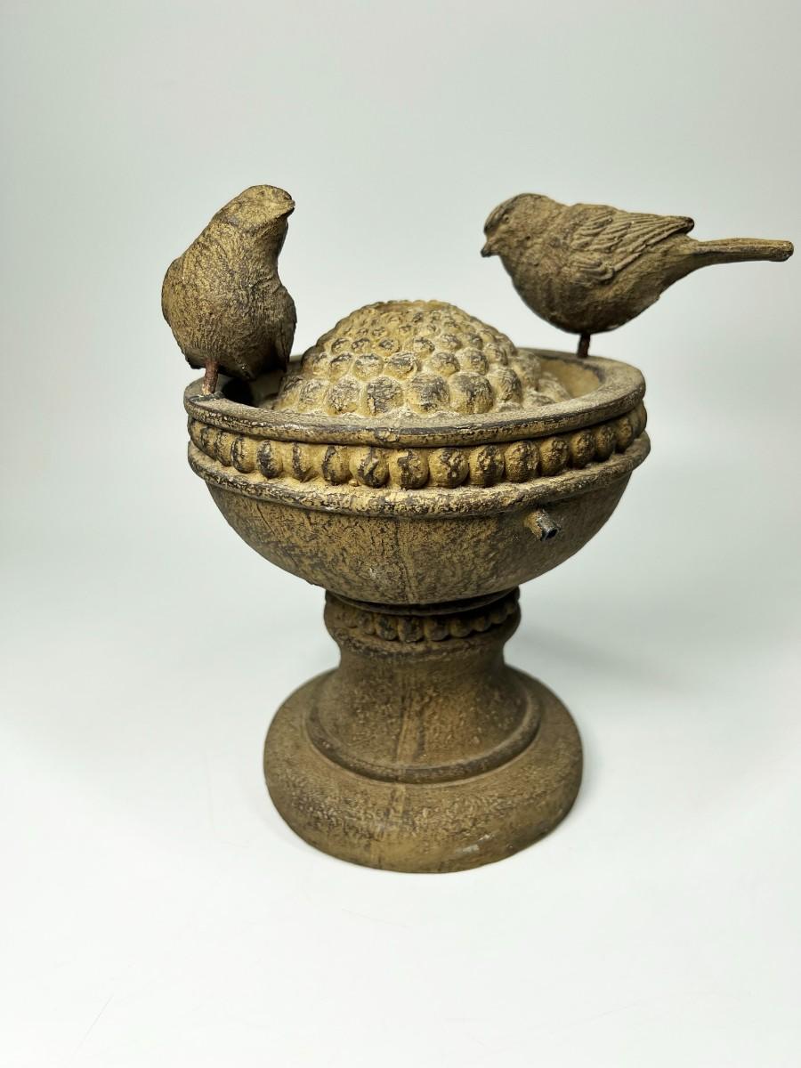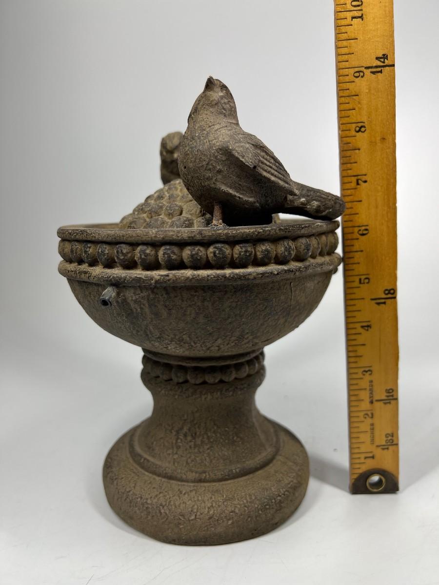 Small Garden Yard Art Bird Pedestal Fountain, one of the birds is chipped off from the fountain, but there is no other significant damage and is in good displayable condition. Check pictures for more details, the fountain does not come with any other component to make it run and is a display piece.