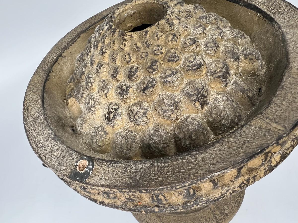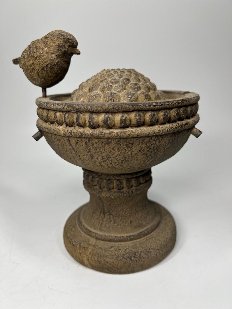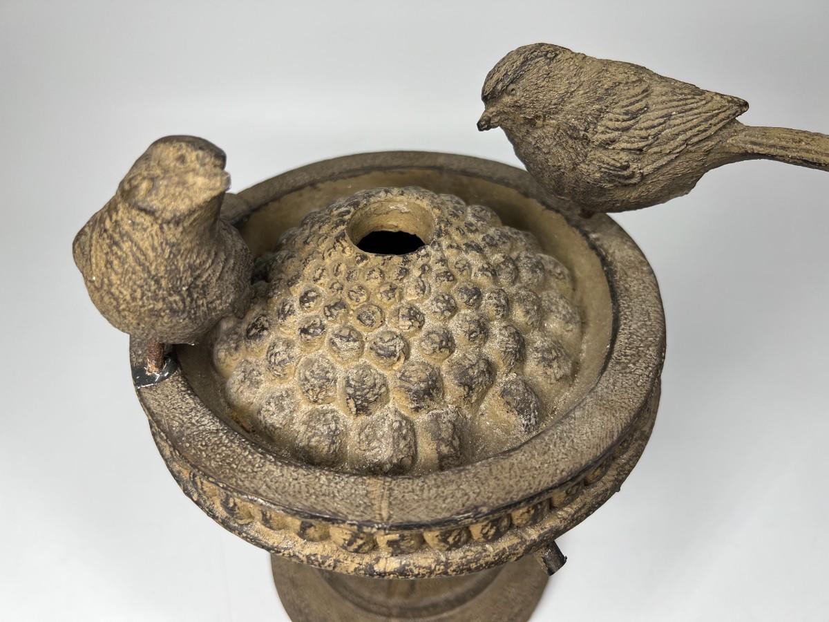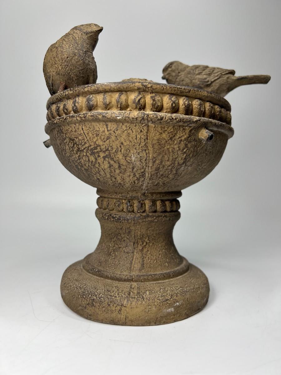 Small Garden Yard Art Bird Pedestal Fountain, one of the birds is chipped off from the fountain, but there is no other significant damage and is in good displayable condition. Check pictures for more details, the fountain does not come with any other component to make it run and is a display piece.