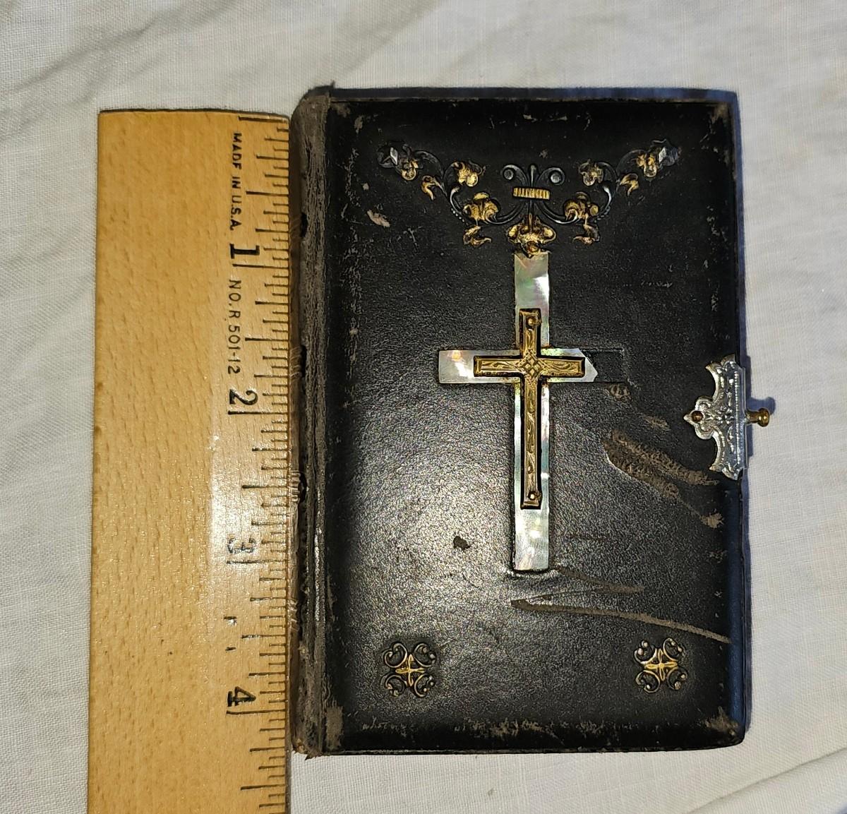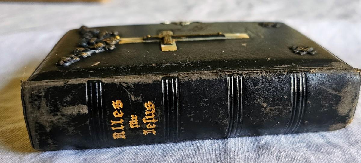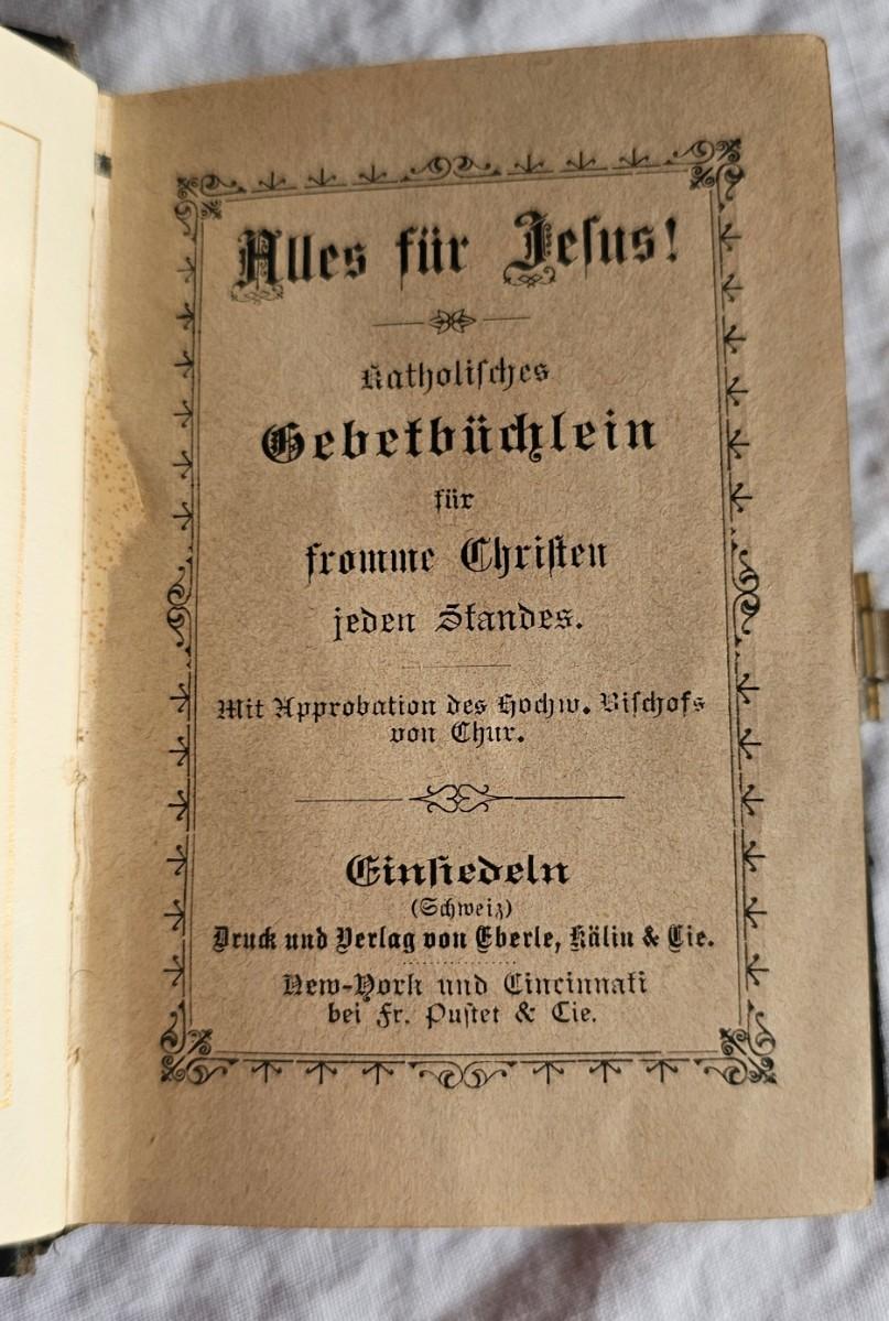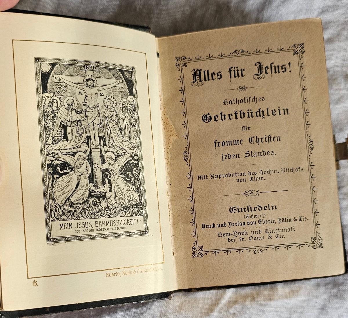 1800s German Prayer Book, Alles Fur Jesus. Leather bound with gold colored metal clasp.