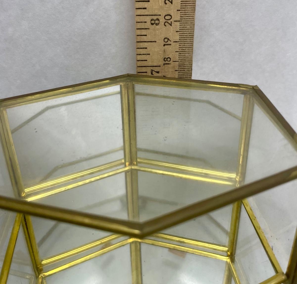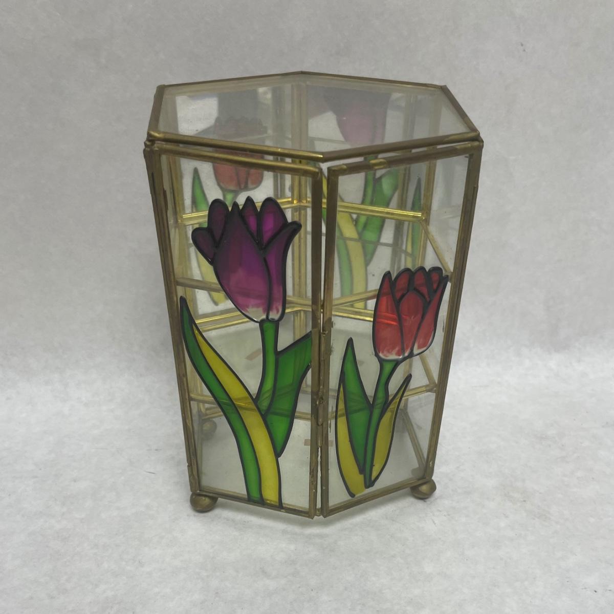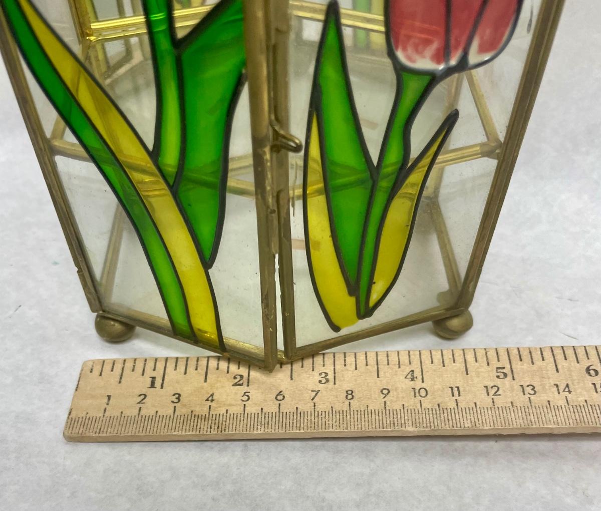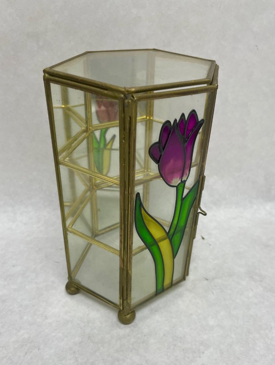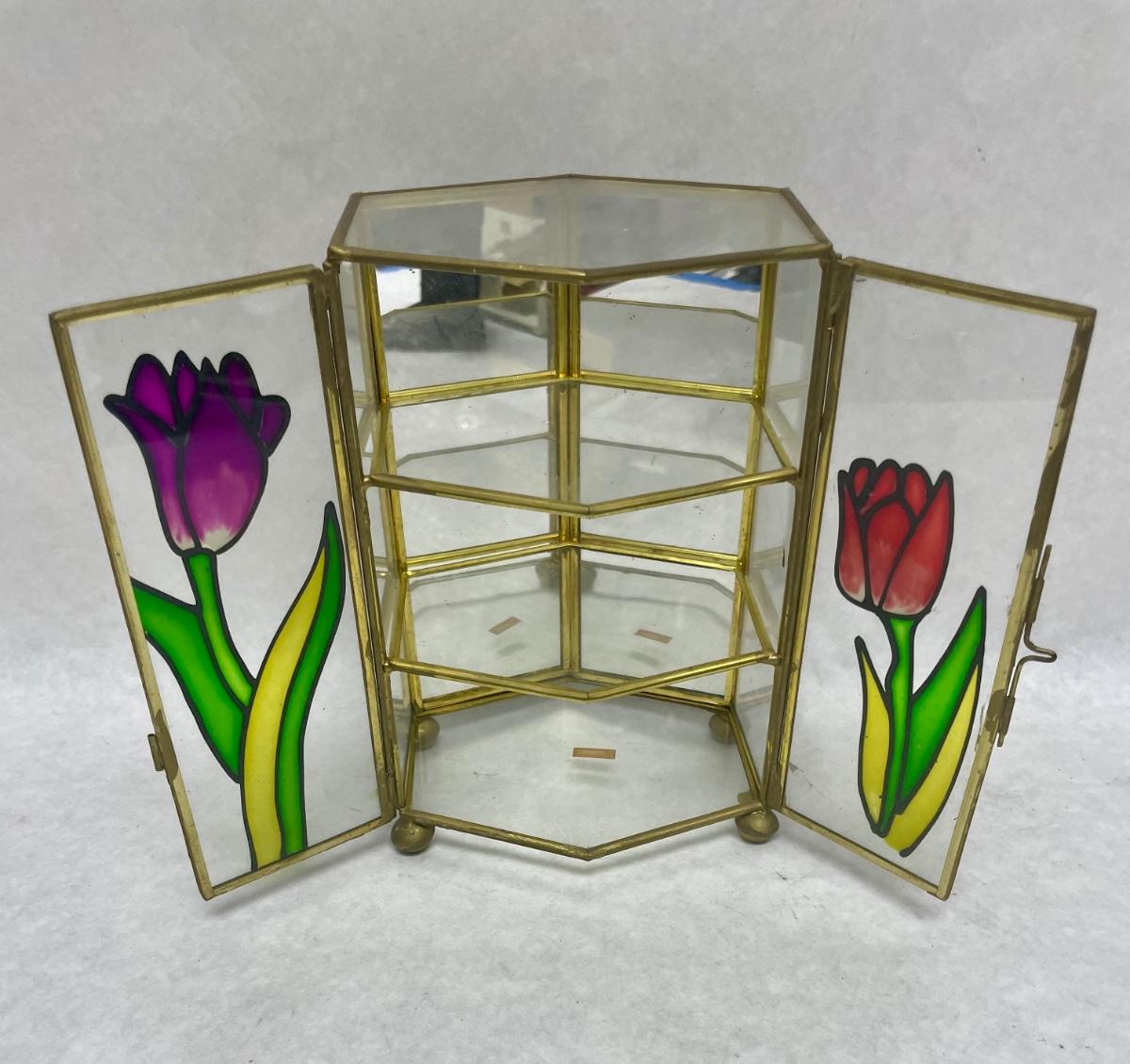 Small Brass & Glass Display Cabinet with Stained Glass Flowers