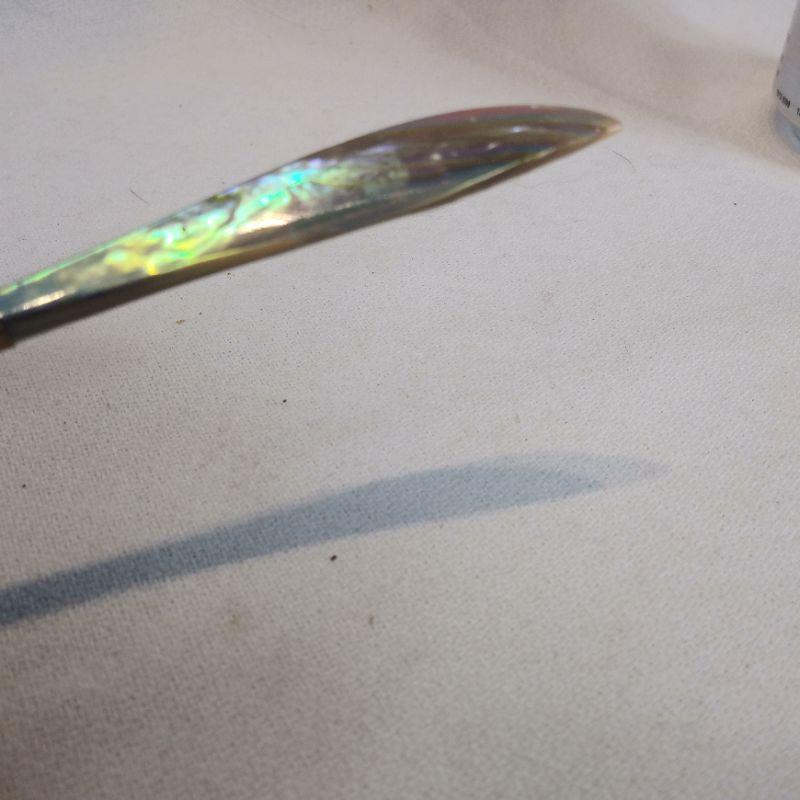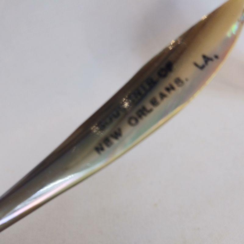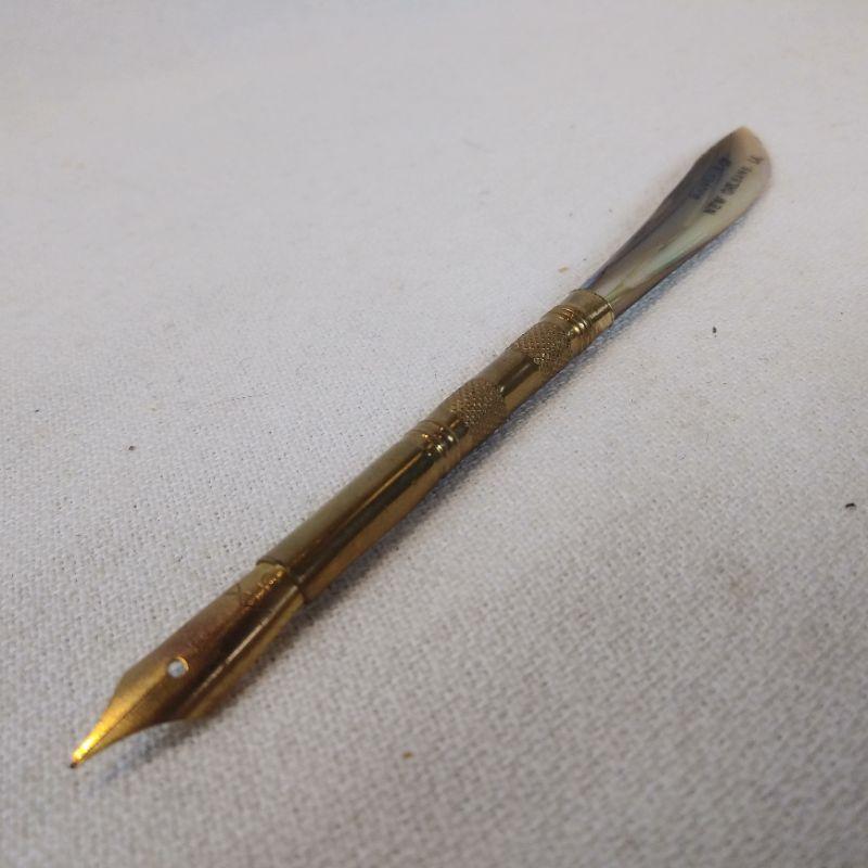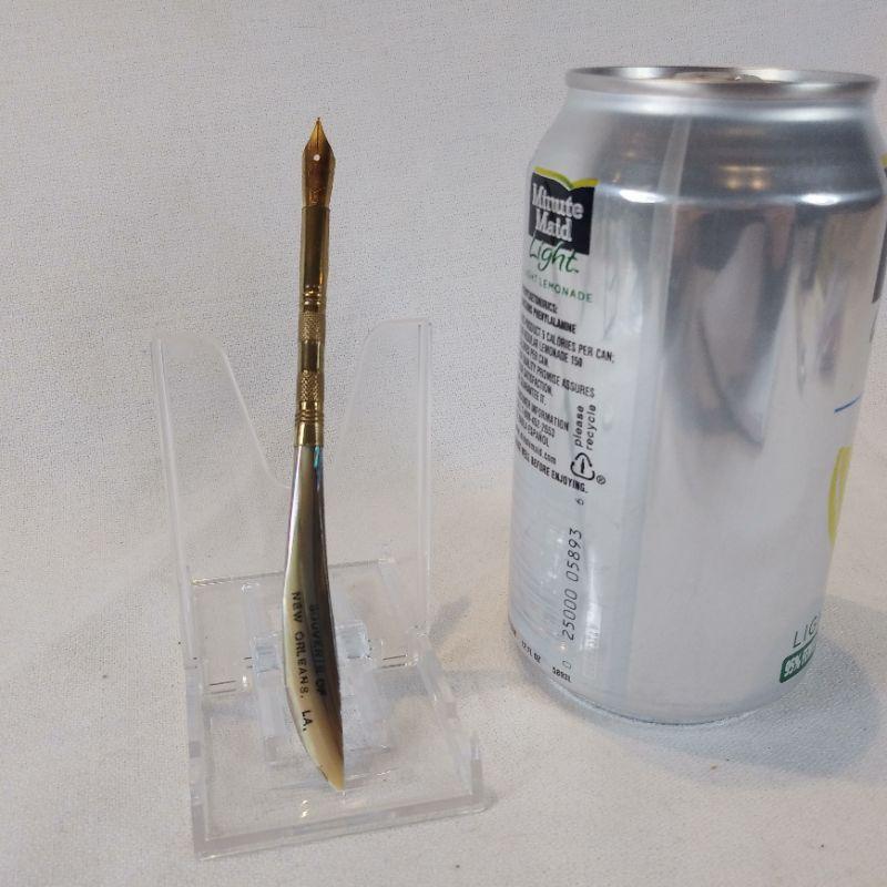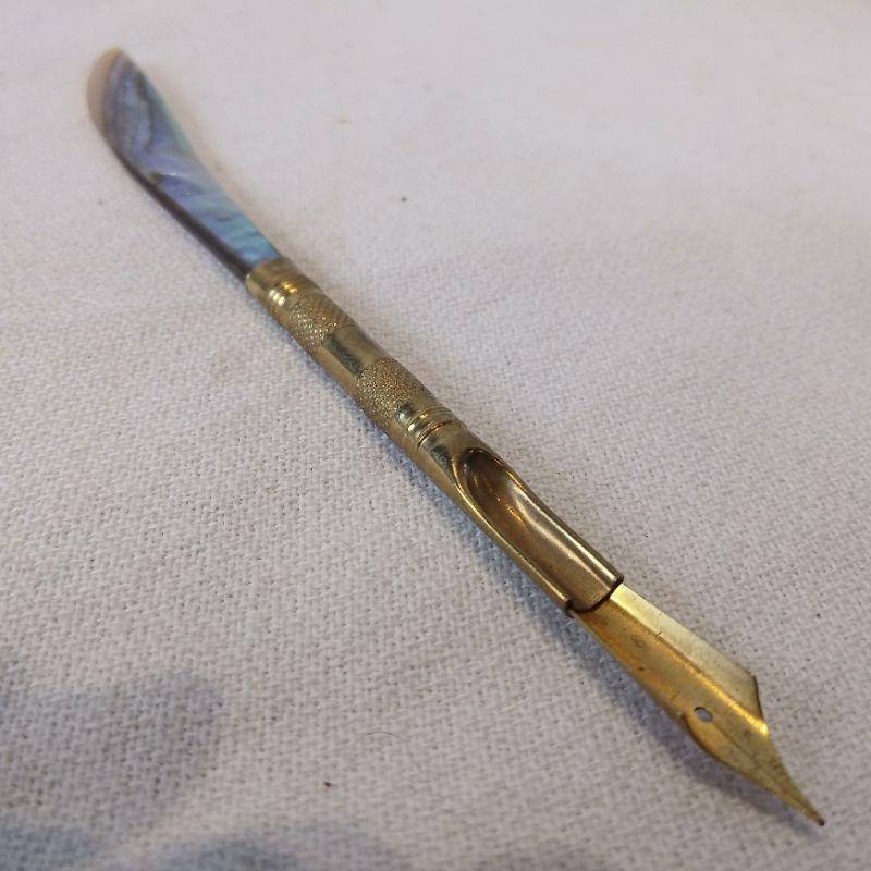 This item is a small Gold and Abalone Shell Fountain Pen. Nib is not marked gold but we believe it is - you be the ultimate judge. It is marked "The Regal" #5. On the abalone shell handle is marked Souvenir of New Orleans, Louisiana. It appears to be a vintage piece and is quite a beautiful travel token. It measures 5 1/2-inches long. Starting Bid/Reserve is $12.