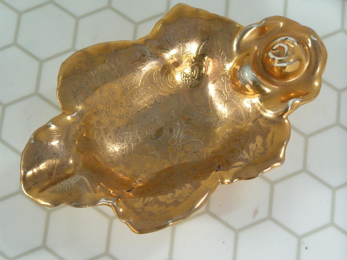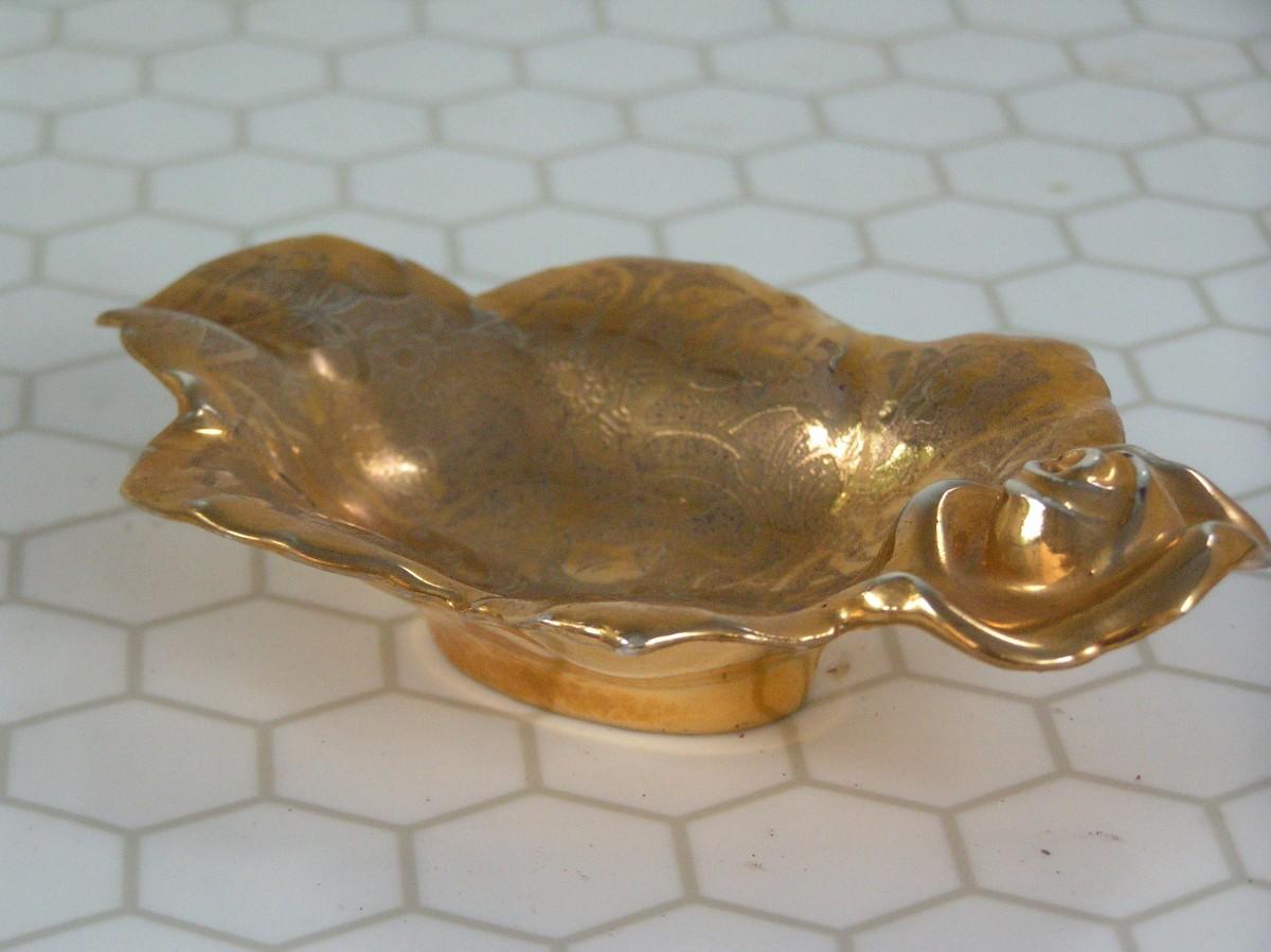 Small gold plated ceramic bowl, or maybe ash tray. About 5" long.