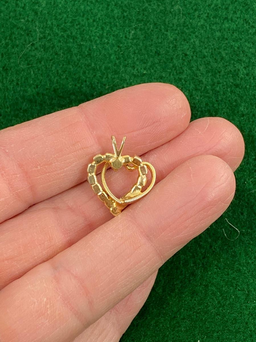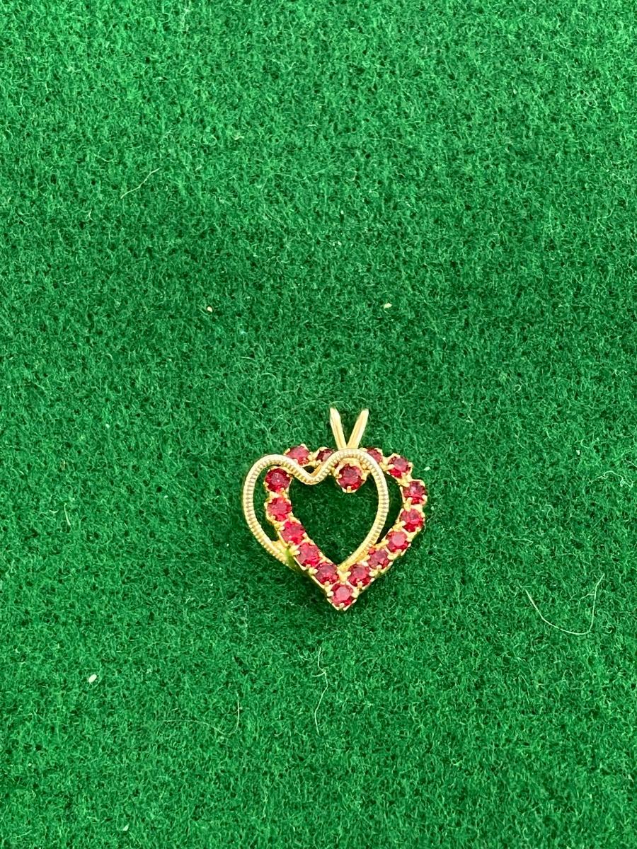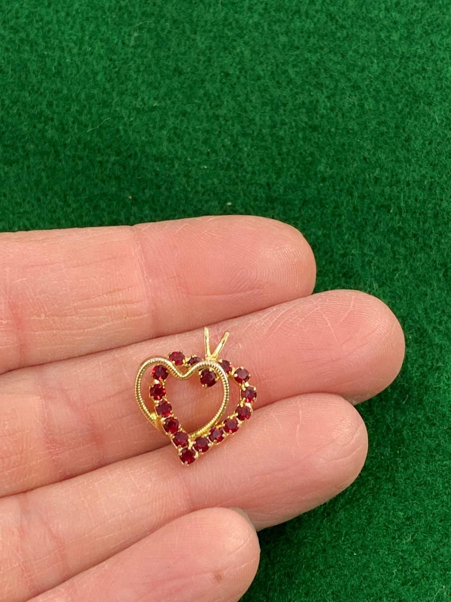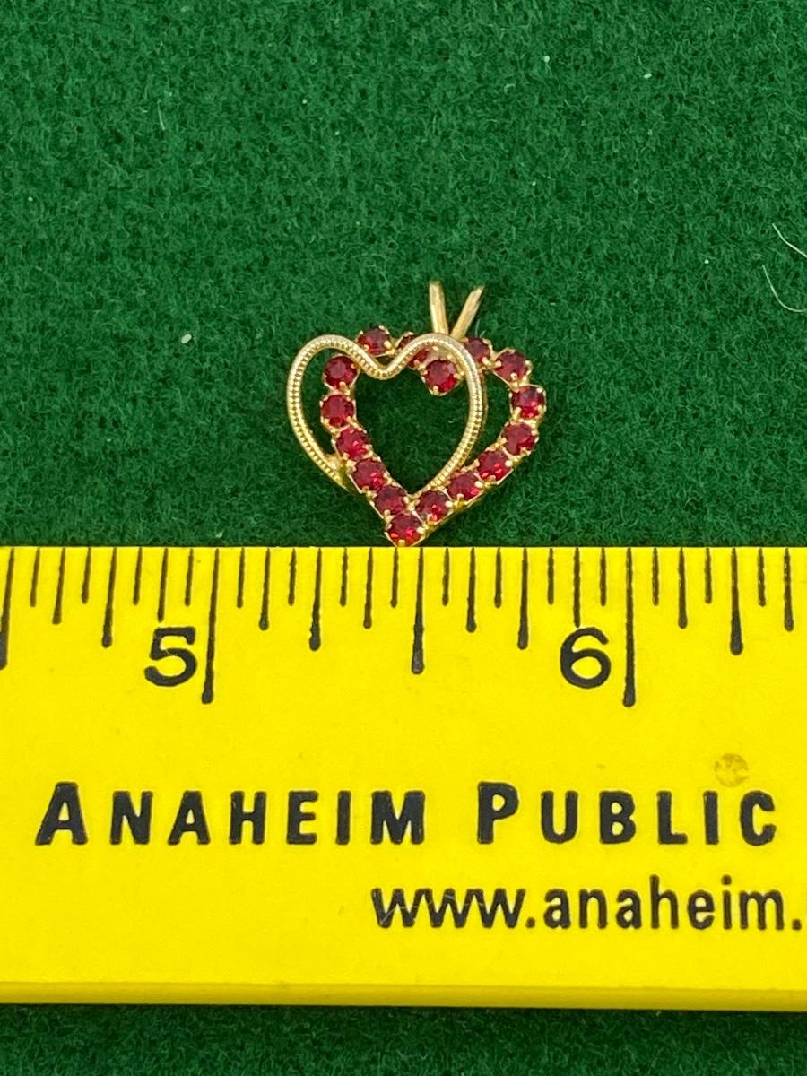 Small dual hearts pendant charm. Gold tone with red rhinestones. No maker marks or gold marks. About 1/2" size.