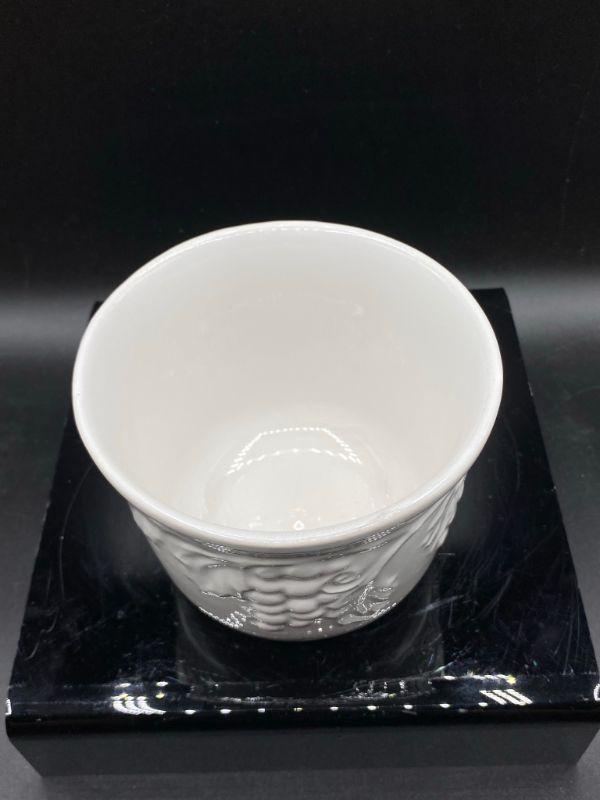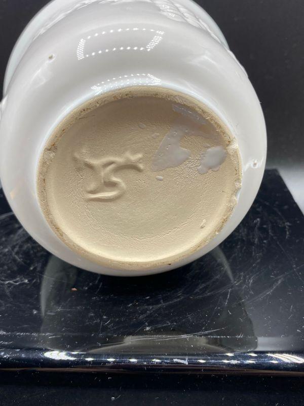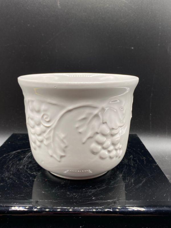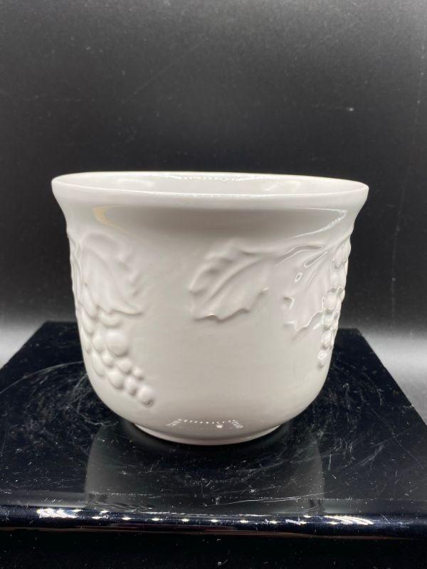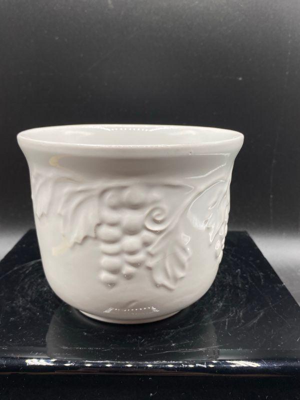 Small white planter pot with a grapevine pattern around the outside, Good condition. Has a mark on the bottom but cant make it out. Stands 4".