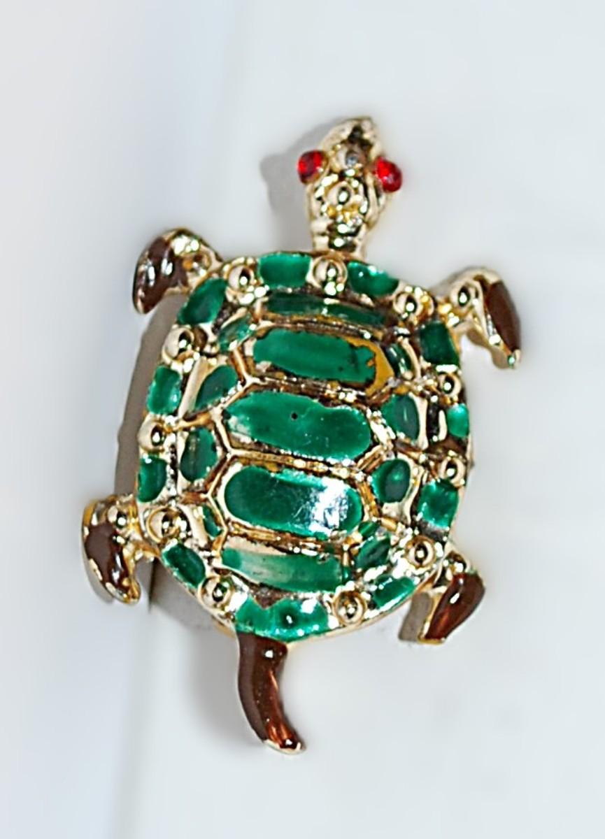 Small GREEN TURTLE BROOCH (1¼" x ¾") with Green Stripes, Red Eyes & Brown Tail on a Gold Tone Setting