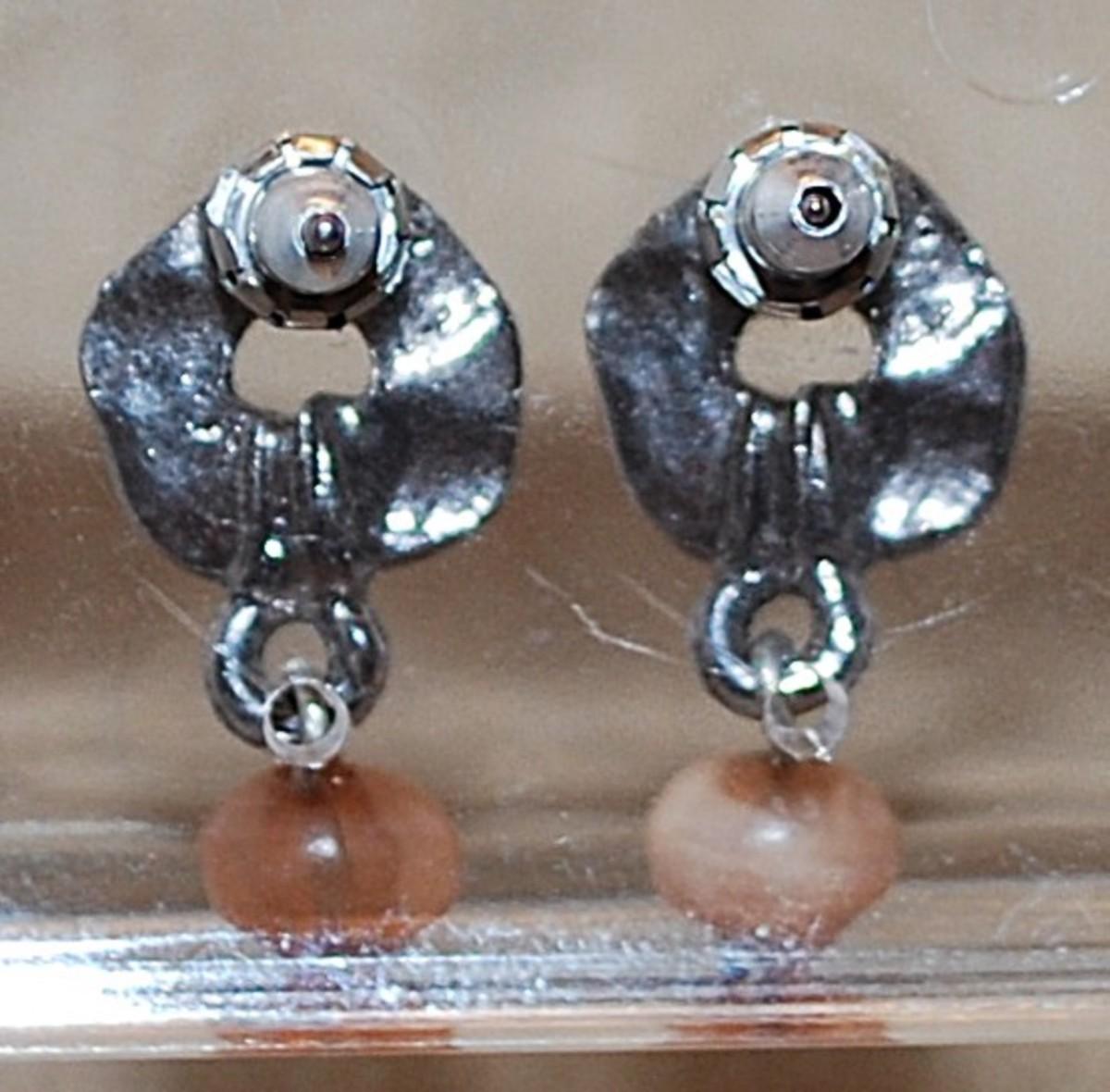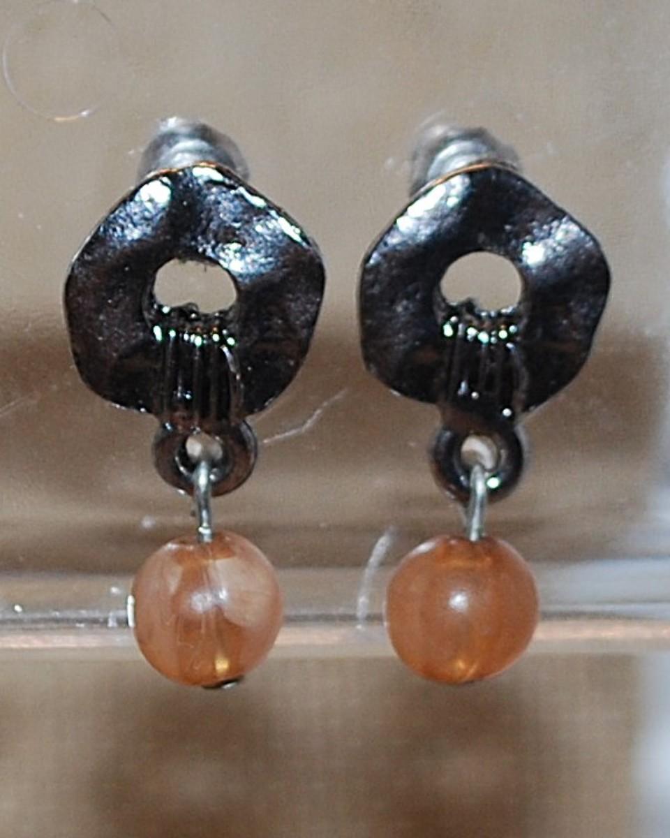 Small Hammered Silver Tone Metal with Single Brown Bead Earrings (¾") and Stud Clasp