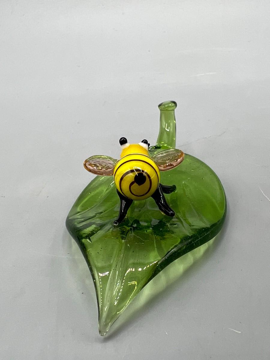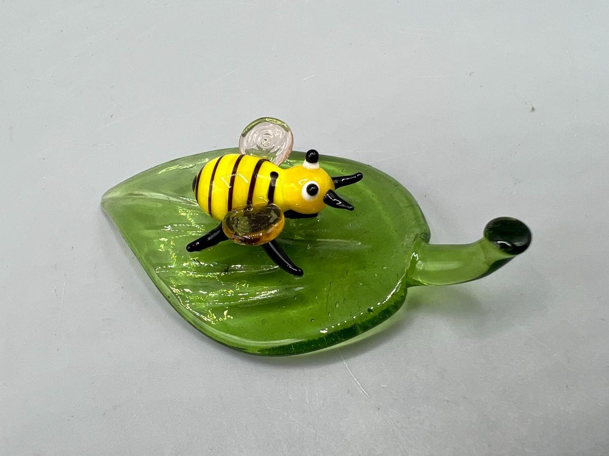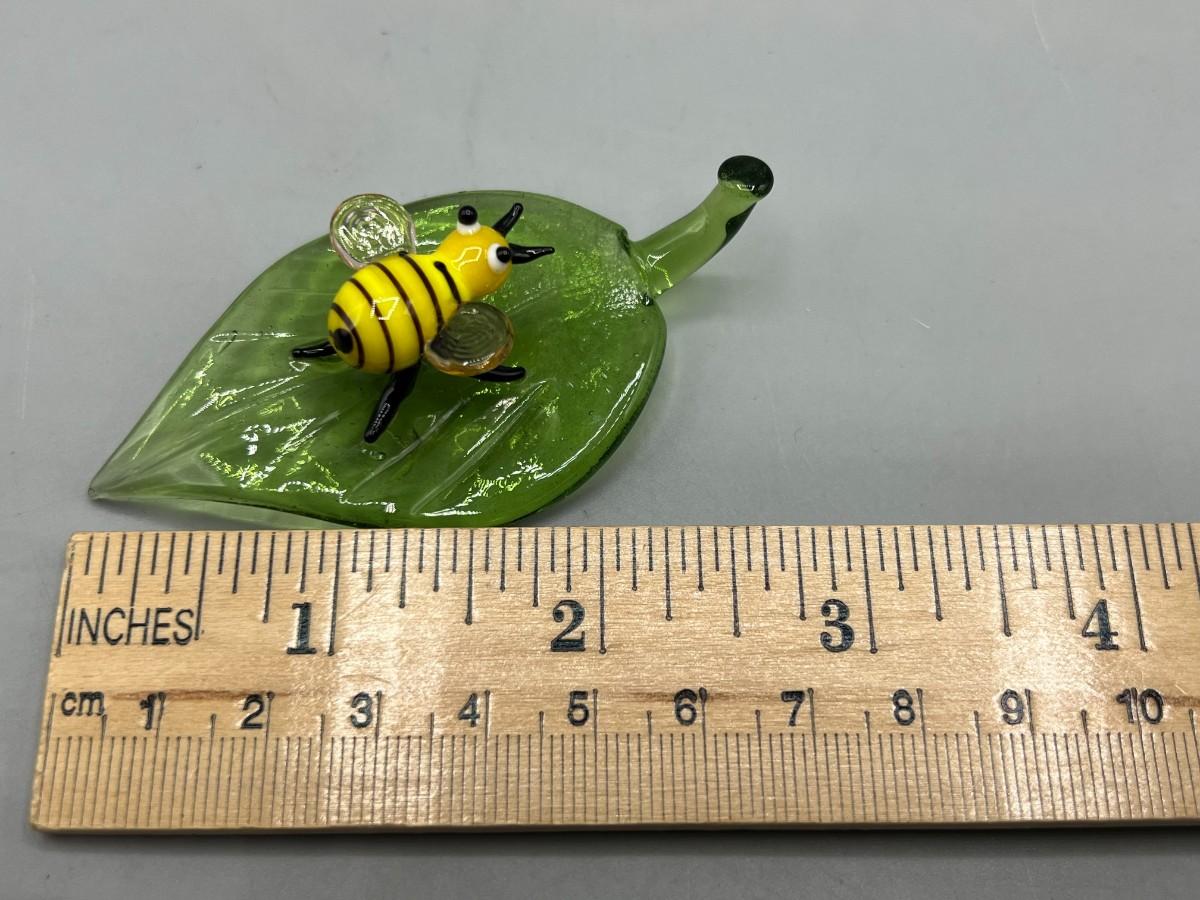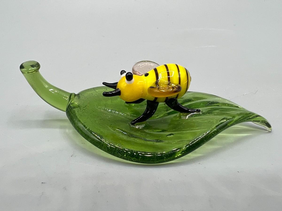 Small Hand Blown Glass Yellow Bumble Bee on Leaf Figurine Sculpture