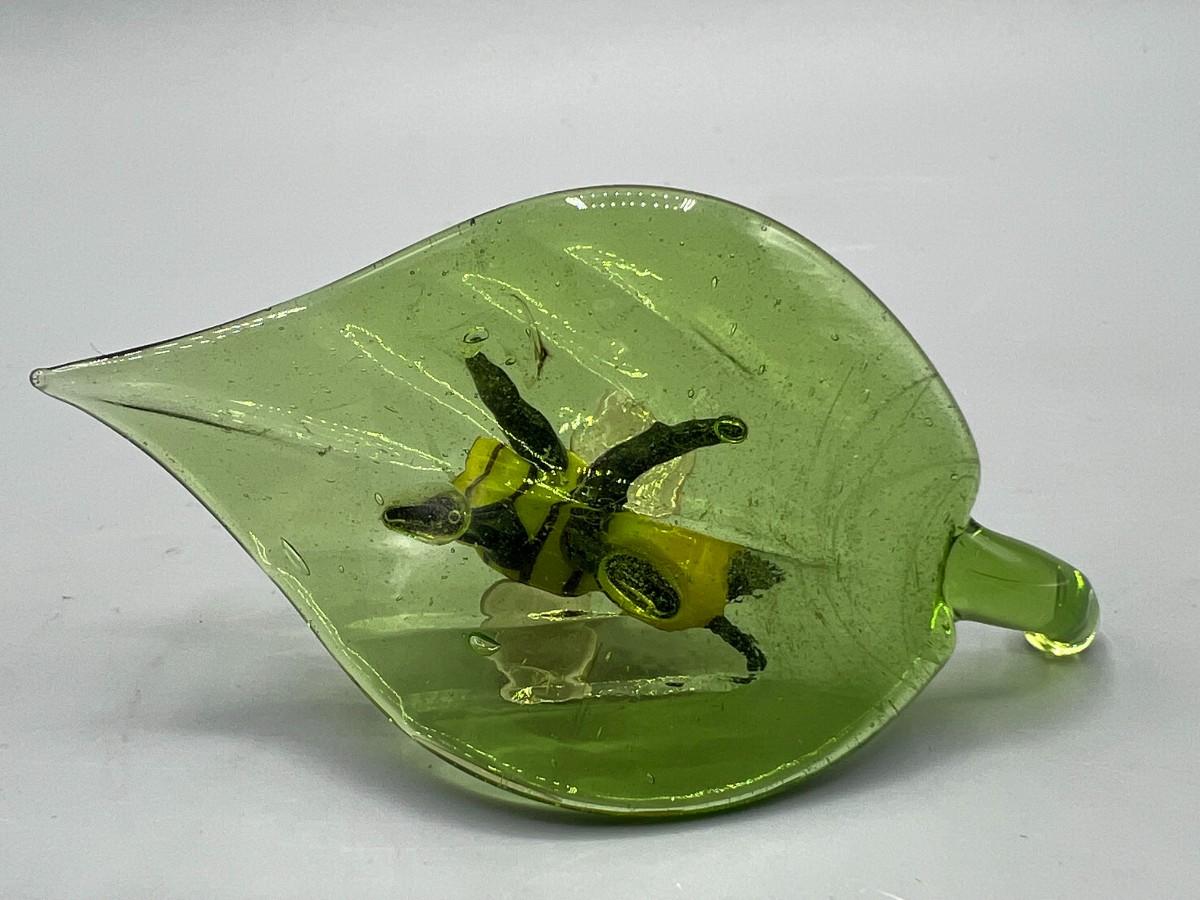 Small Hand Blown Glass Yellow Bumble Bee on Leaf Figurine Sculpture, there is no signifncant chips or cracks to the glass and is in good displayabel condition. Check pictures for more details and for sizing.