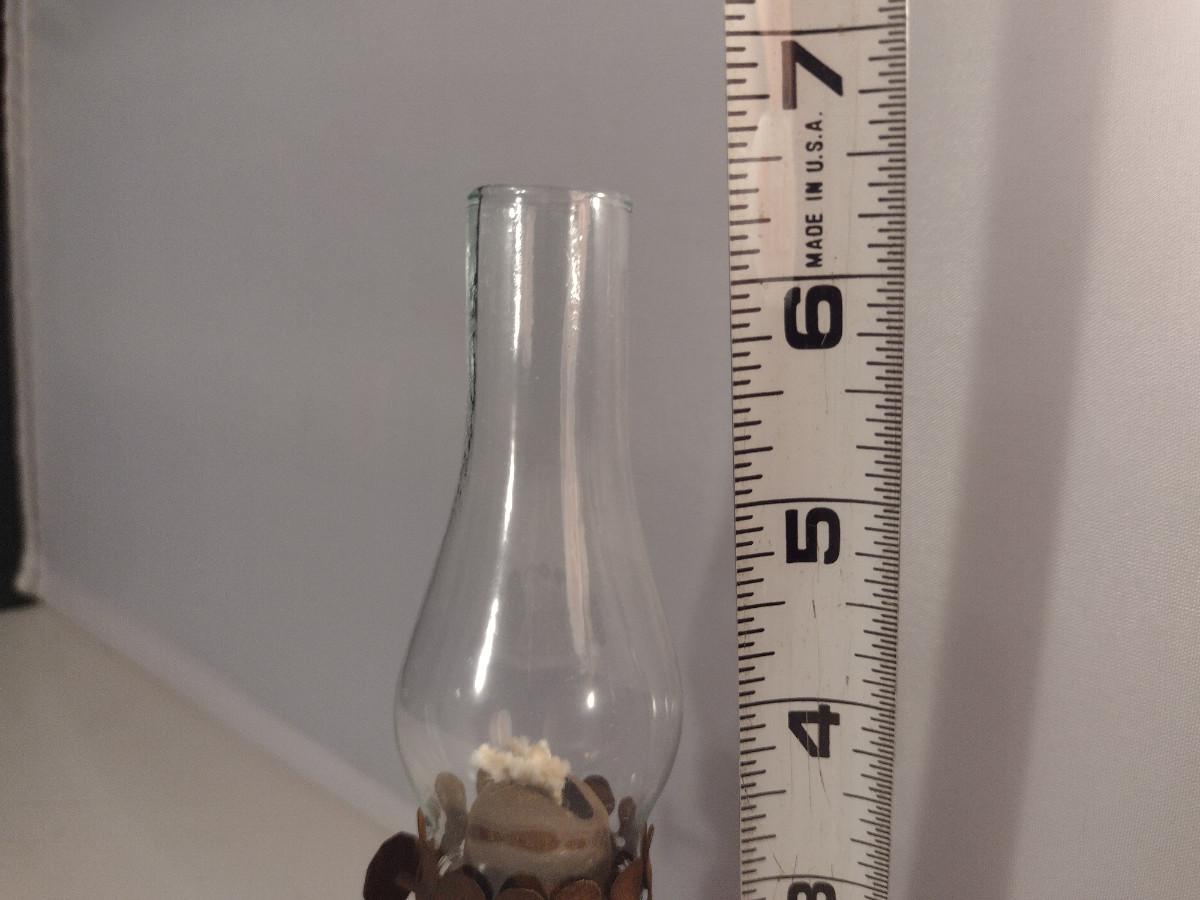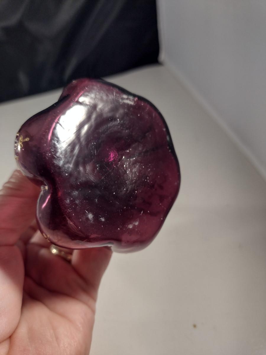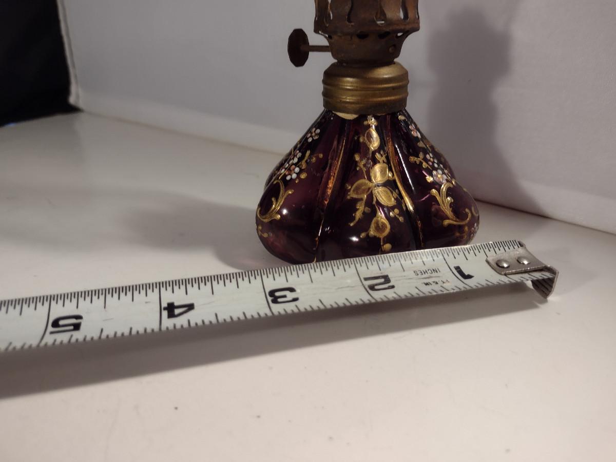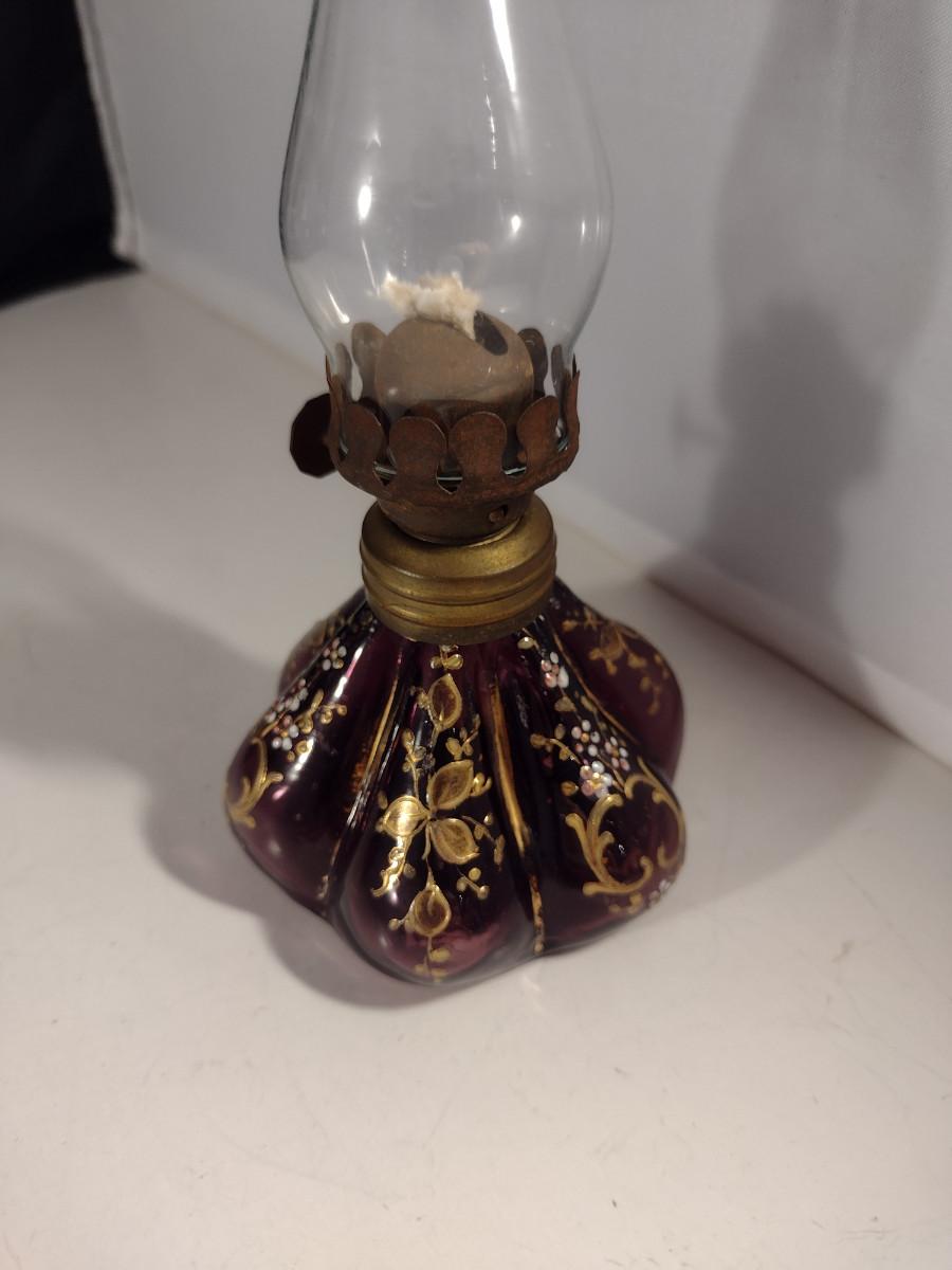 Small, Hand Painted Amethyst Glass Oil Lamp with Chimney Shade- Approx 6 1/2" Tall
