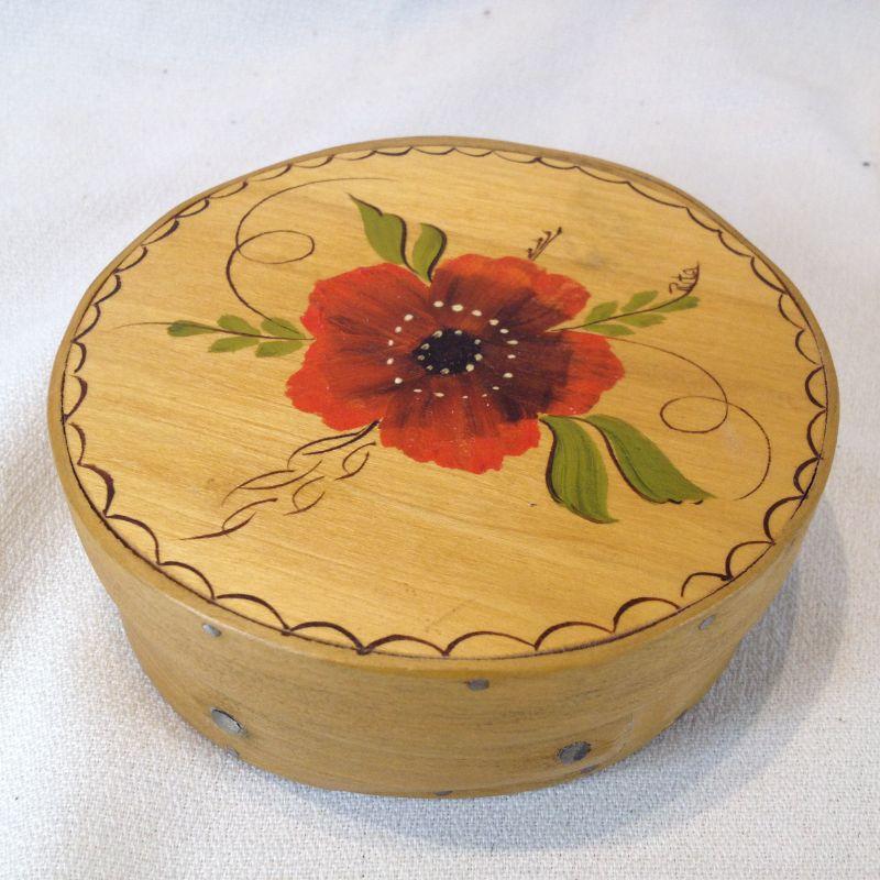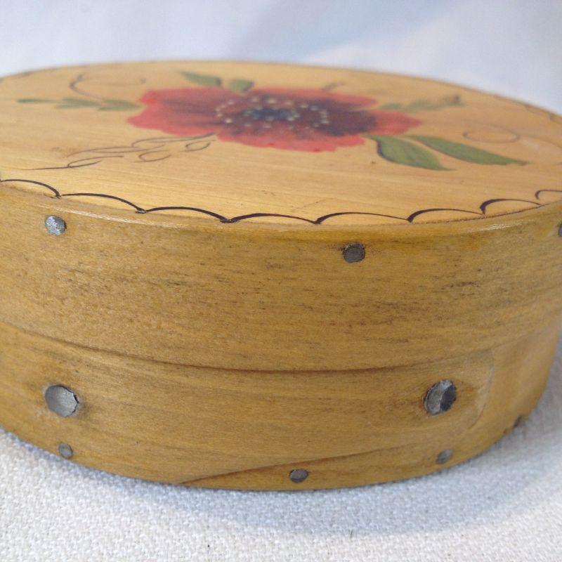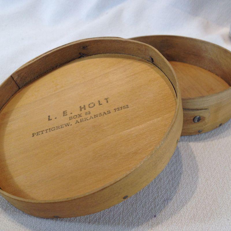 This lot is for a wonderful hand-crafted, hand-painted Shaker-Style Box. Made by L.E. Holt of Arkansas. It is in very good condition. Stamped inside lid and bottom - L. E. Holt Pettigrew, Arkansas.