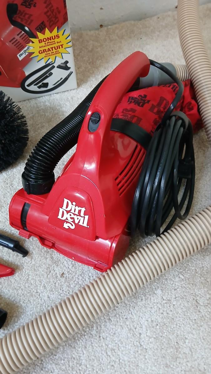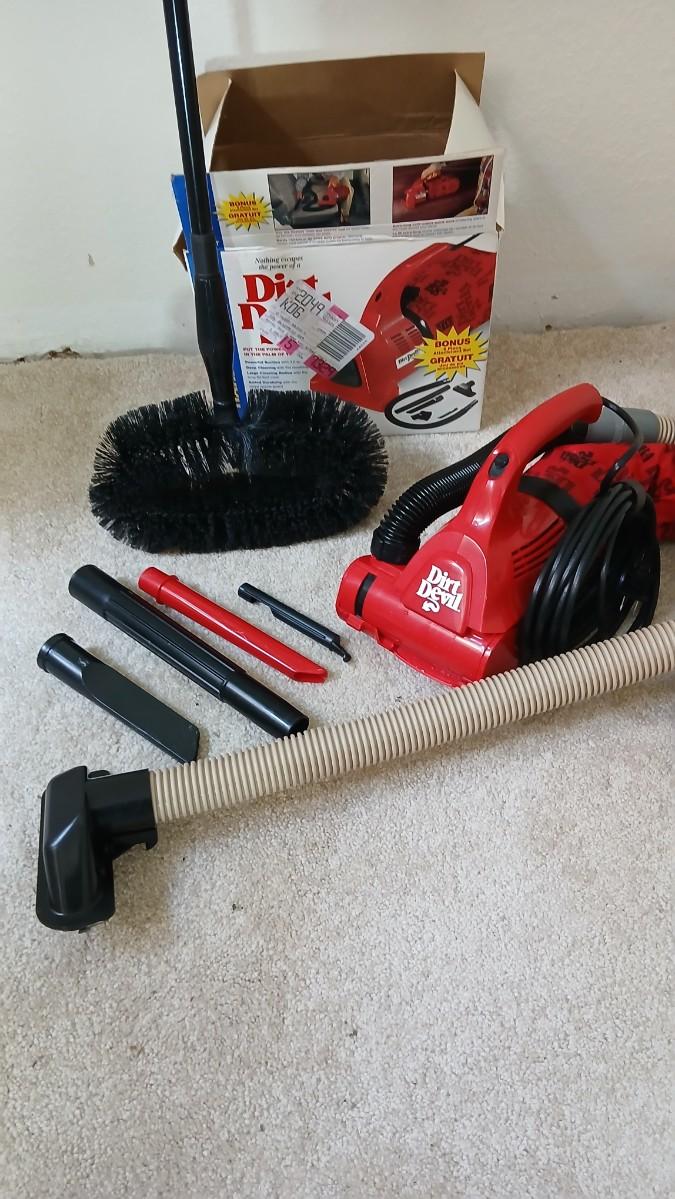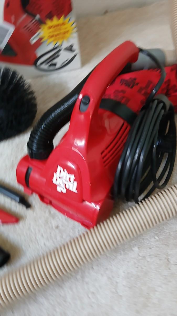 Small handheld Dust Devil vacuum and attachments with ceiling fan brush - both appear like new