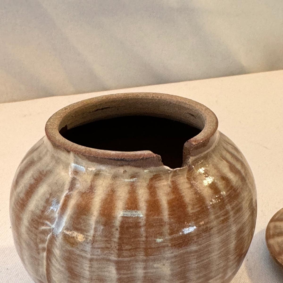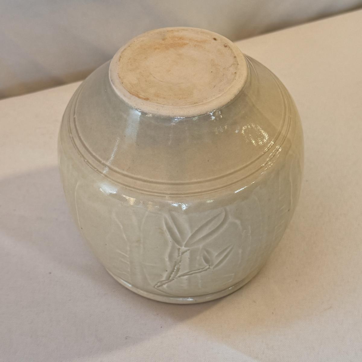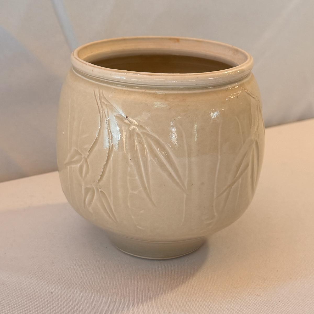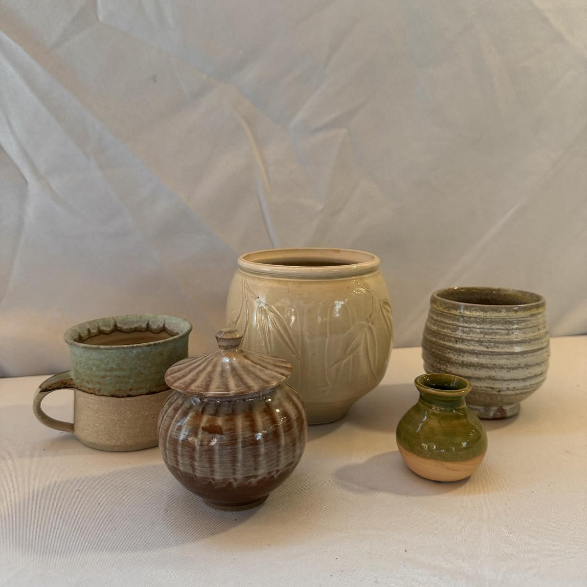 This lot includes one cream colored ceramic planter with bamboo etching, one blue and white ceramic mug, one tiny green vase, one grey ceramic cup, and one brown sugar dish with a removable lid. The sugar dish has a small chip on the rim - see picture included. The largest item is the cream planter that measures 5” x 6”H. The mug appears to be labeled “Wildcat Creek ‘75” on the bottom. The tiny green vase reads “Plymoth Plantation” on the bottom. Shipping available.