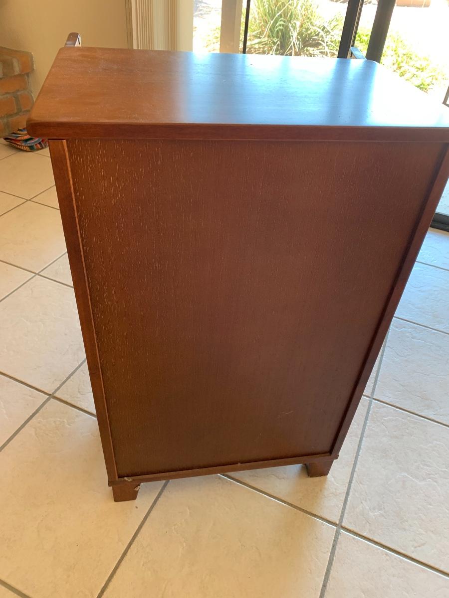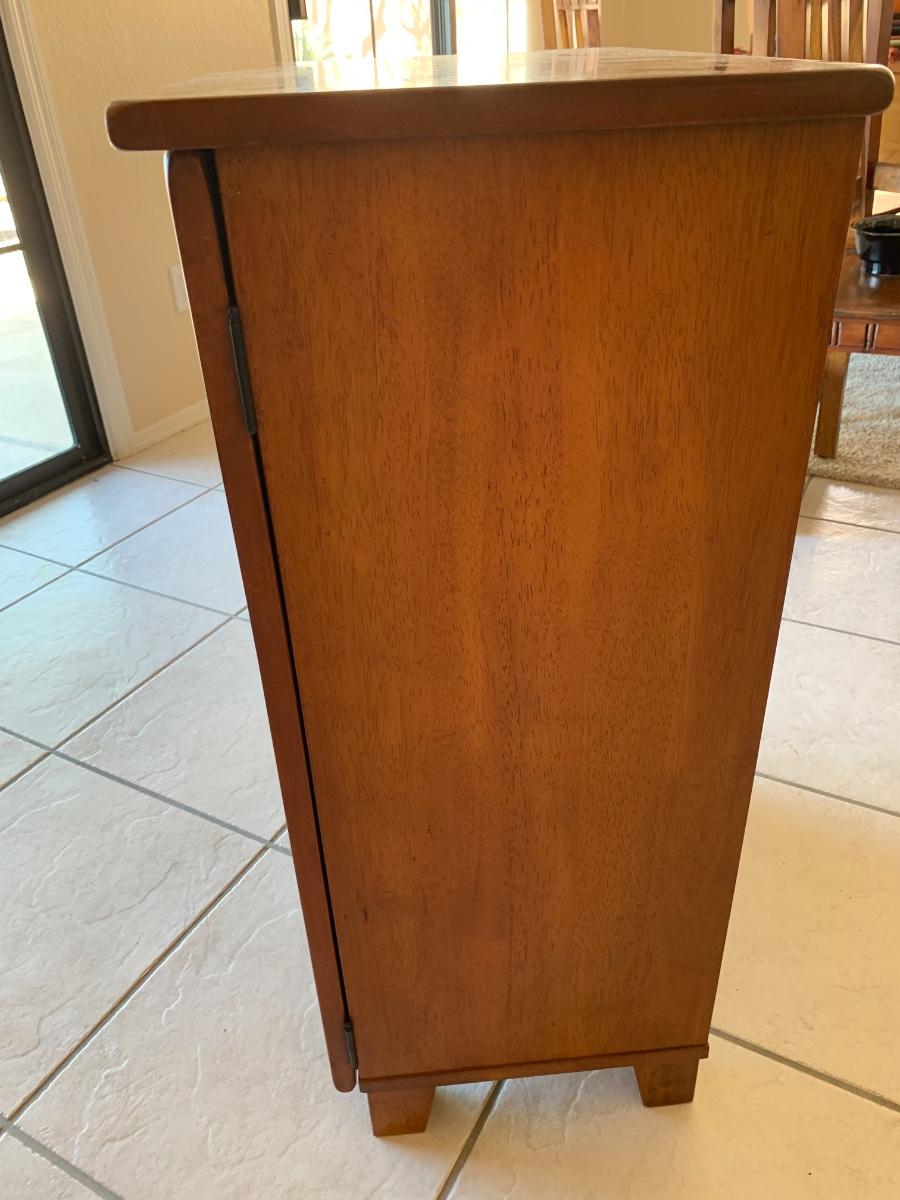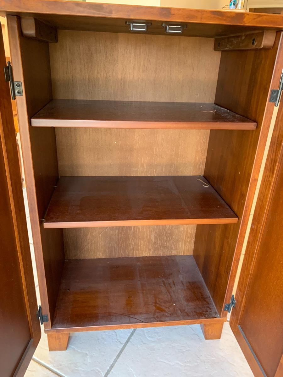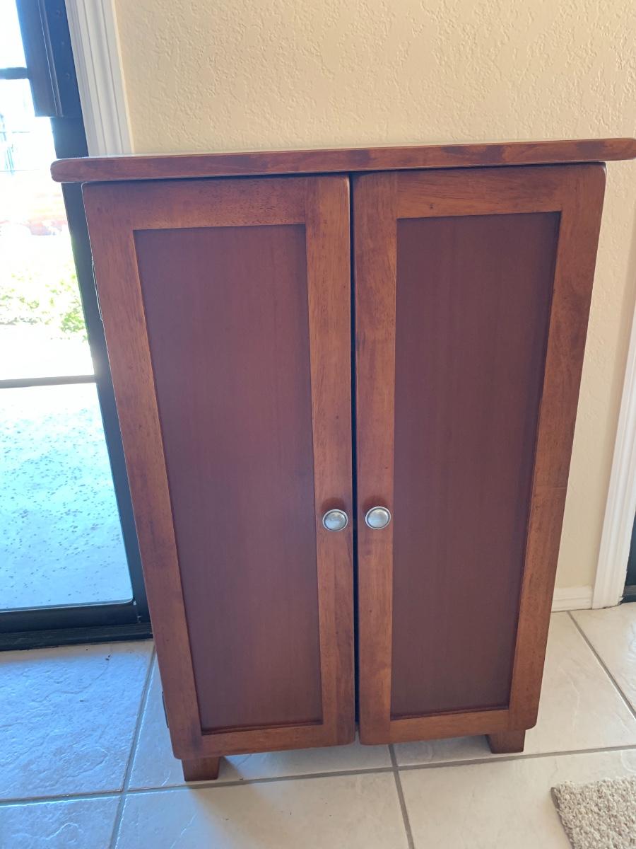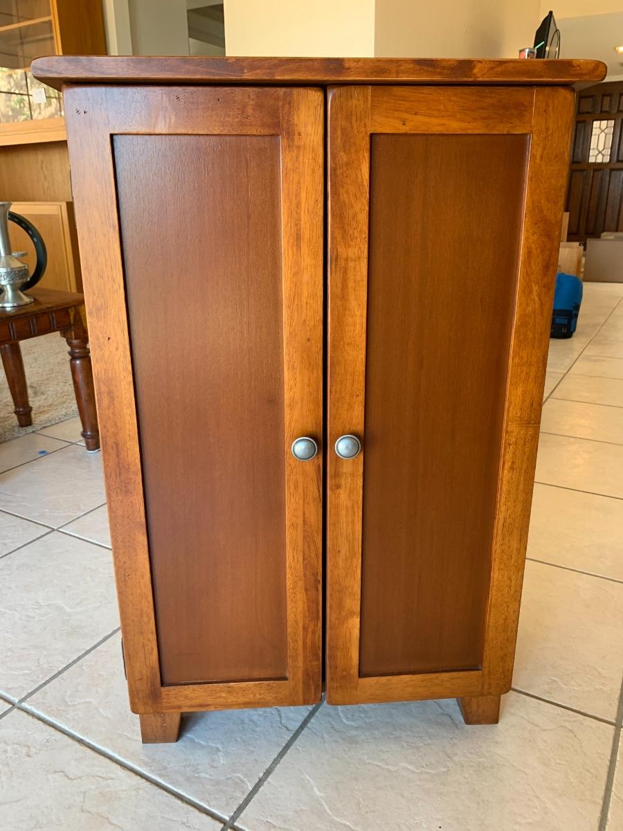 One small hardwood storage cabinet with 3 adjustable shelves, magnetic doors and silver hardware in excellent condition (34 inches in height, 22 inches in width, 14 inches in depth)