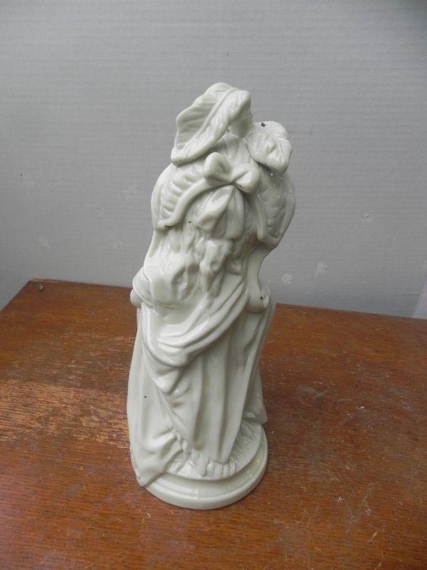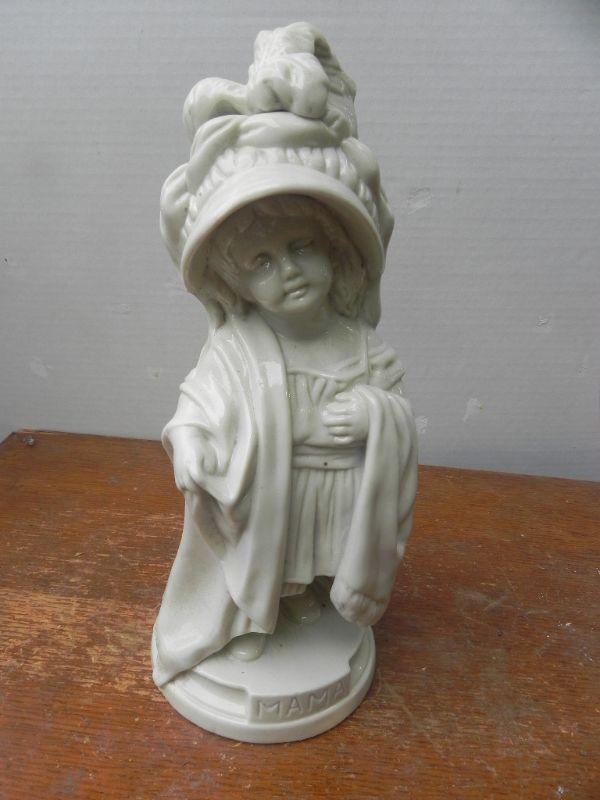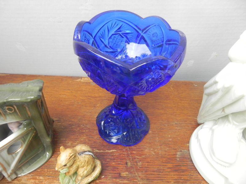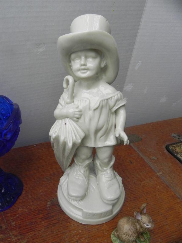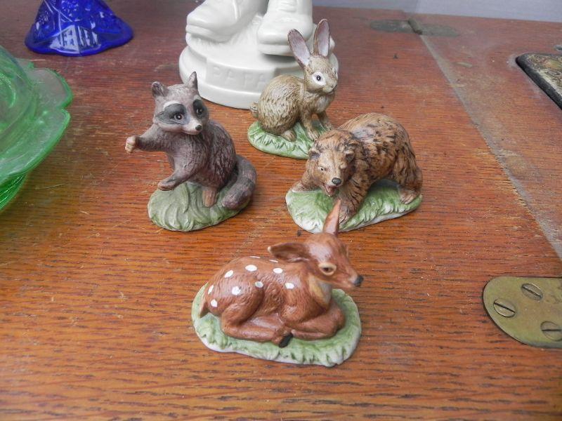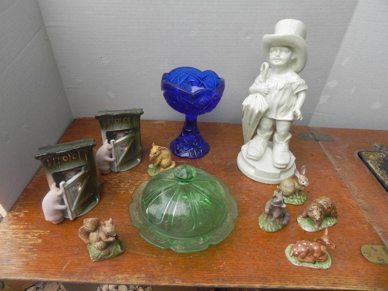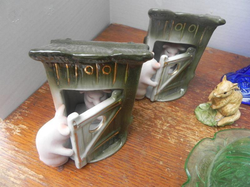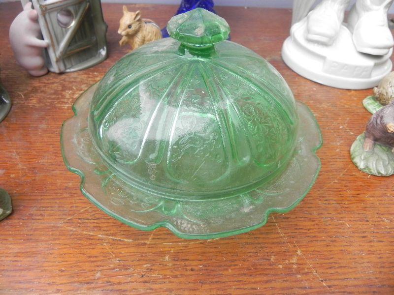 GREEN GLASS BUTTER OR CHEESE DISH W/LID, 2 PORCELAIN PIGS LOOKING INTO OUT HOUSE, BOY AND GIRL FIGURES, OTHER SMALL CERAMIC FIGURINES