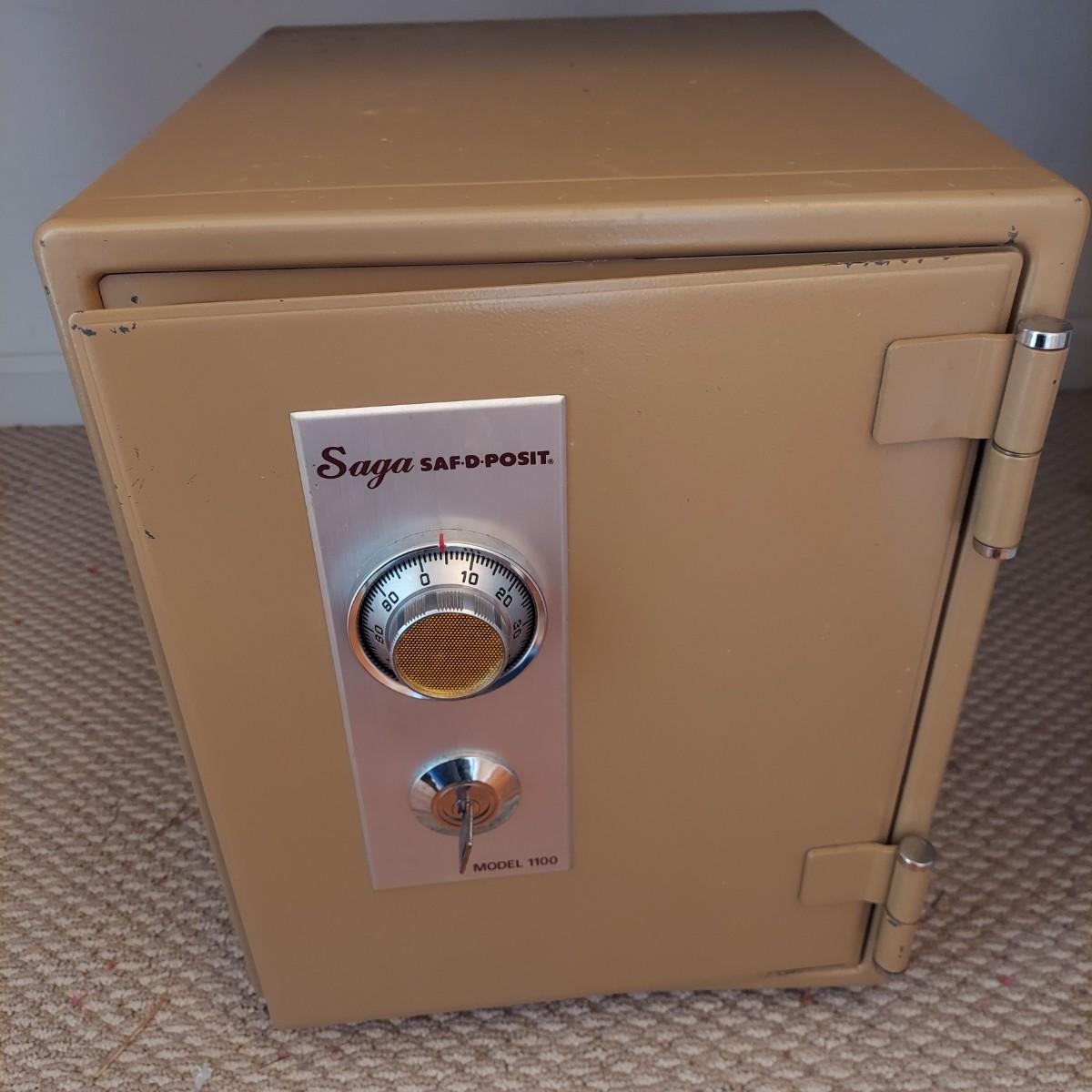Saga Saf-D-Posit safe measures approximately 13” x 15” x 18"H. Includes key and instructions for combination. Please see photos for details. Local Pickup Only.