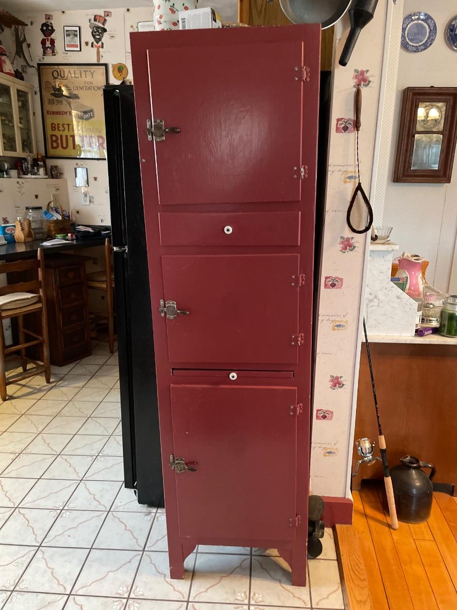 Small vintage/antique red cabinet. Measures 19” wide x 14” deep x 68” tall. Items inside not included. Bring help to carry.