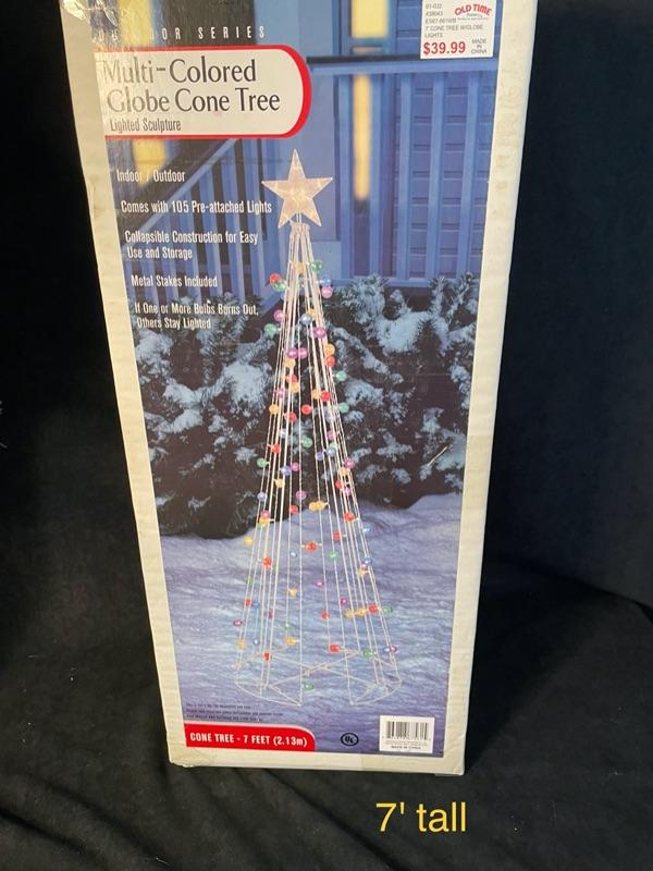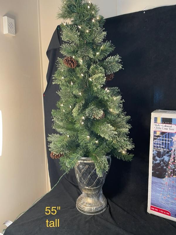 Pre-lit, artificial tree in a pot 55" tall (has original box) and a outdoor lawn decoration 7 ft tall