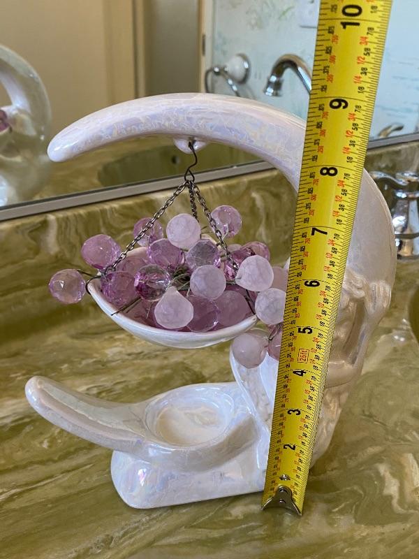 Iridescent angel on the moon oil warmer candle holder. Currently has pale purple grapes in the oil basket. Good condition. About 9" size.