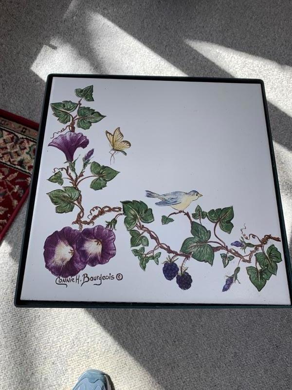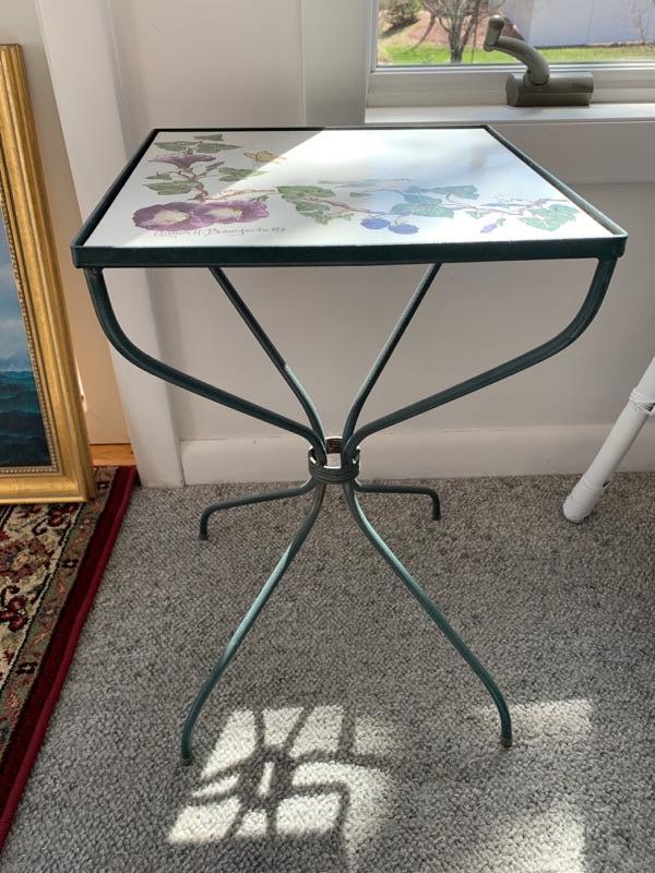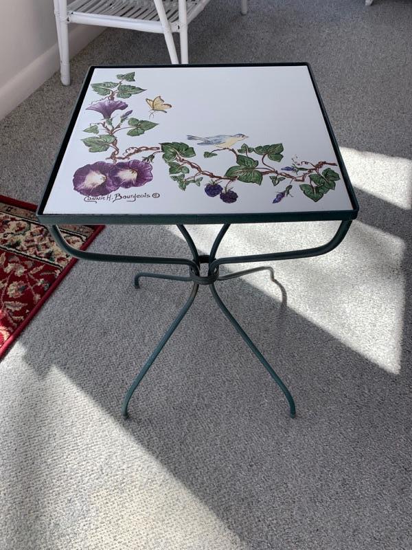 Small iron base paint stand or small side table with hand painted til top