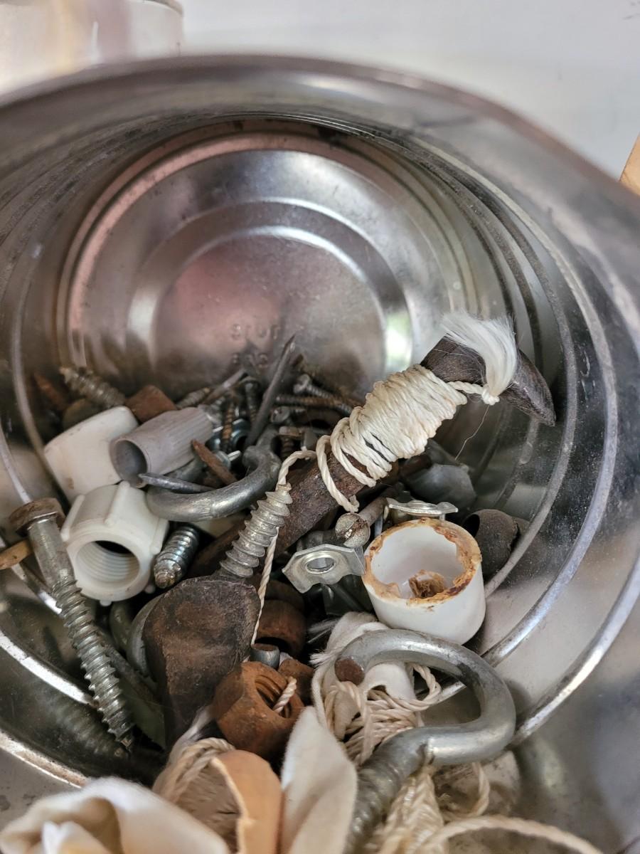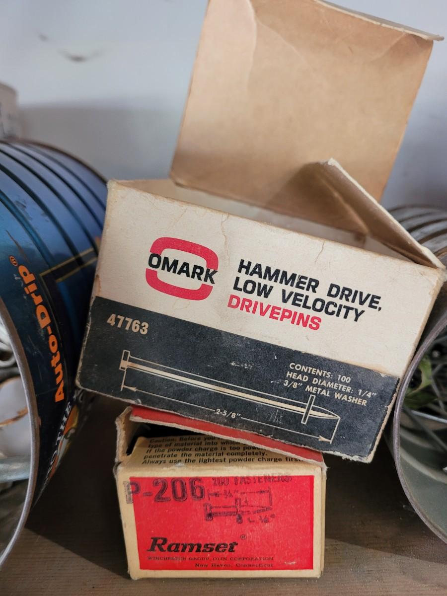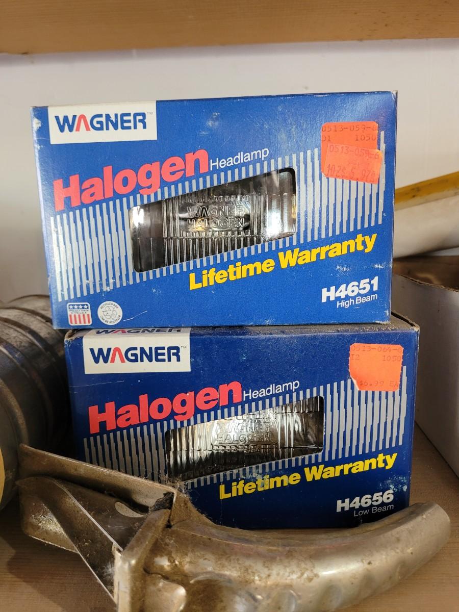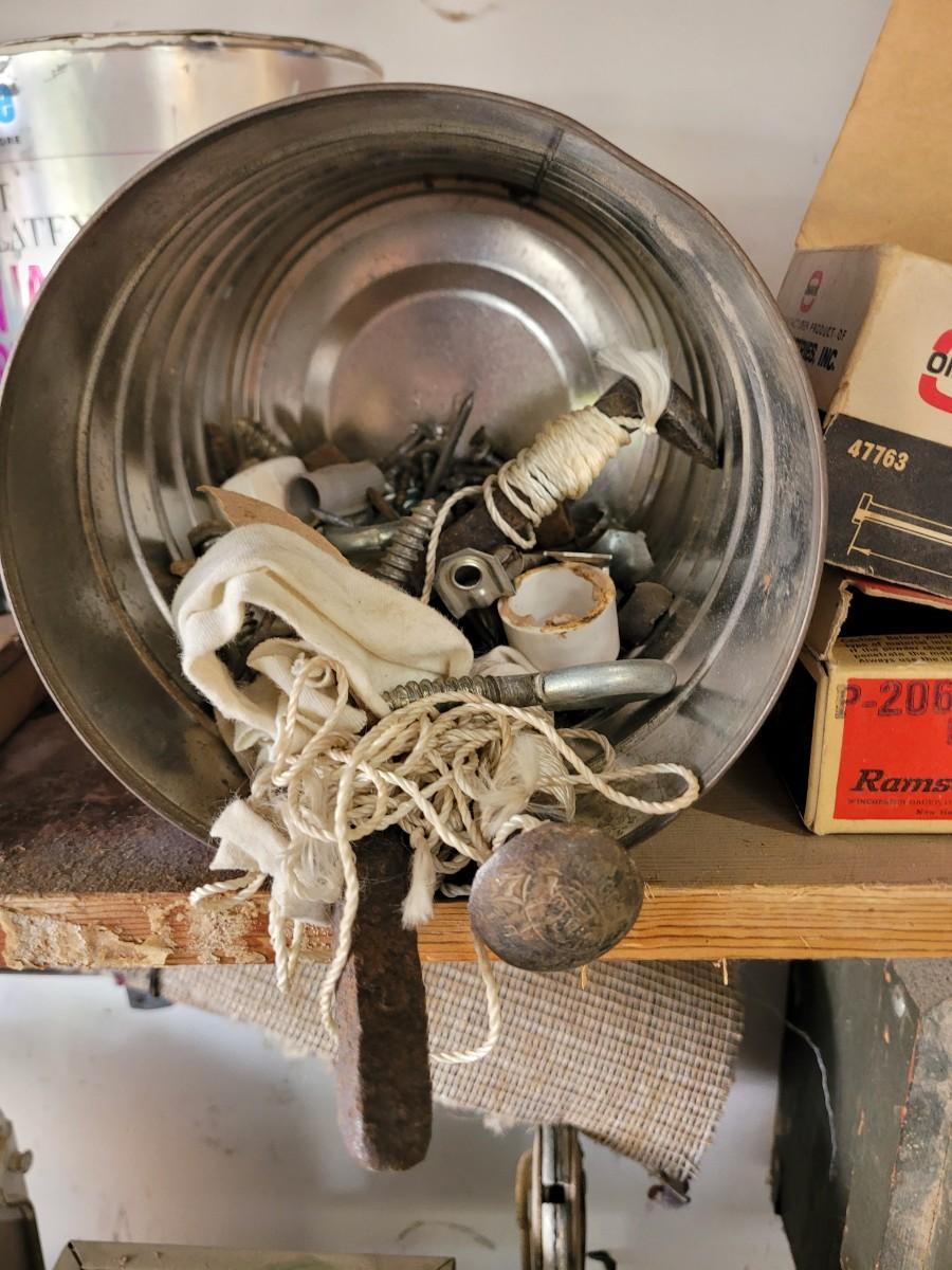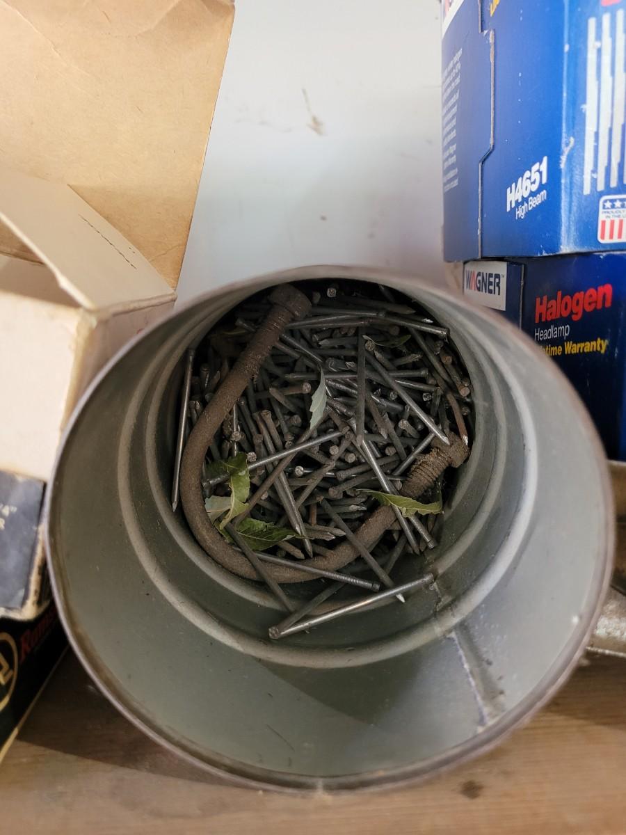 2 new halogen headlights old school oil can spout.Can of Brad's partial boxes?Of ramset nails both are less than half full, can of bolts and fasteners.