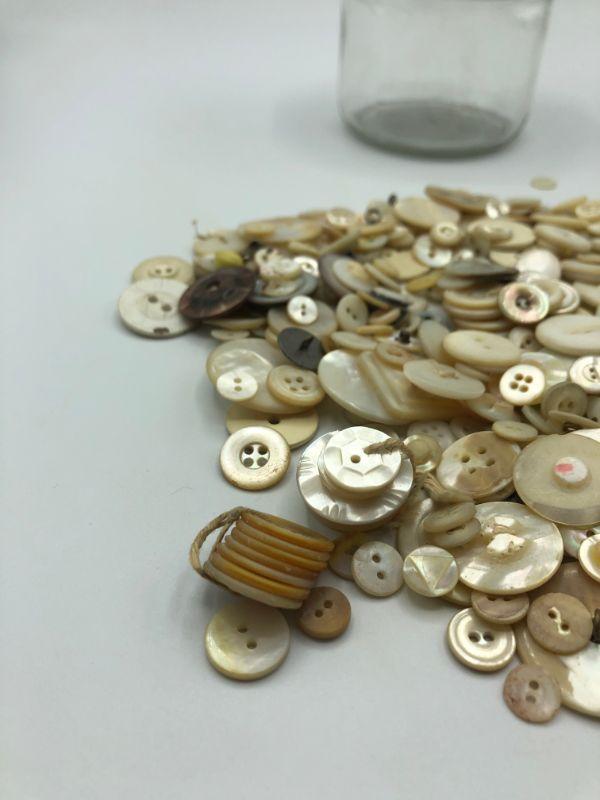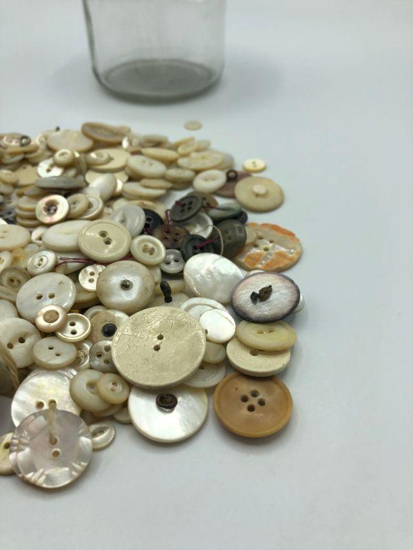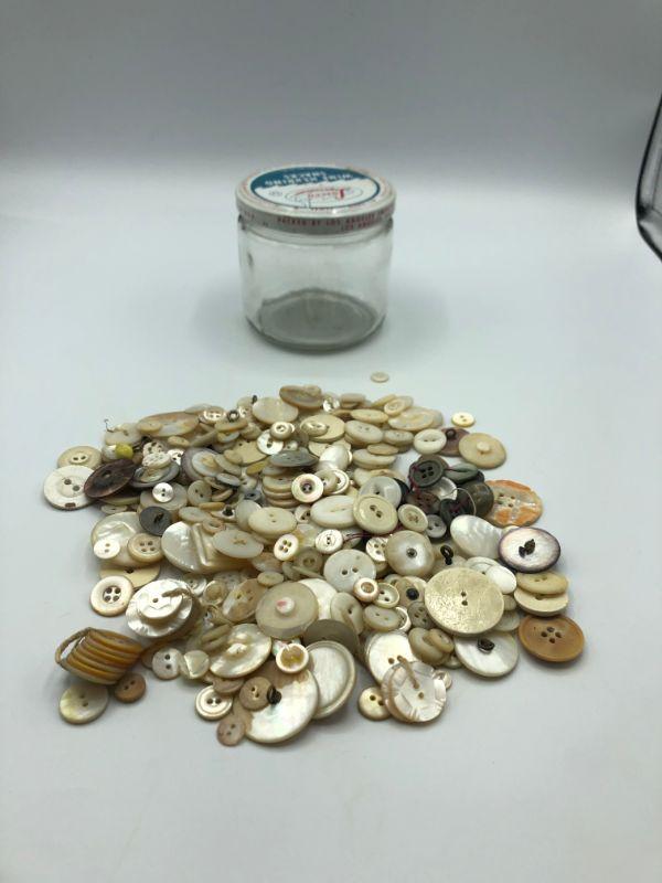 Small jar of vintage buttons. Various shades of white. Jar is 3" tall and 3" wide. It is almost all the full.