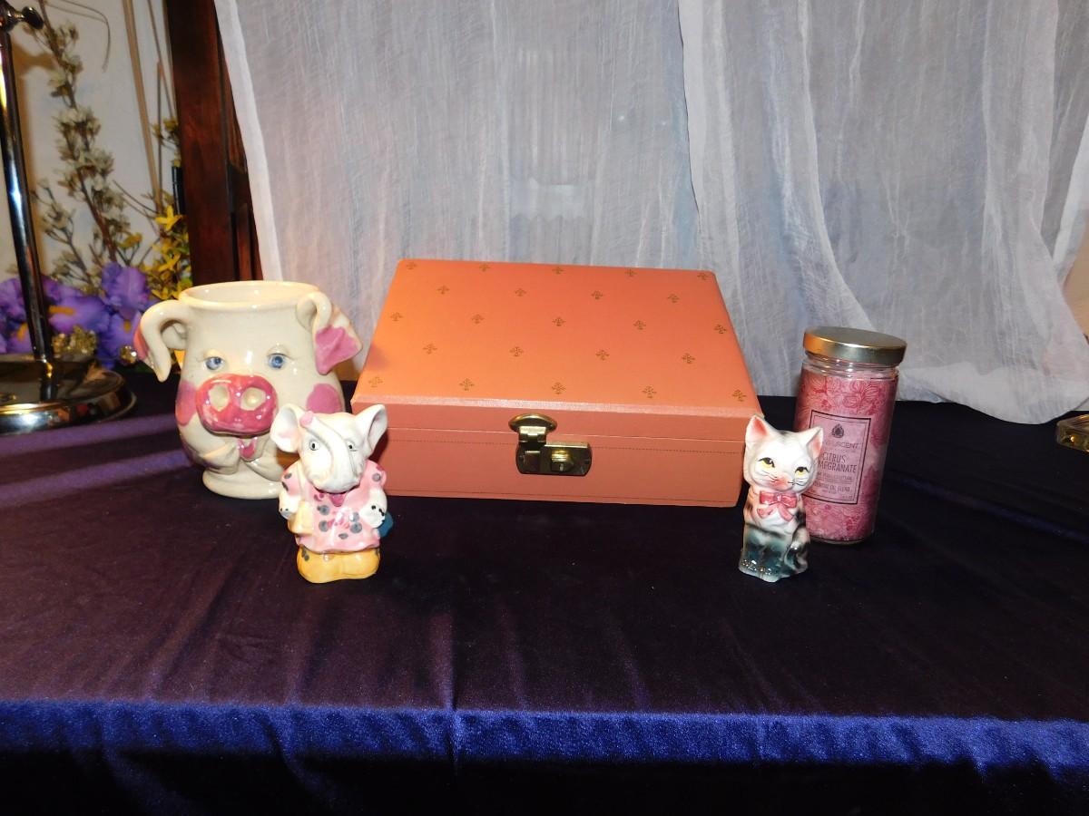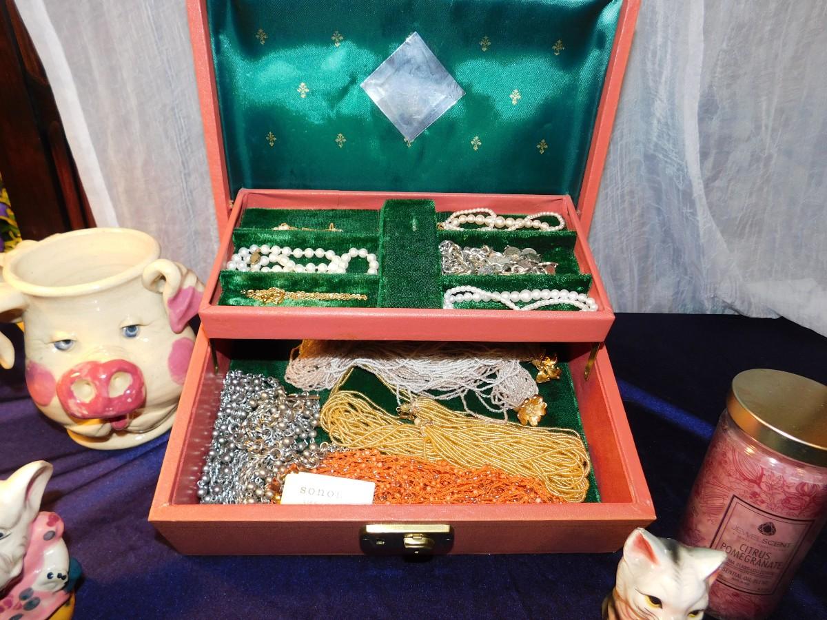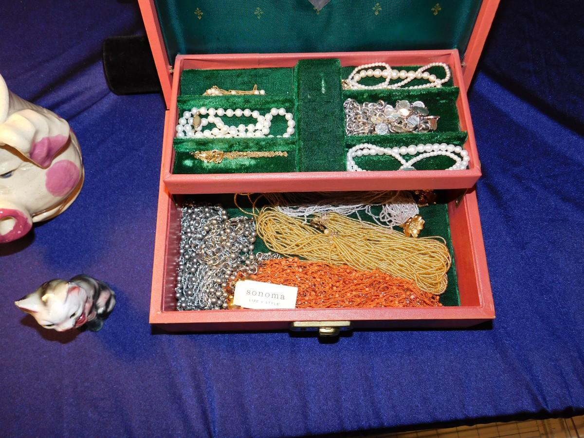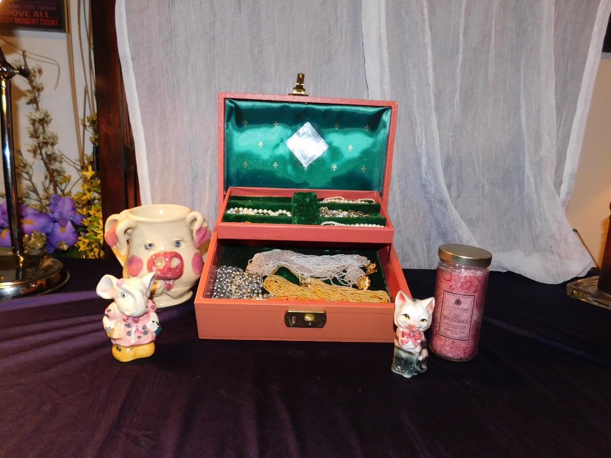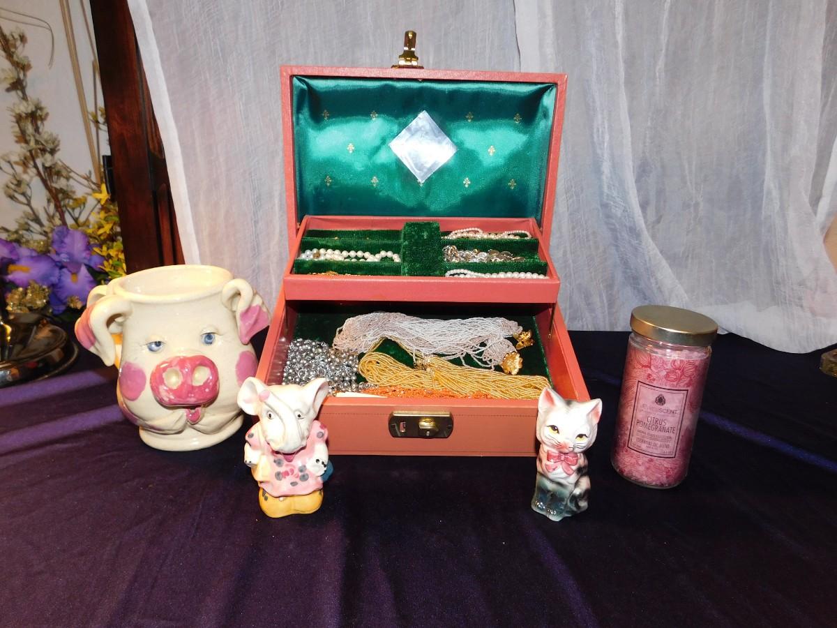 SMALL JEWELRY BOX LOADED WITH COSTUME JEWELRY, FUNNY PIG MUG, PRETTY ELEPHANT, AND MORE