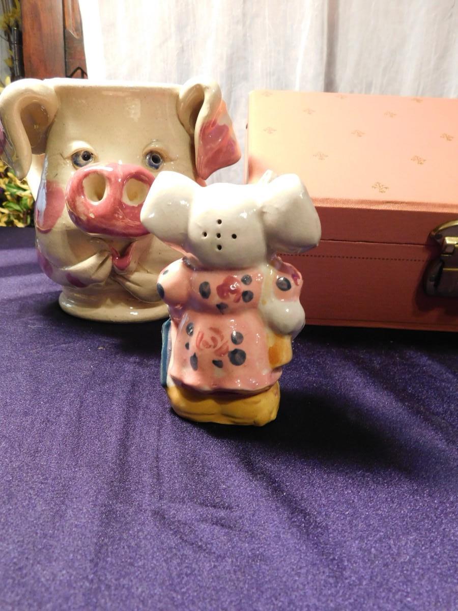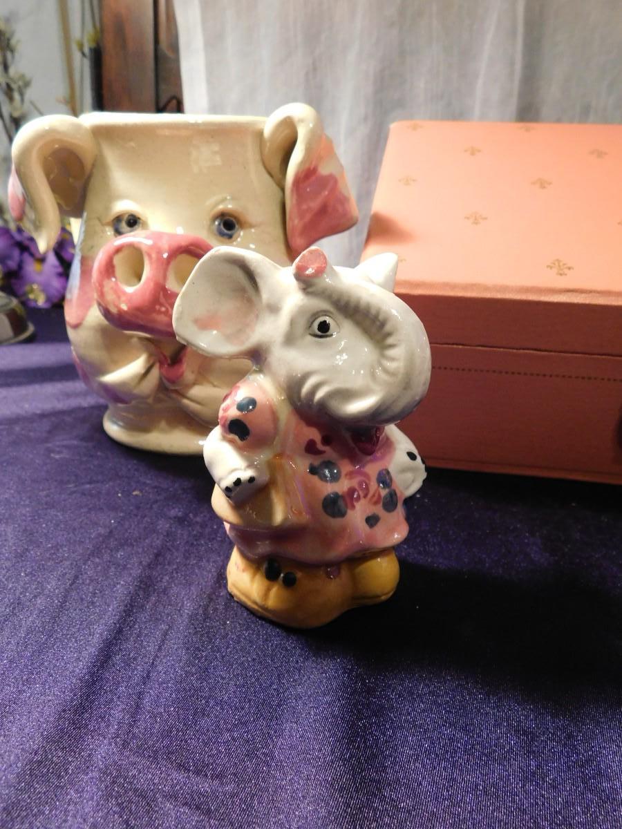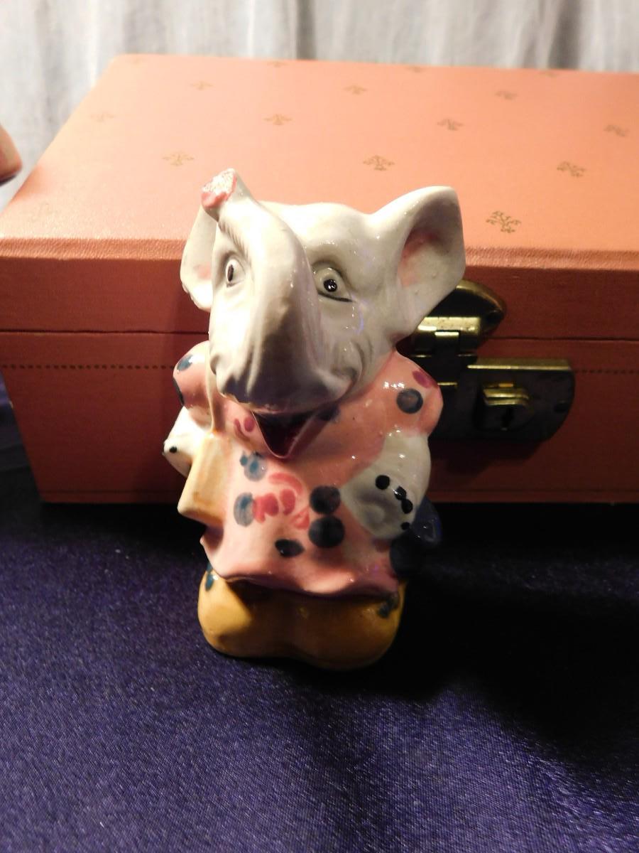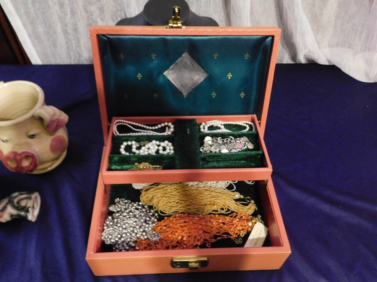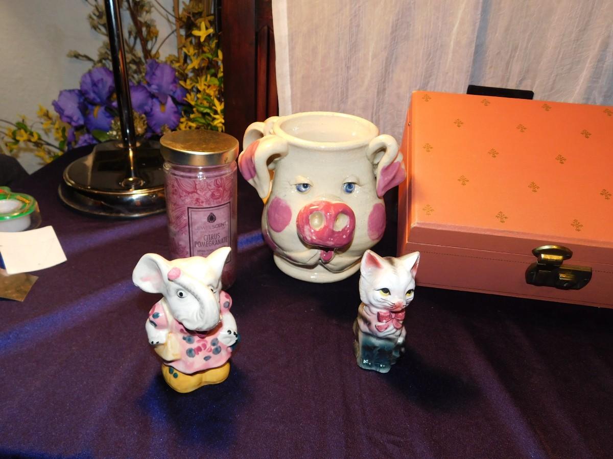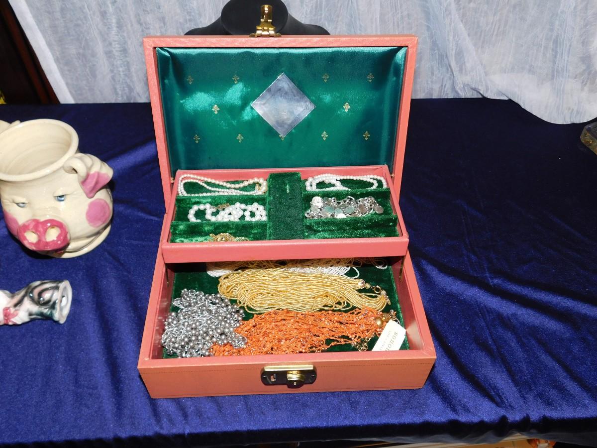 SMALL JEWELRY BOX LOADED WITH COSTUME JEWELRY, FUNNY PIG MUG, PRETTY ELEPHANT, AND MORE