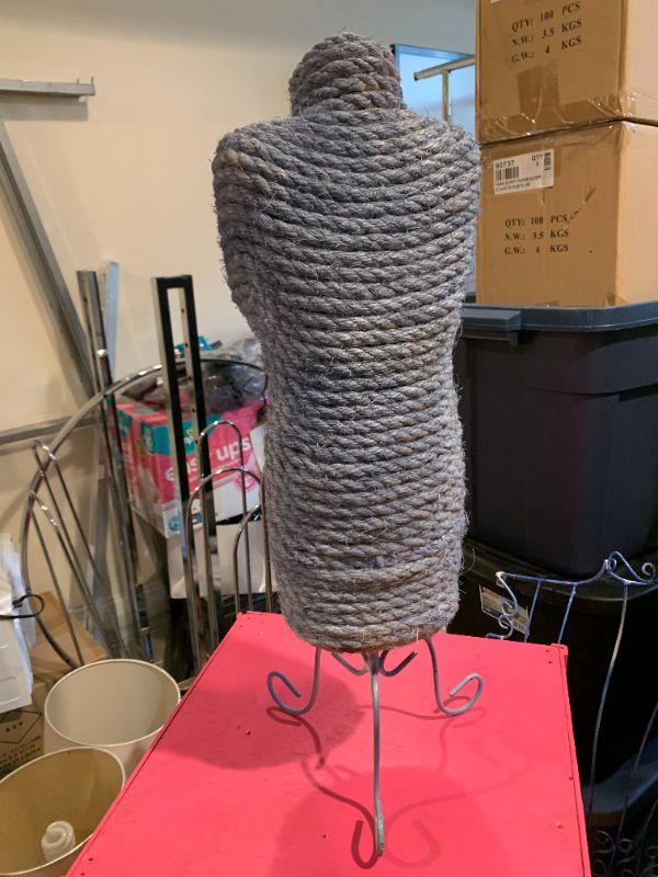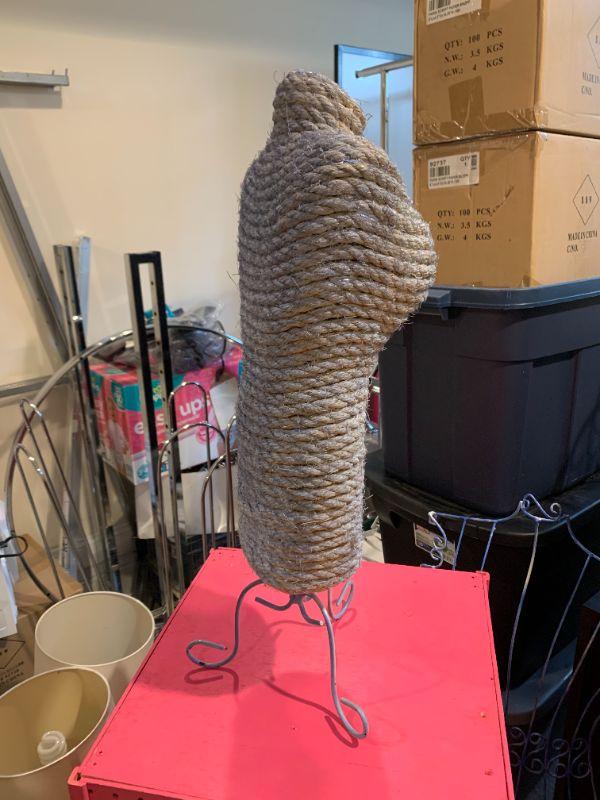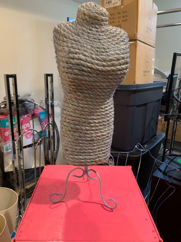 Small self-standing countertop dress form made of ropes, best for displaying jewelry.
