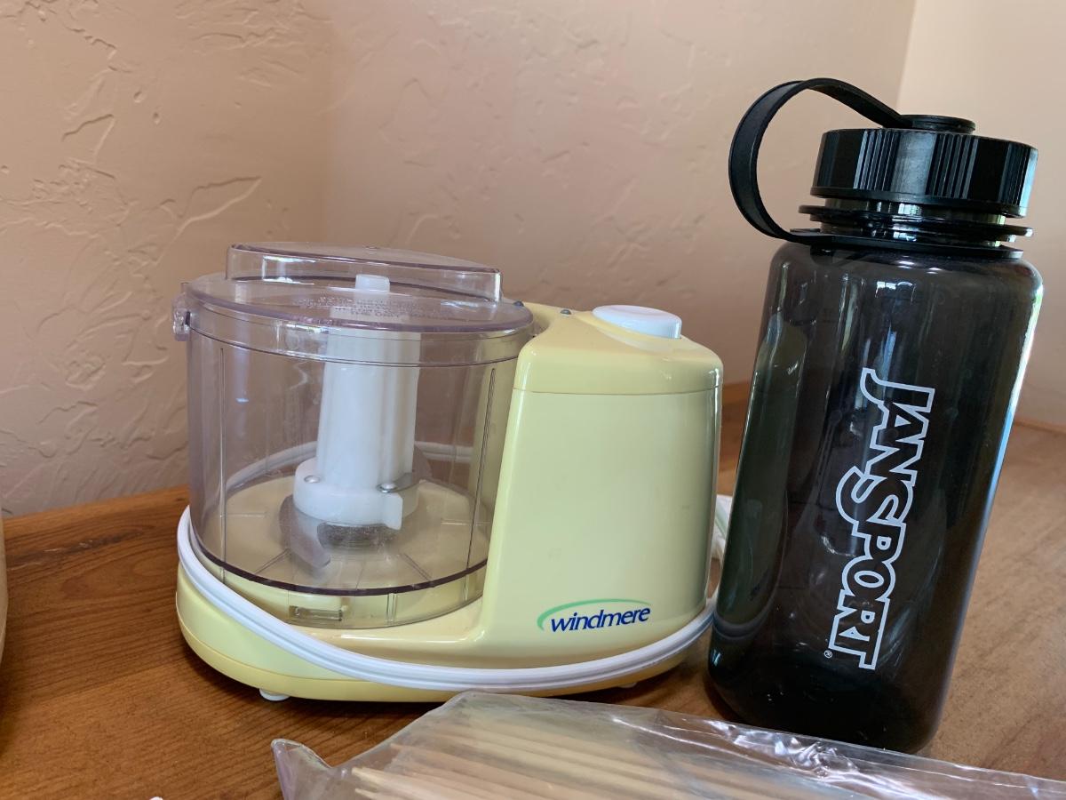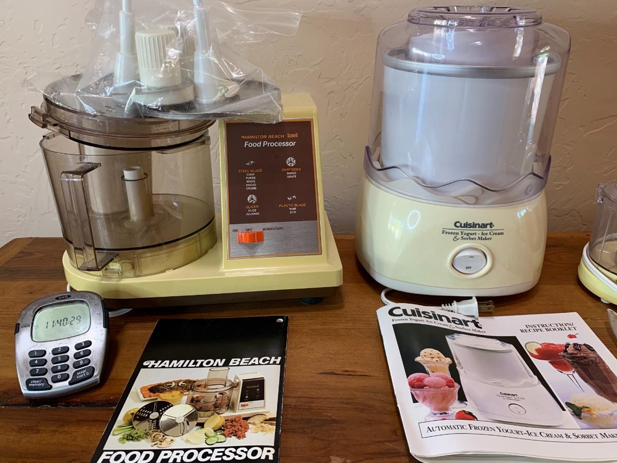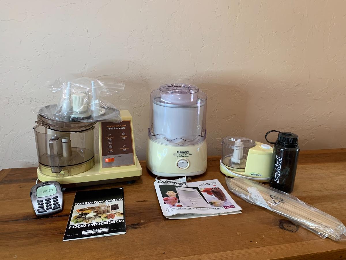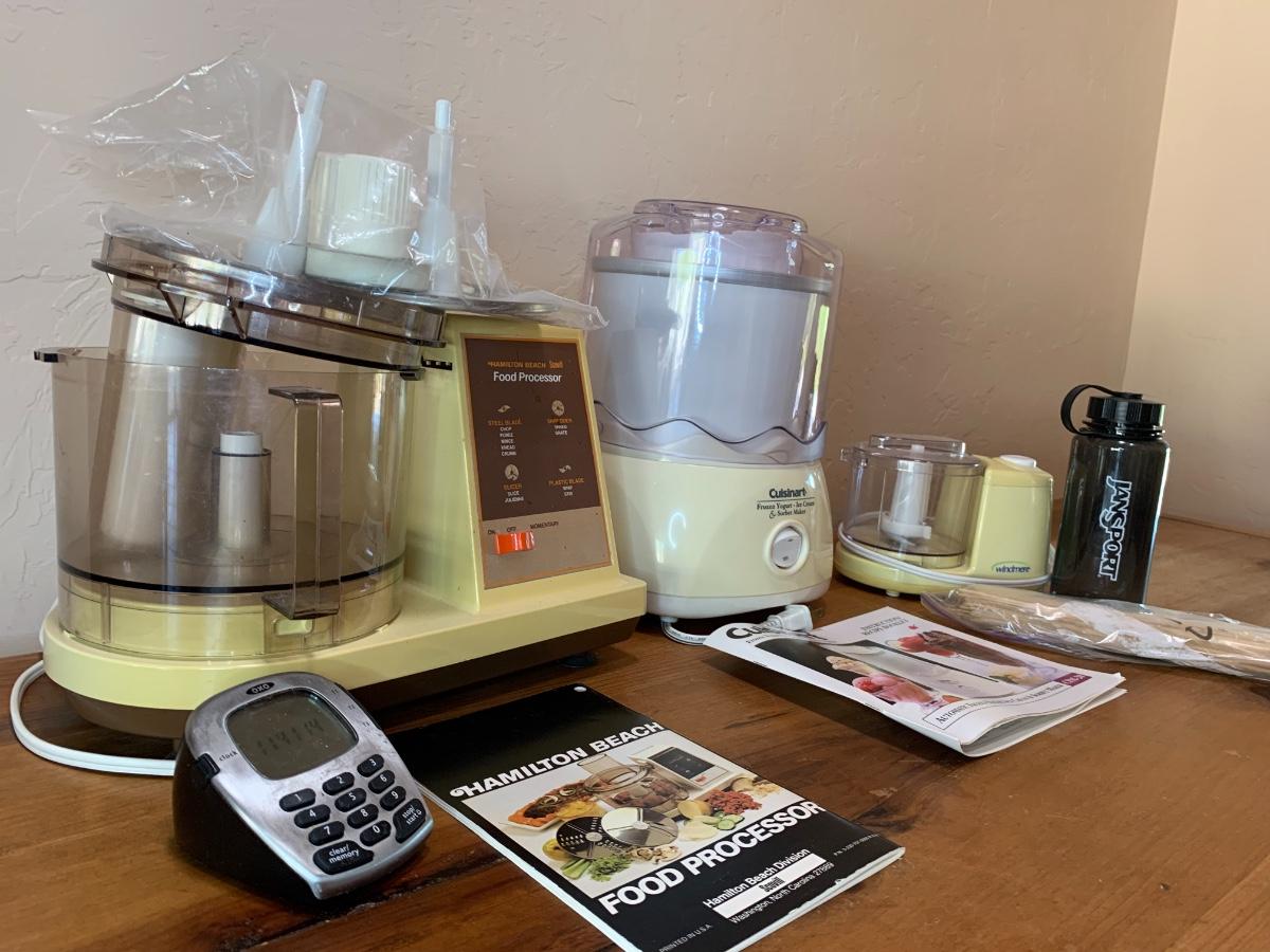 Hamilton beach food processors, cuisine art frozen yogurt and ice cream maker, windmere miniature food processor, jansport water bottle, timer and skewers