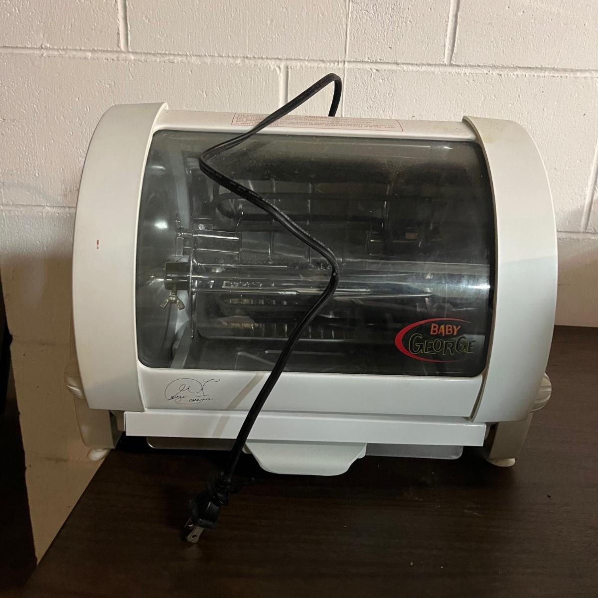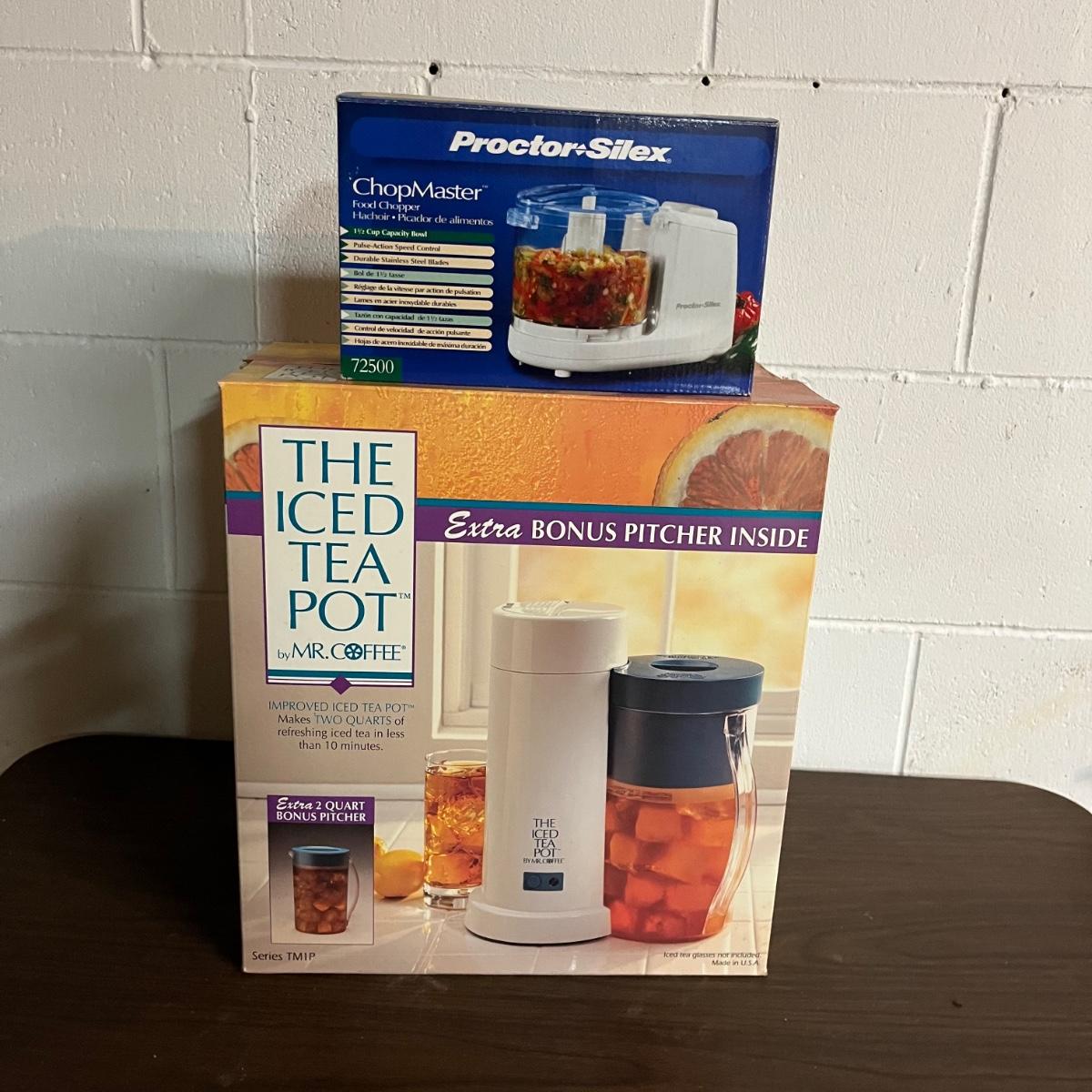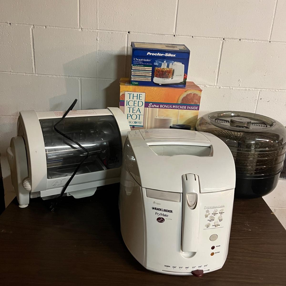 Lot includes Black and Decker FryMate, dehydrator, Baby George Rotisserie, Mr Coffee Ice Tea Pot and a Proctor Silex Chop Master. Teapot and Chop Master are NIB and everything else powered on when tested except dehydrator has no light to see if it is on.