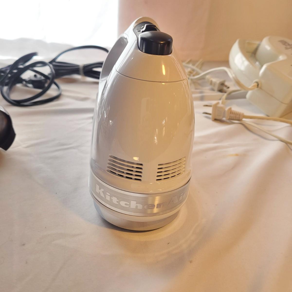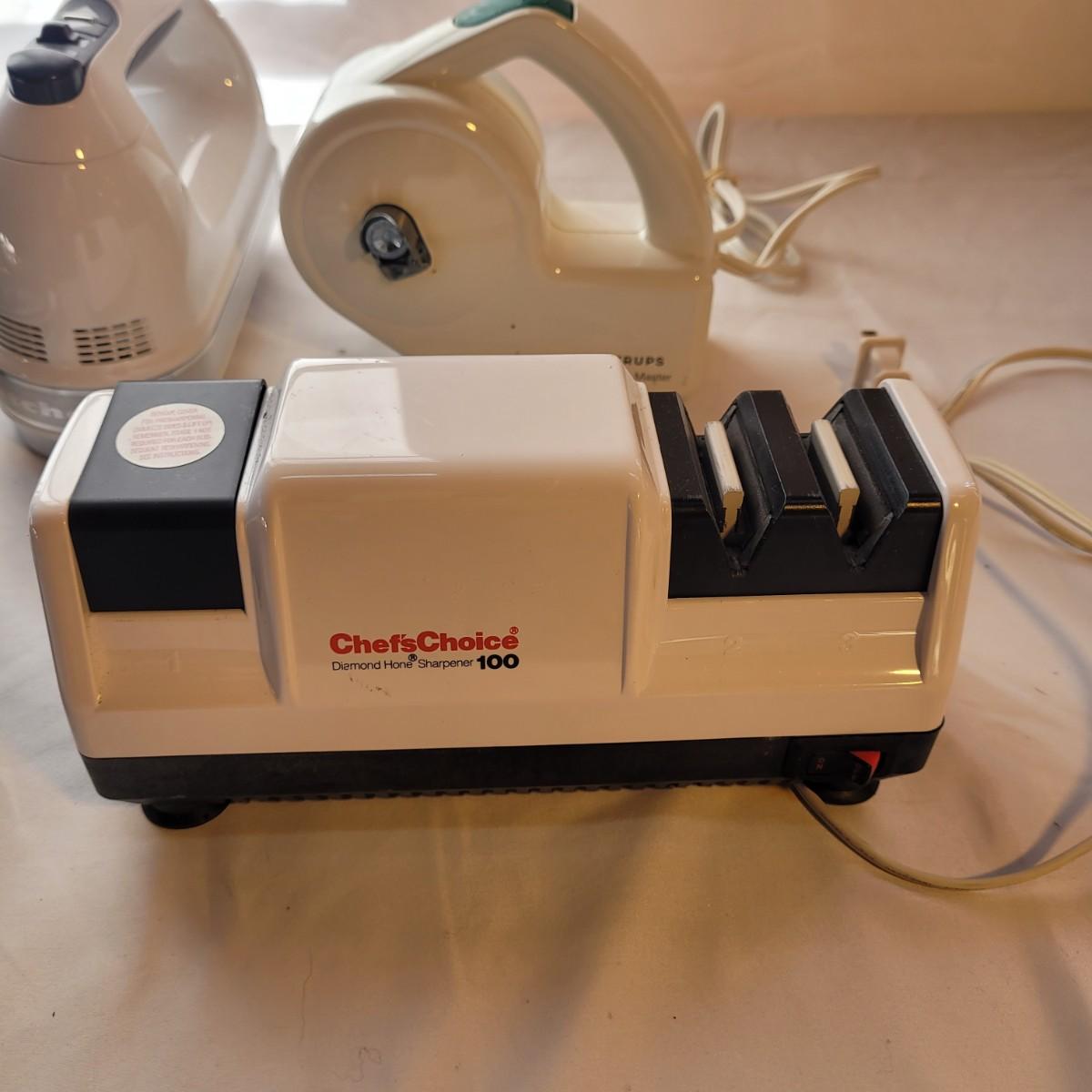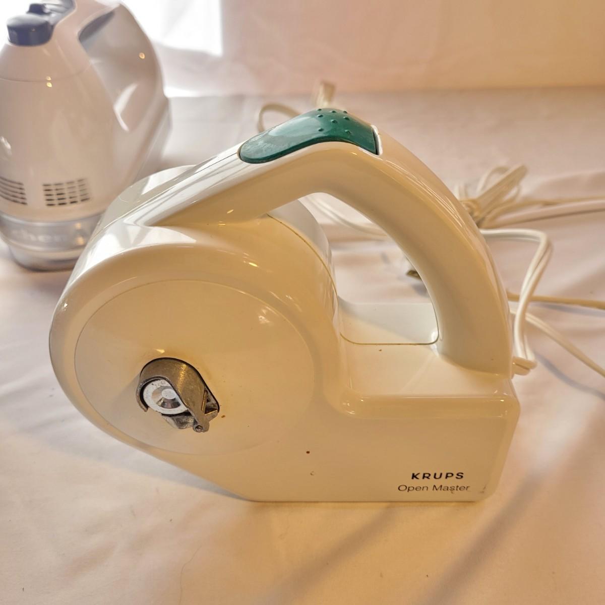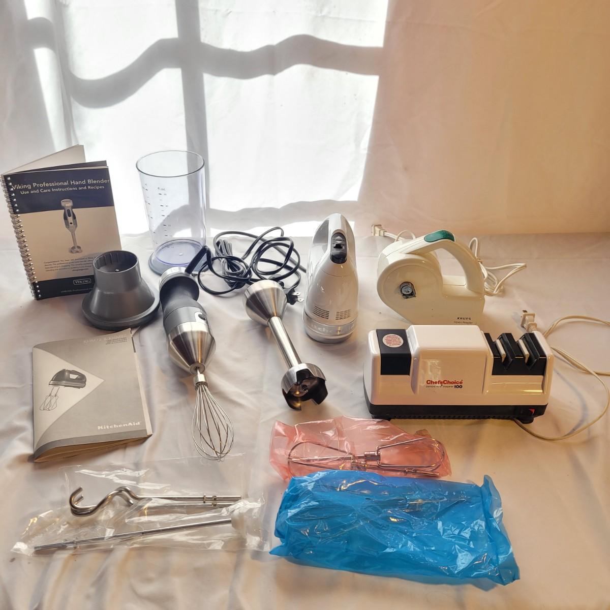 A great collection of handheld kitchen appliances and accessories, including a Viking hand blender, KitchenAid hand mixer, Krups can opener, and Chef’s Choice diamond hone knife sharpener. All items powered on when plugged in. Knife sharpener measures 3.5” x 9” x 4”H. Shipping available.