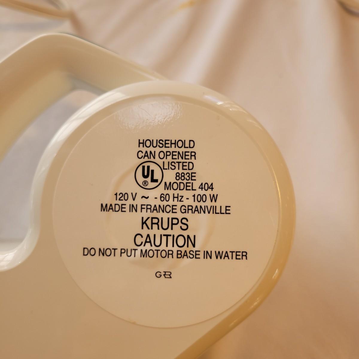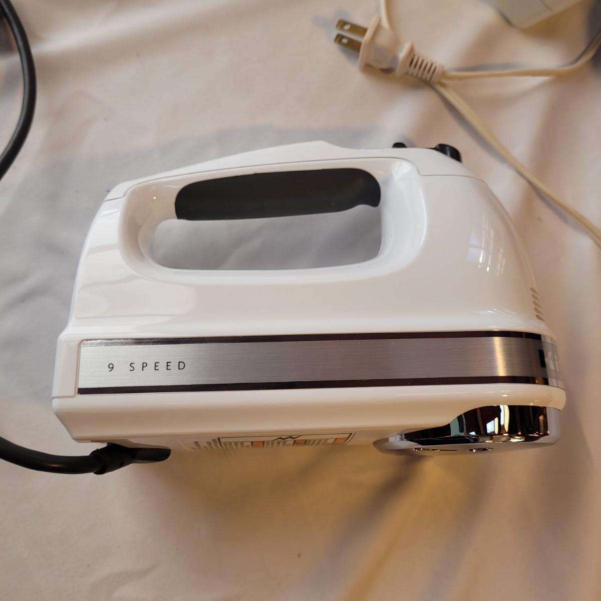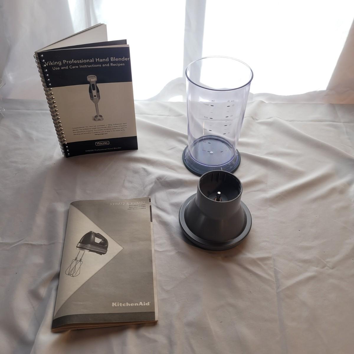 A great collection of handheld kitchen appliances and accessories, including a Viking hand blender, KitchenAid hand mixer, Krups can opener, and Chef’s Choice diamond hone knife sharpener. All items powered on when plugged in. Knife sharpener measures 3.5” x 9” x 4”H. Shipping available.
