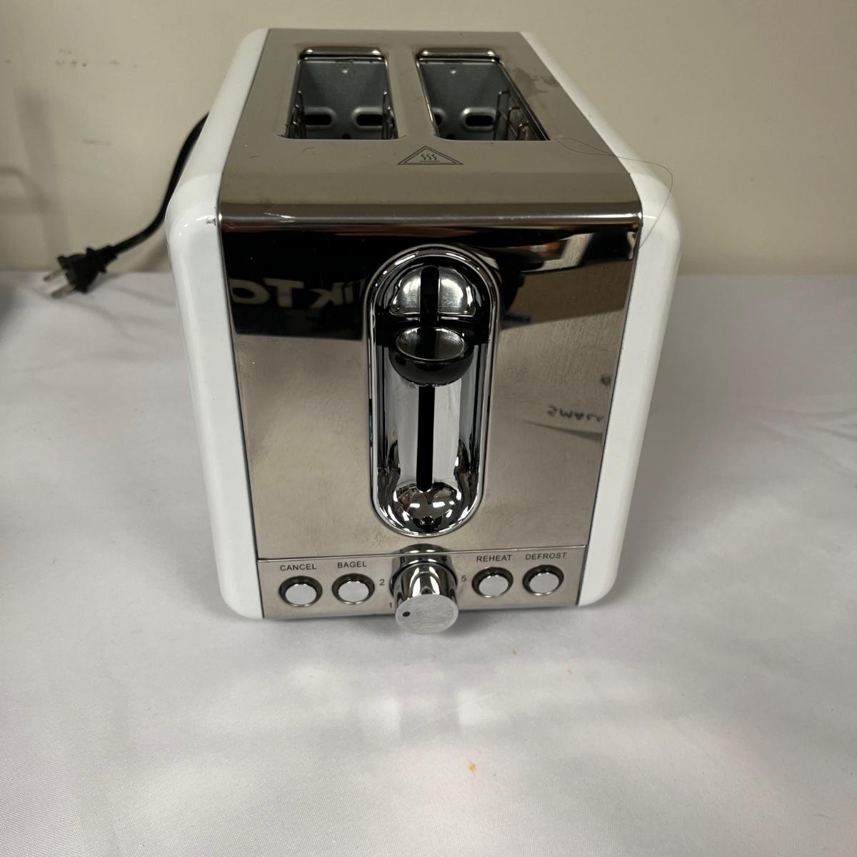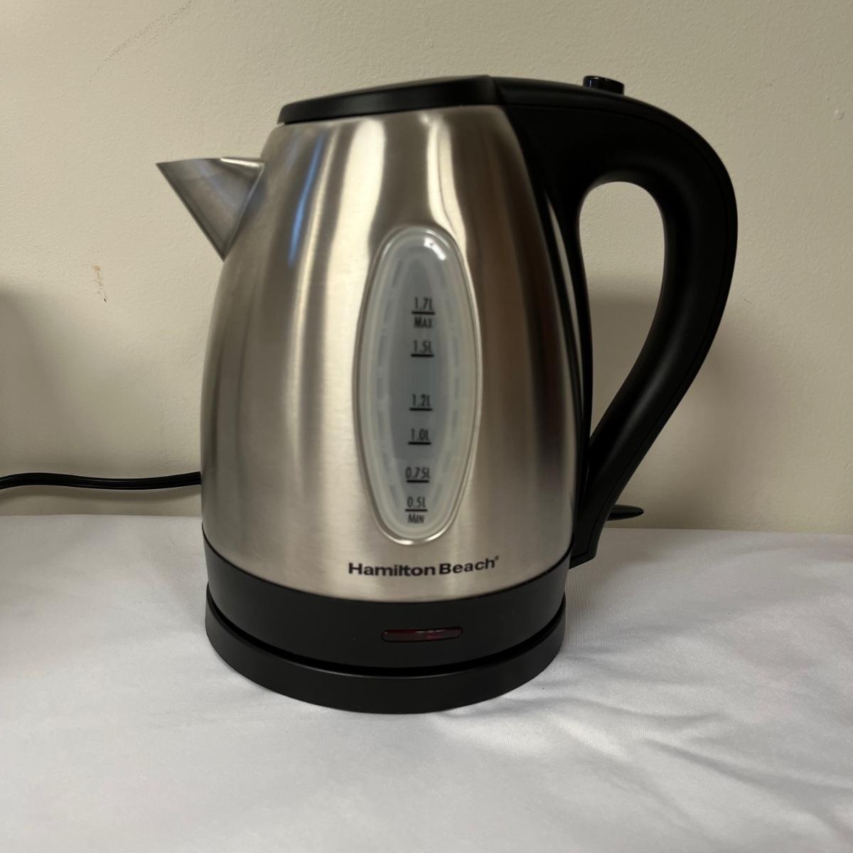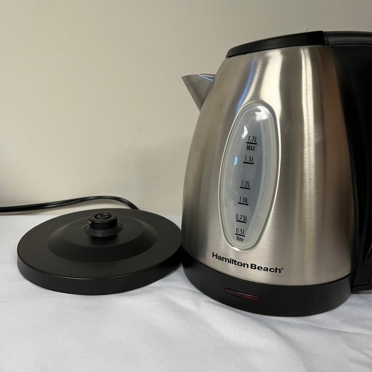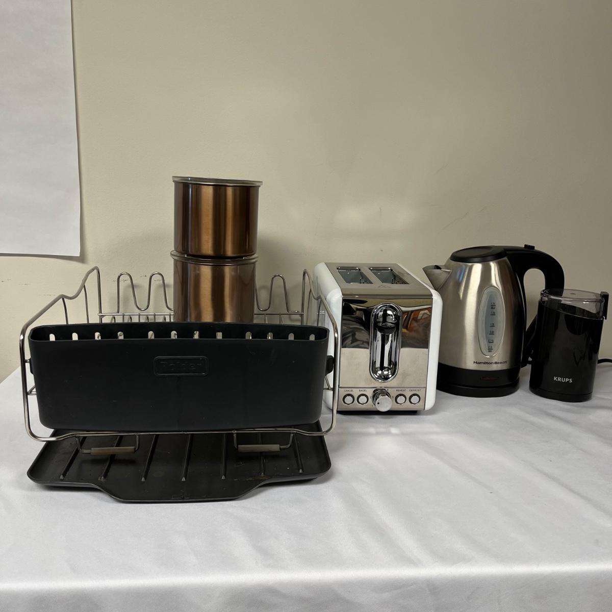 Lot contains a Hamilton Beach cordless kettle, Krups coffee grinder, Fortune Candy toaster, two Airscape containers and a Polder dish drainer and tray. All three electrical items powered on when tested.