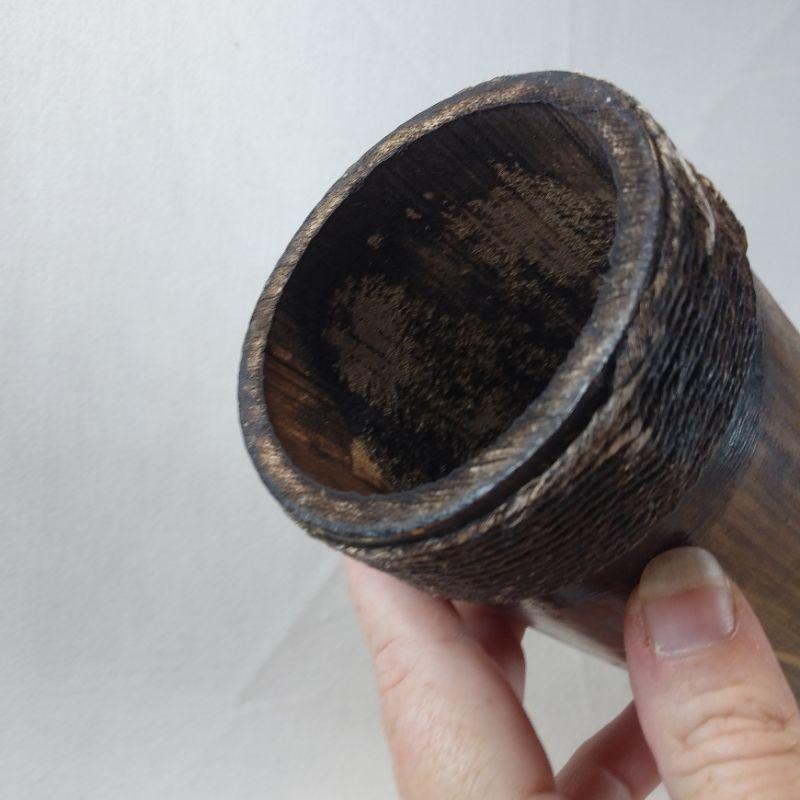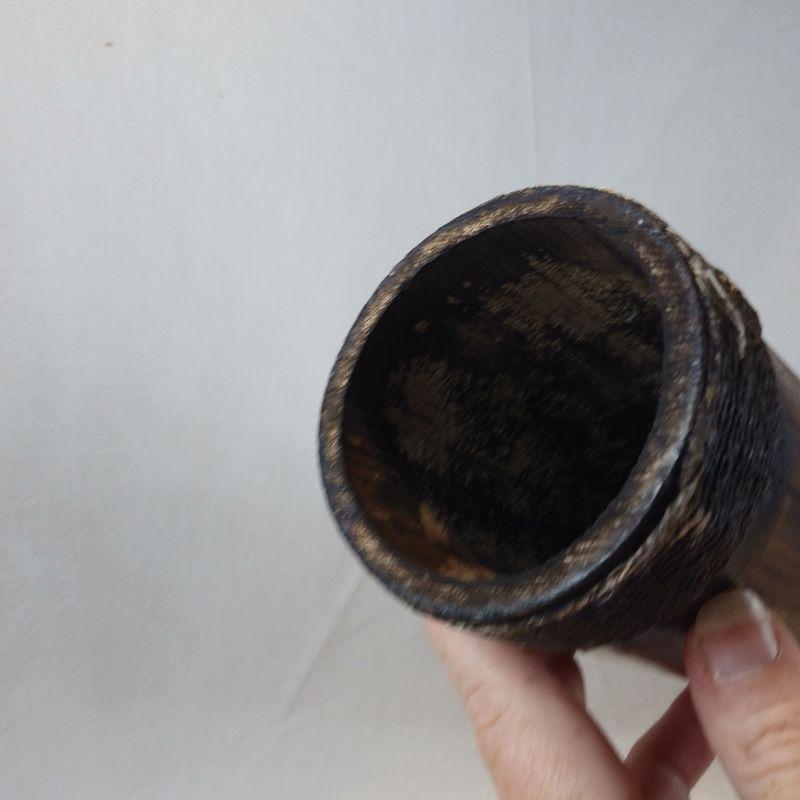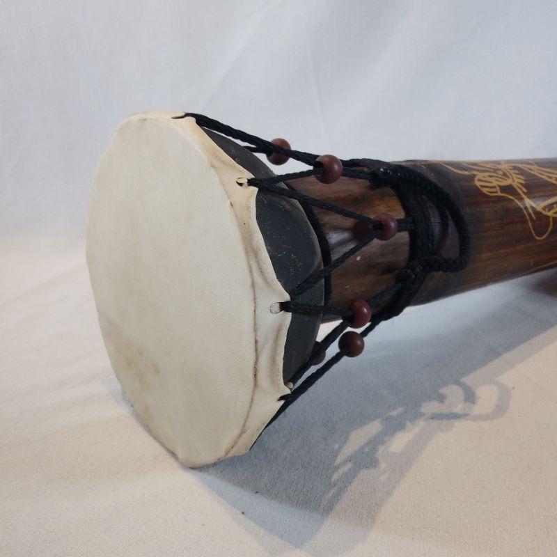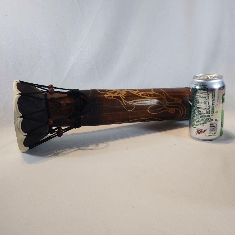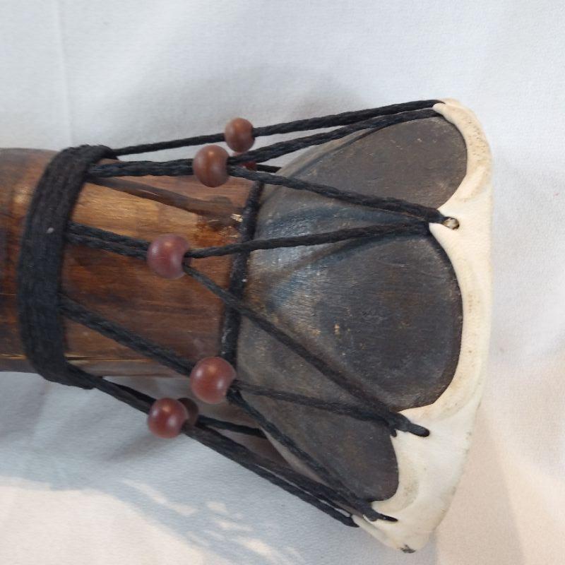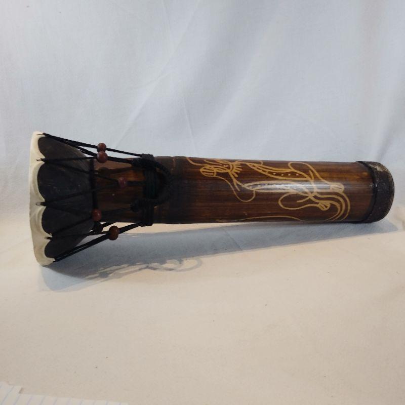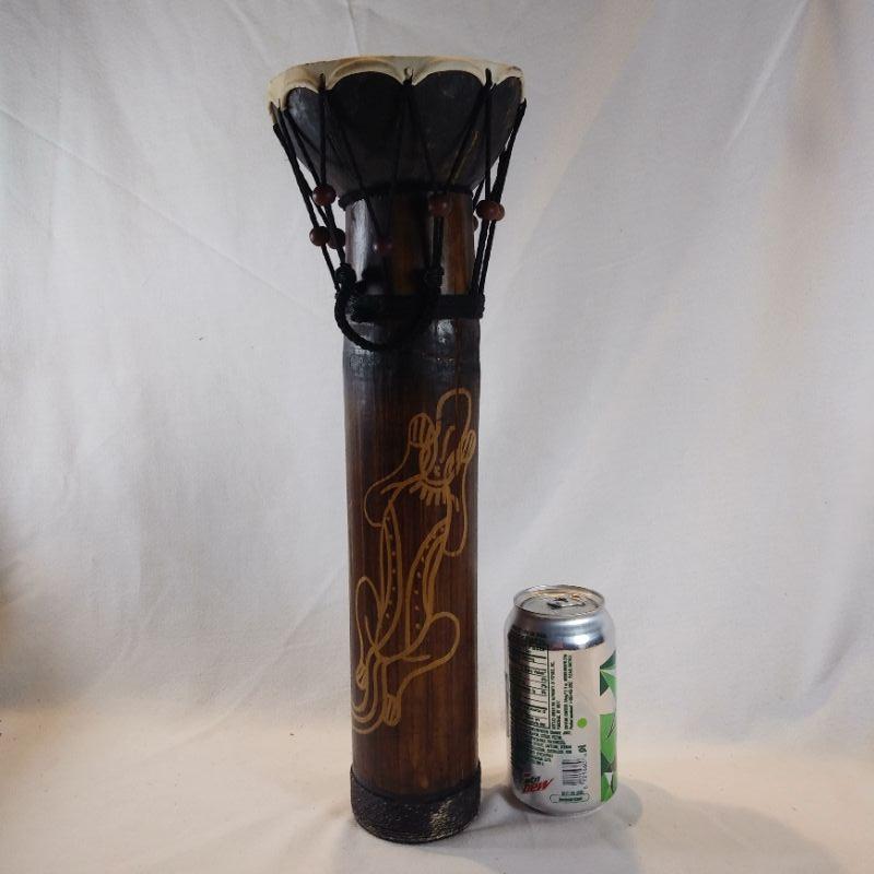 Lap drum is made out of a large diameter bamboo shoot section with a "skin" drum. Some splitting of the bamboo but consistent with age. All of it is intact. Brought back to Louisville by our client who lived in Singapore years ago. It is 16 1/2-inches tall X 5 1/2-inches long.