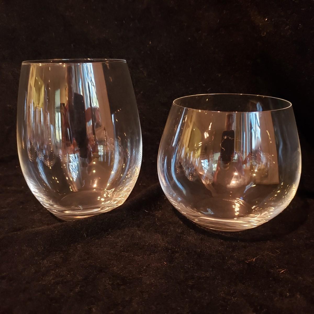 This Riedel wine glass lot contains eight large glasses and five smaller glasses. The large glass measures 3" x 4.5" H. They appear to be blemish free.
