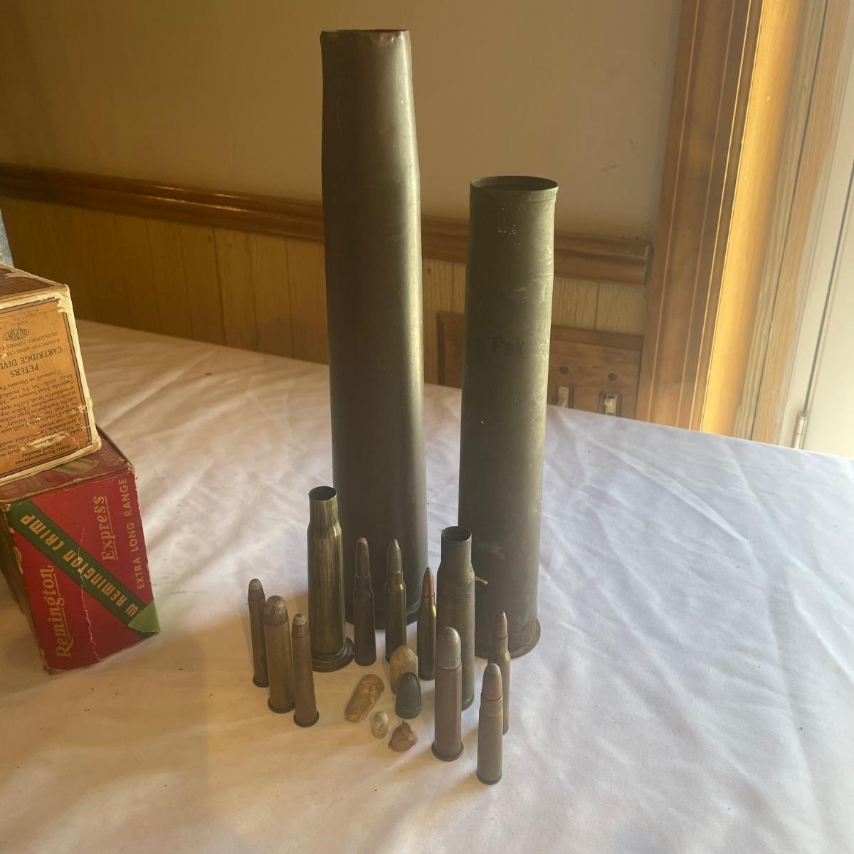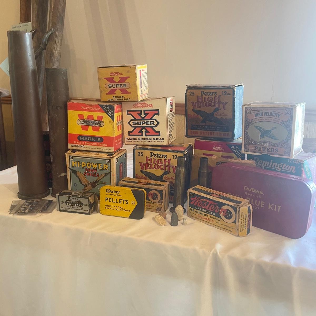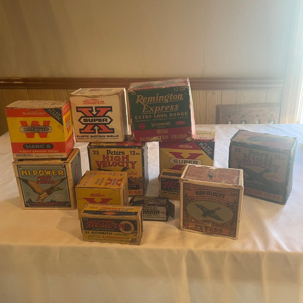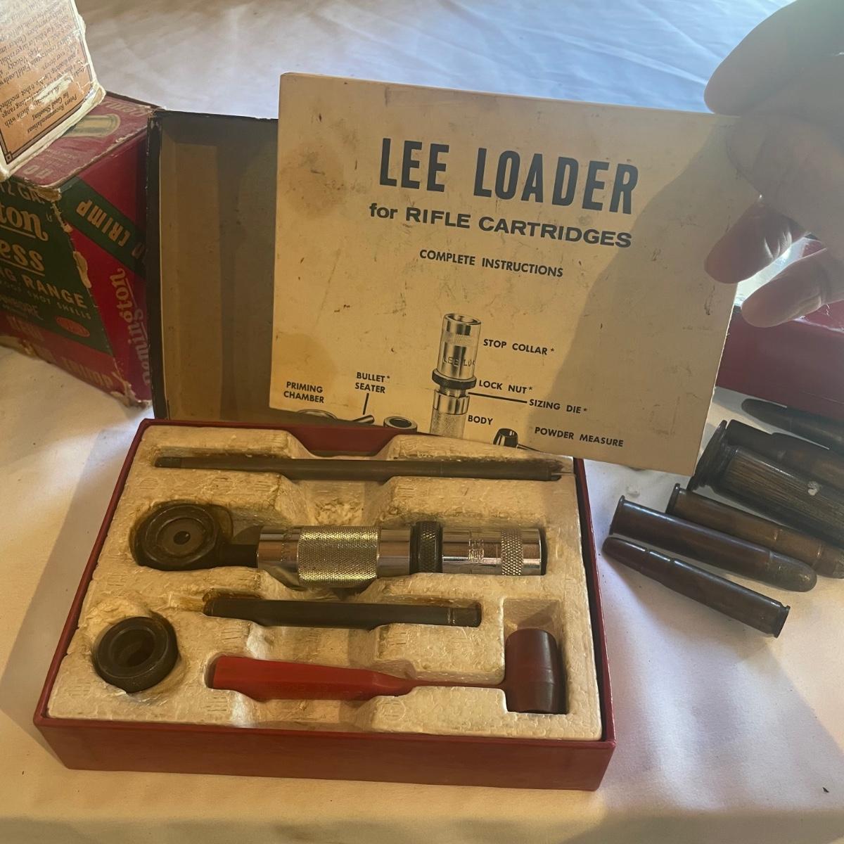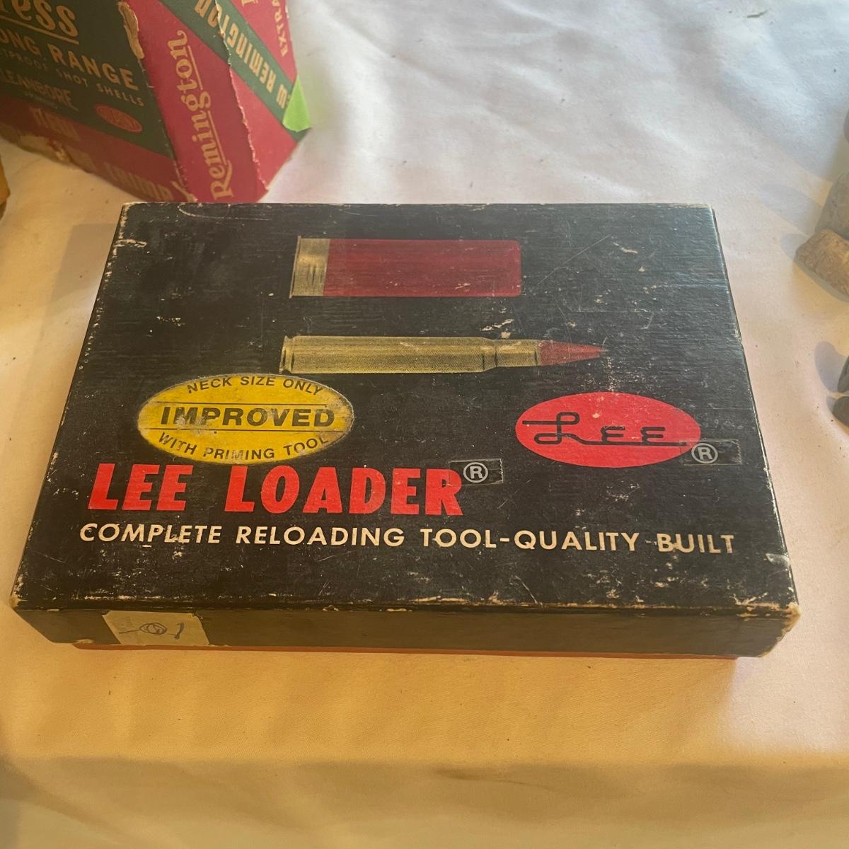 Twelve empty vintage cardboard ammo boxes are accompanied by a Lee Loader kit, large and small shells and more, see images.