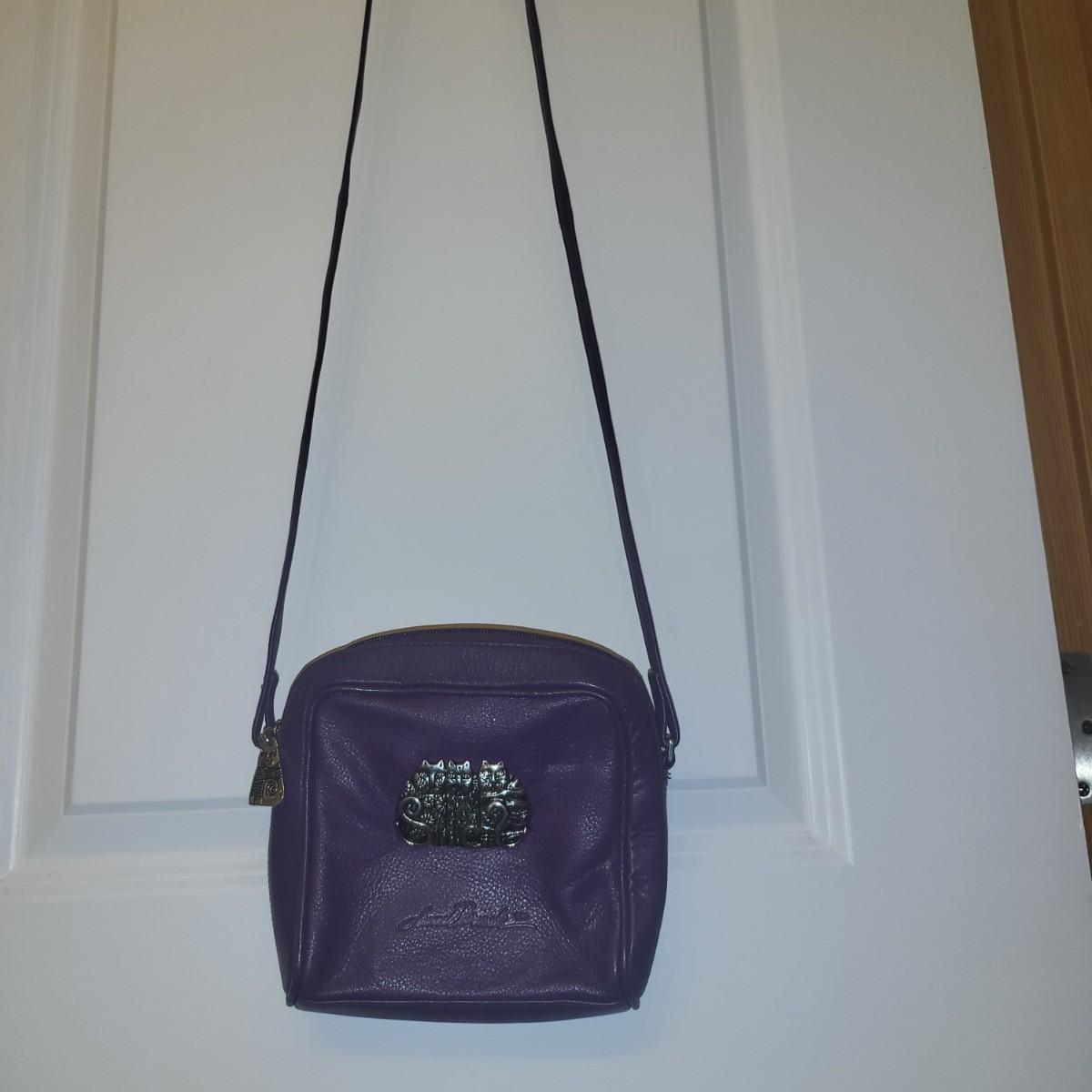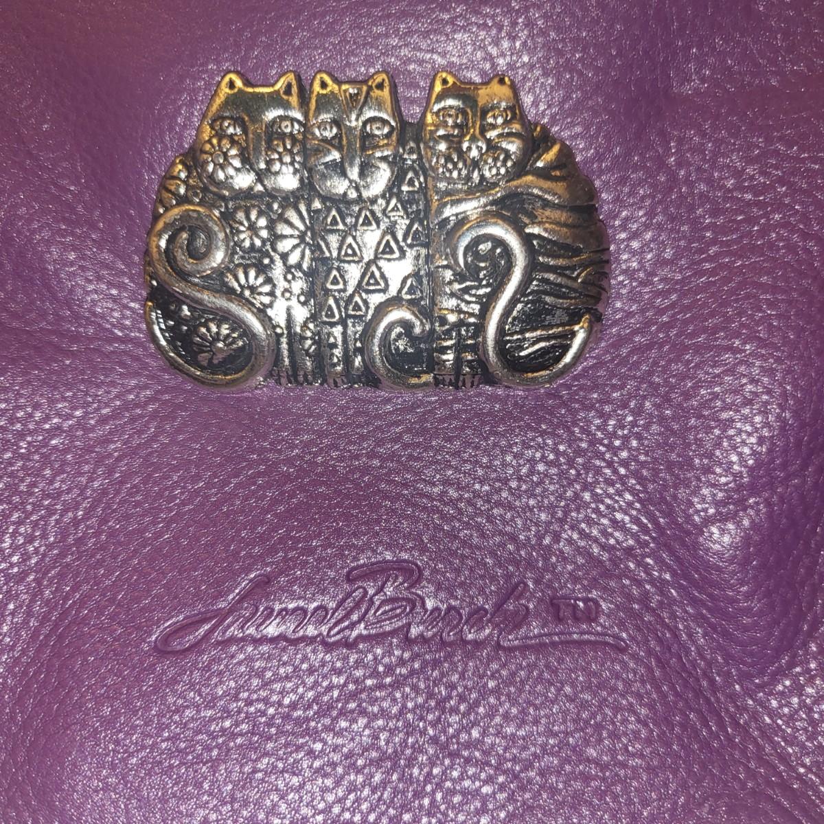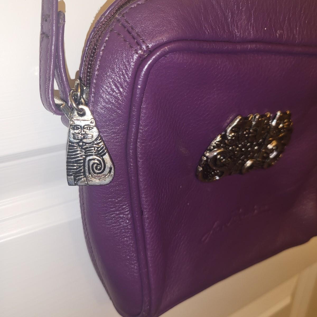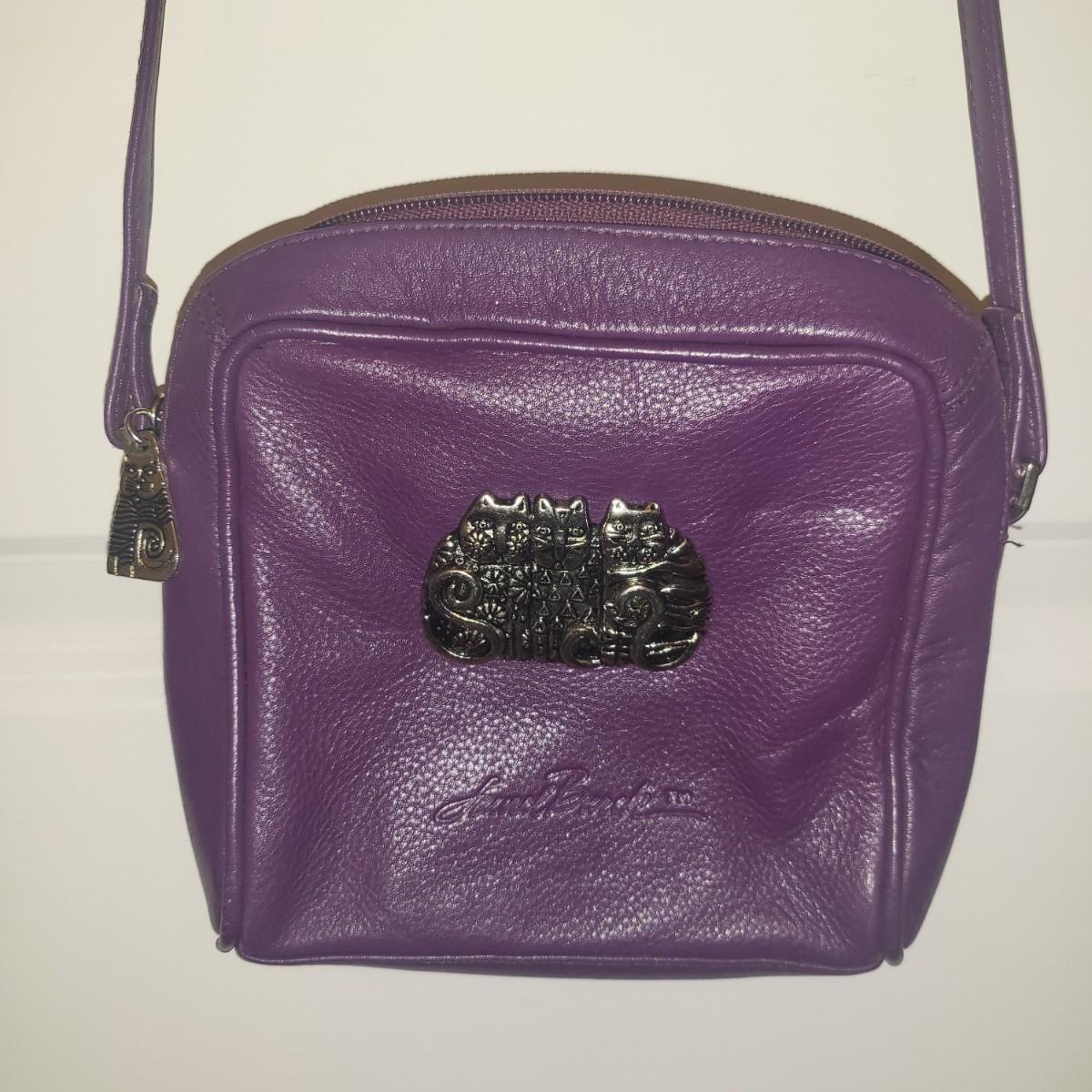 Cats motif, small purple Laurel Burch bag/purse. Lo g thin crossbody strap. 7" T x 7.5" L x 1.5 D