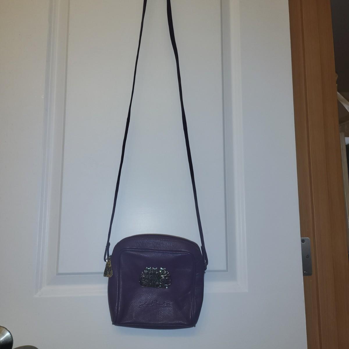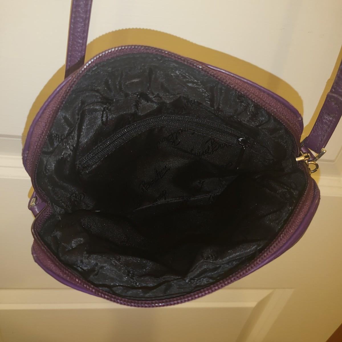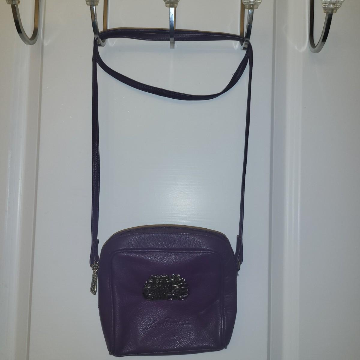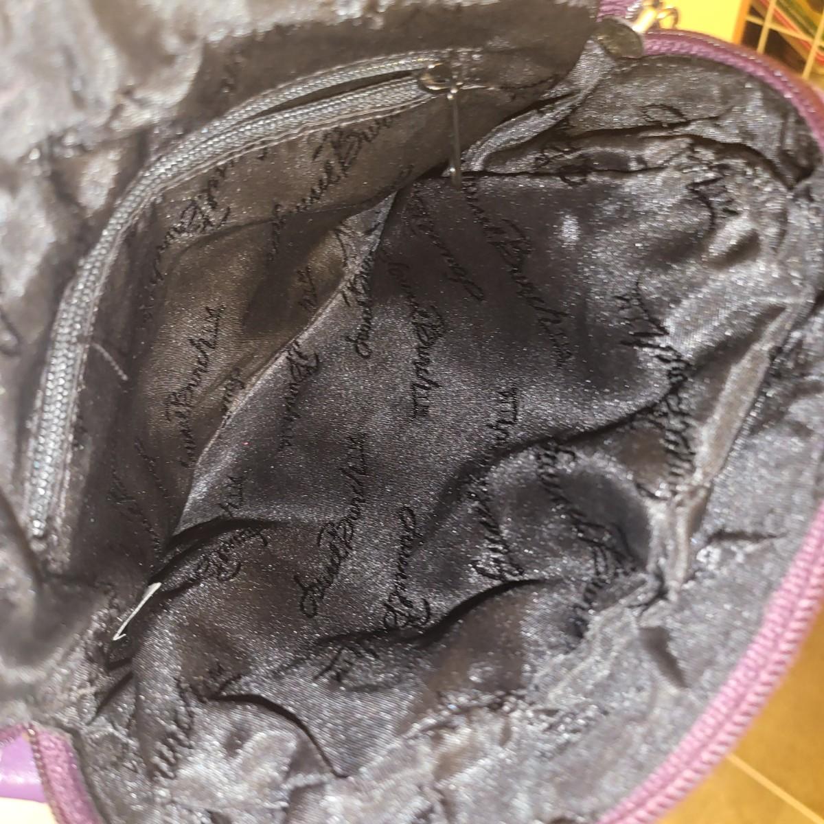Cats motif, small purple Laurel Burch bag/purse. Lo g thin crossbody strap. 7" T x 7.5" L x 1.5 D