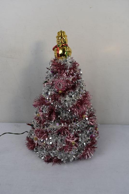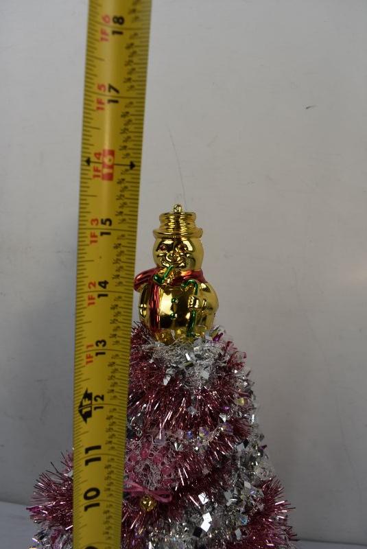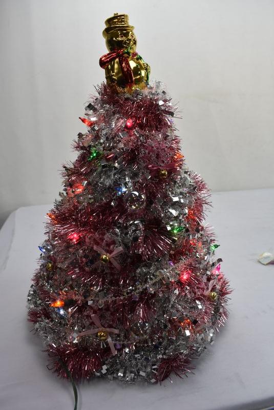 Small Light Up Tinsel Tree with Gold Color Snowman Topper - Works