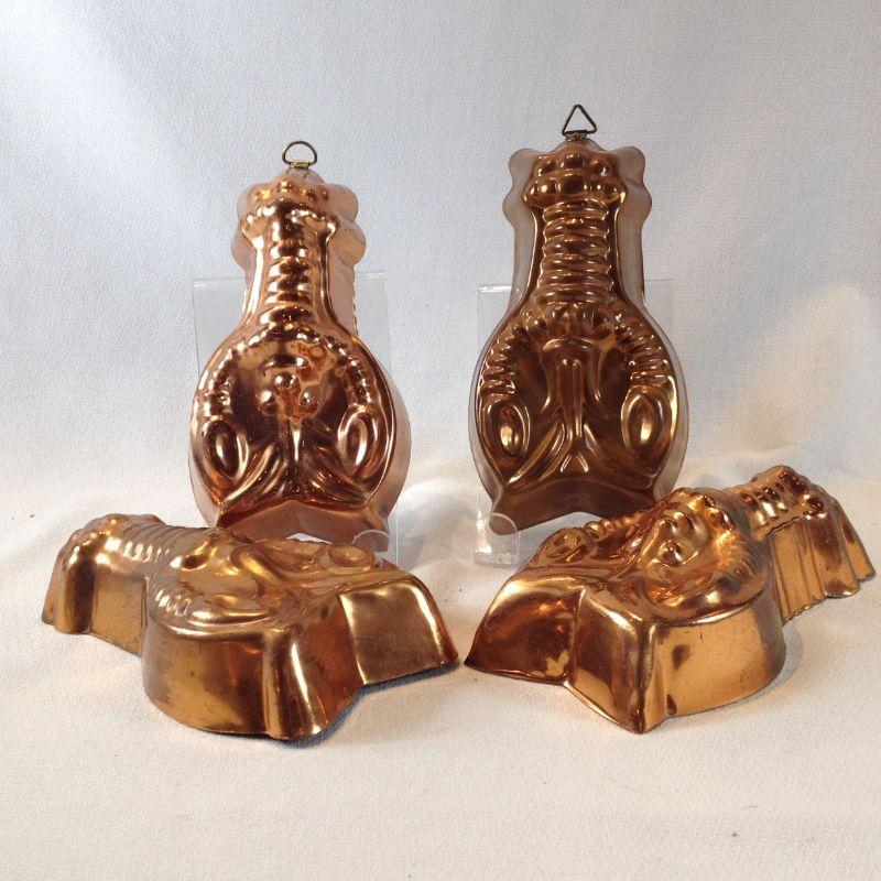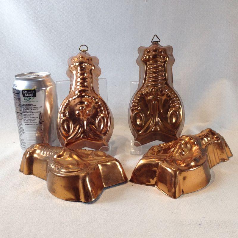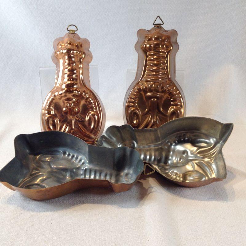 This lot is a set of 4 small copper-clad lobster molds. One shows more wear than the other three, but overall are in very good condition. Great for decoration or use.