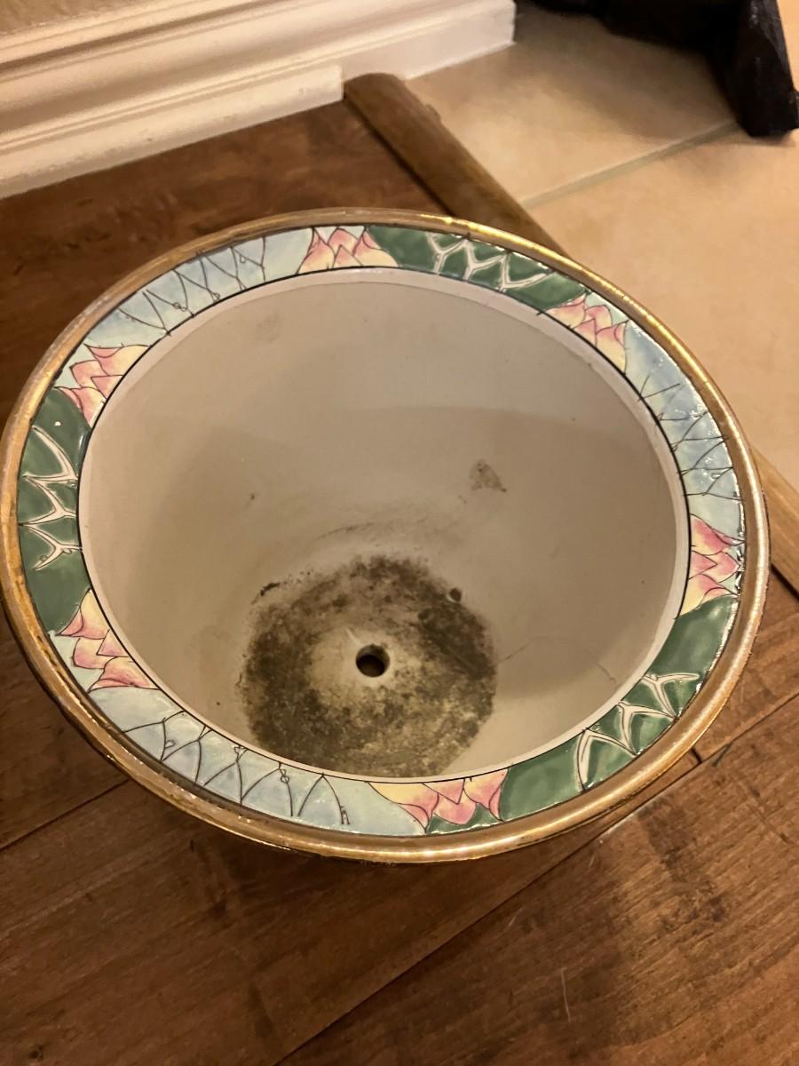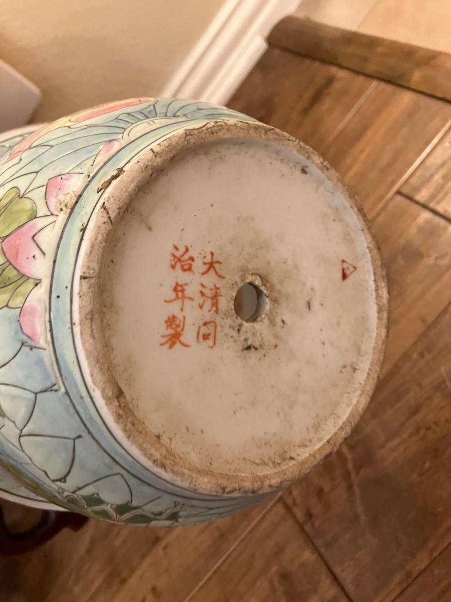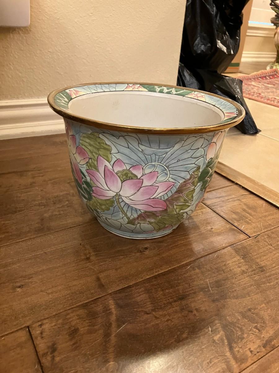 Small lotus flower design Chinese floor vase, measuring 6.5" H x 9.5" diameter