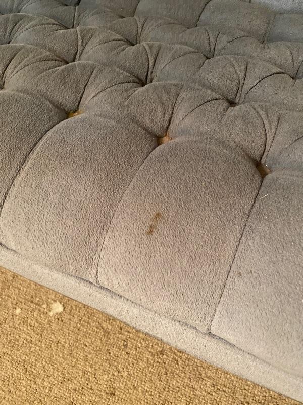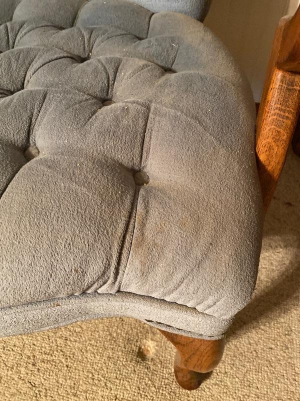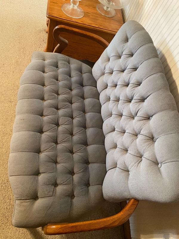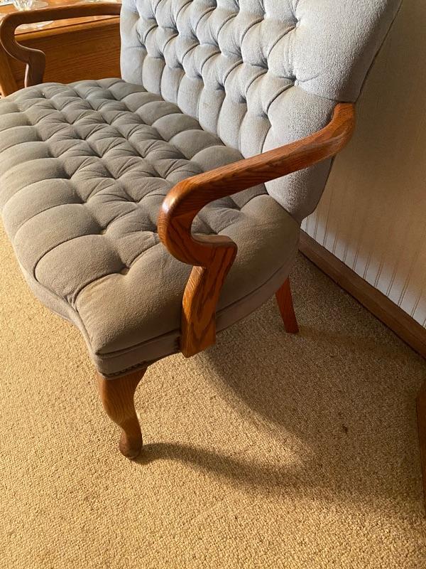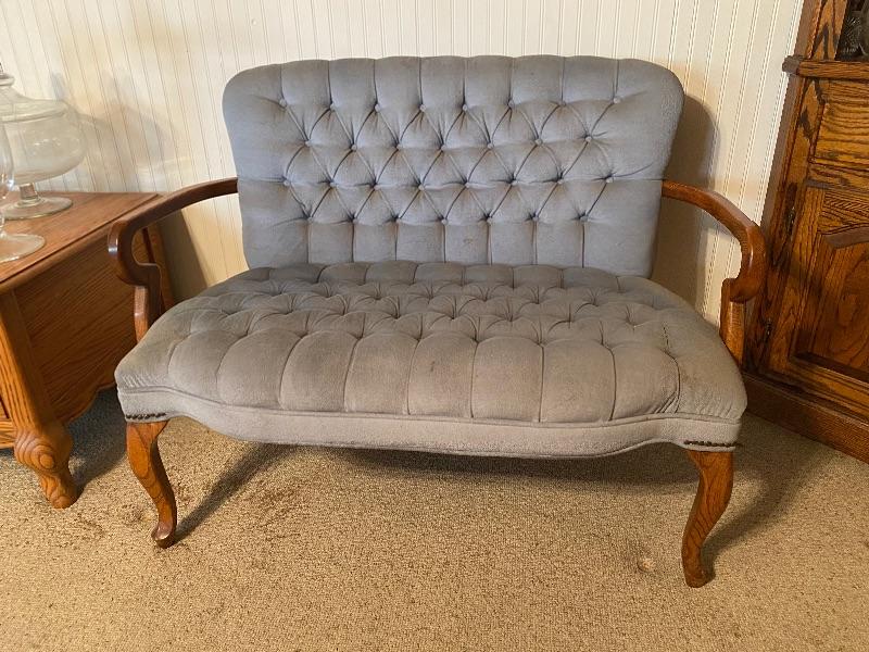 Pale blue tufted loveseat settee. Oak arms and legs. 45”w x 33”t x 23”d. Has a couple of spots and is dusty.