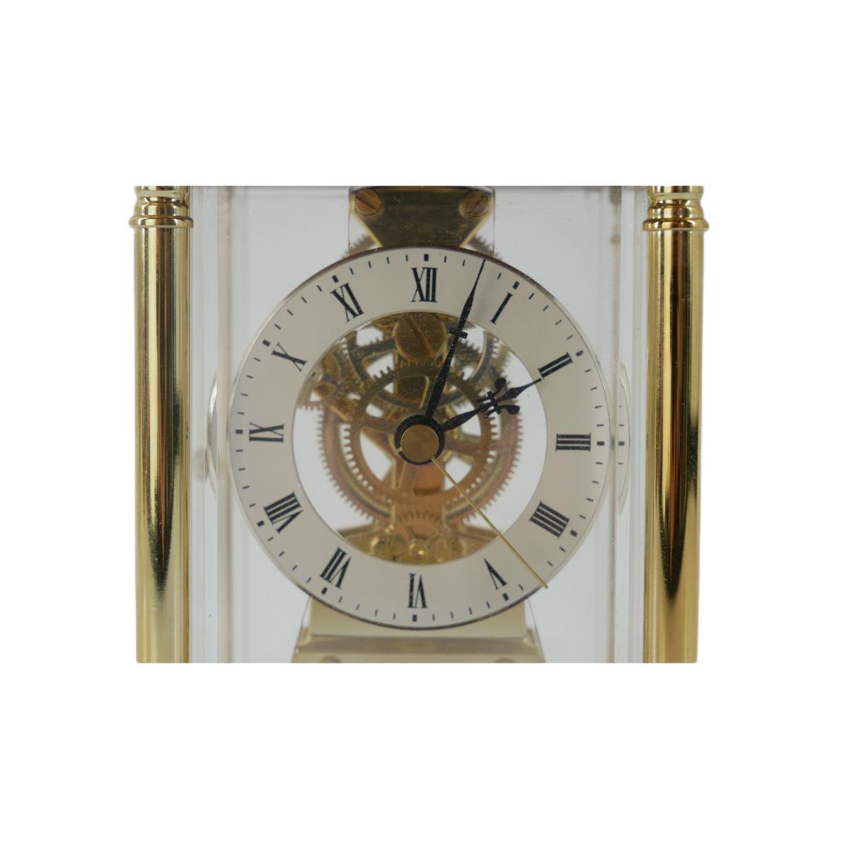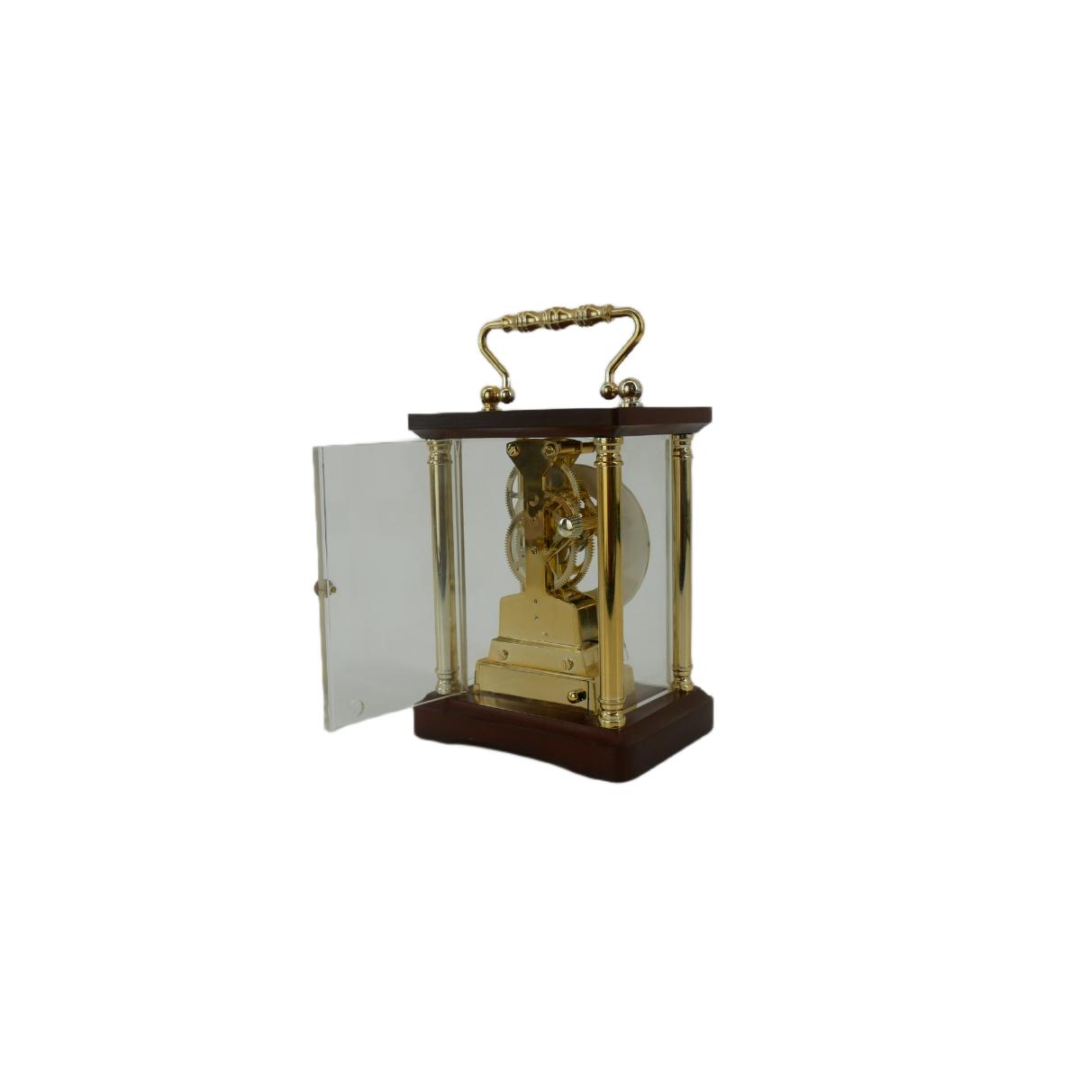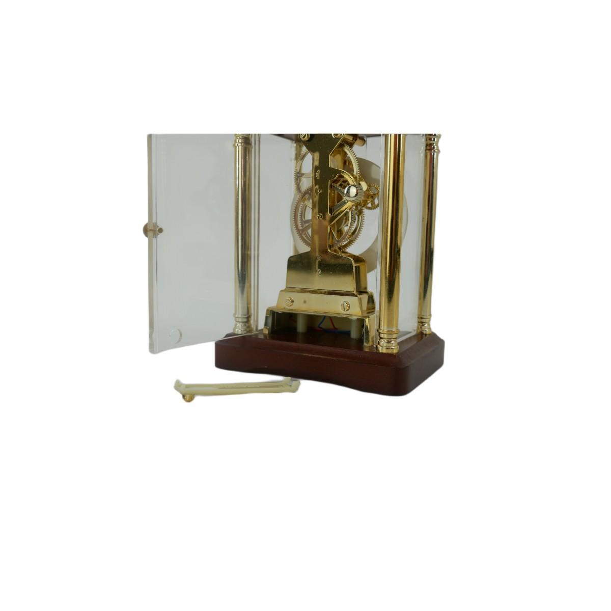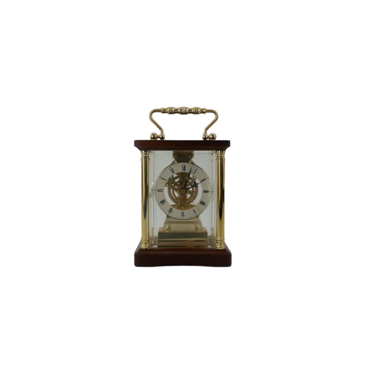 Small wooden and gold plastic mantle or table clock. Runs with one AA battery (not included). Battery compartment door is loose (see photo). Great condition overall. Measures L 3.5" x H 6" x w 2.5", weighs 8.3 oz. (D51)