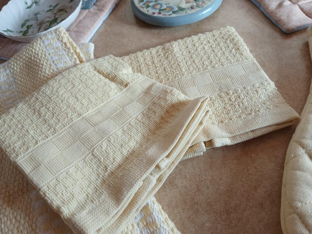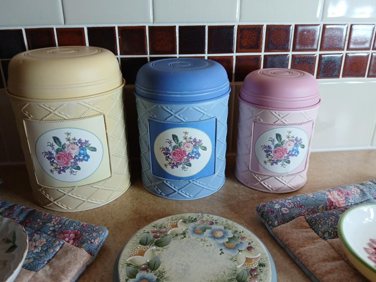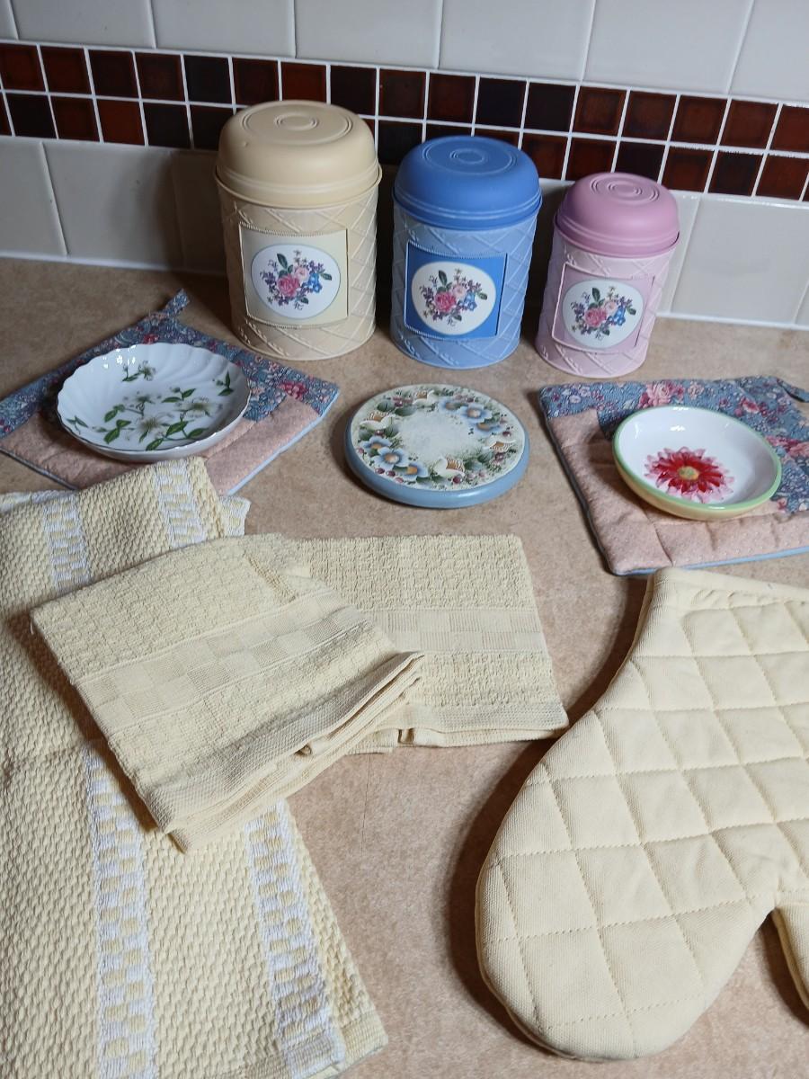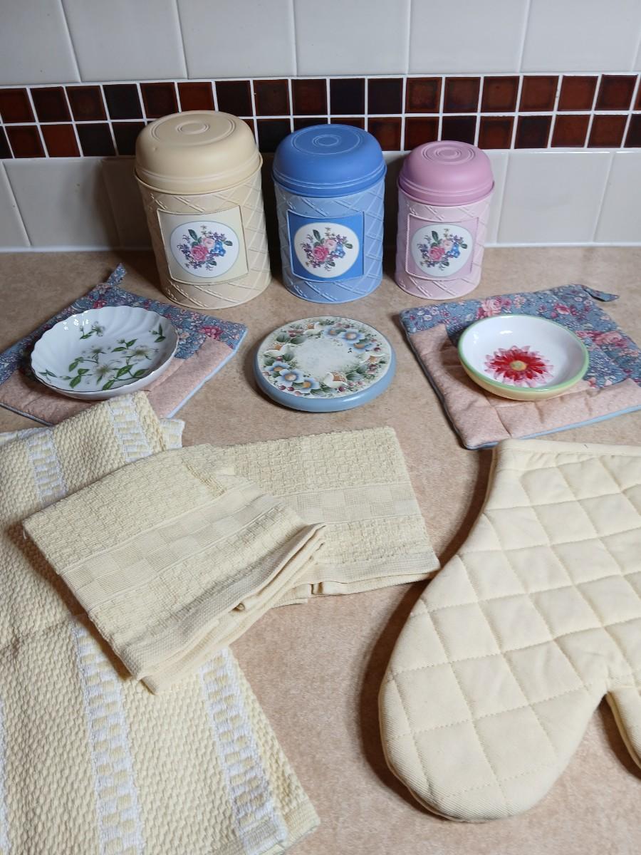 Small metal kitchen canister set with new kitchen towels and hot hand pad
