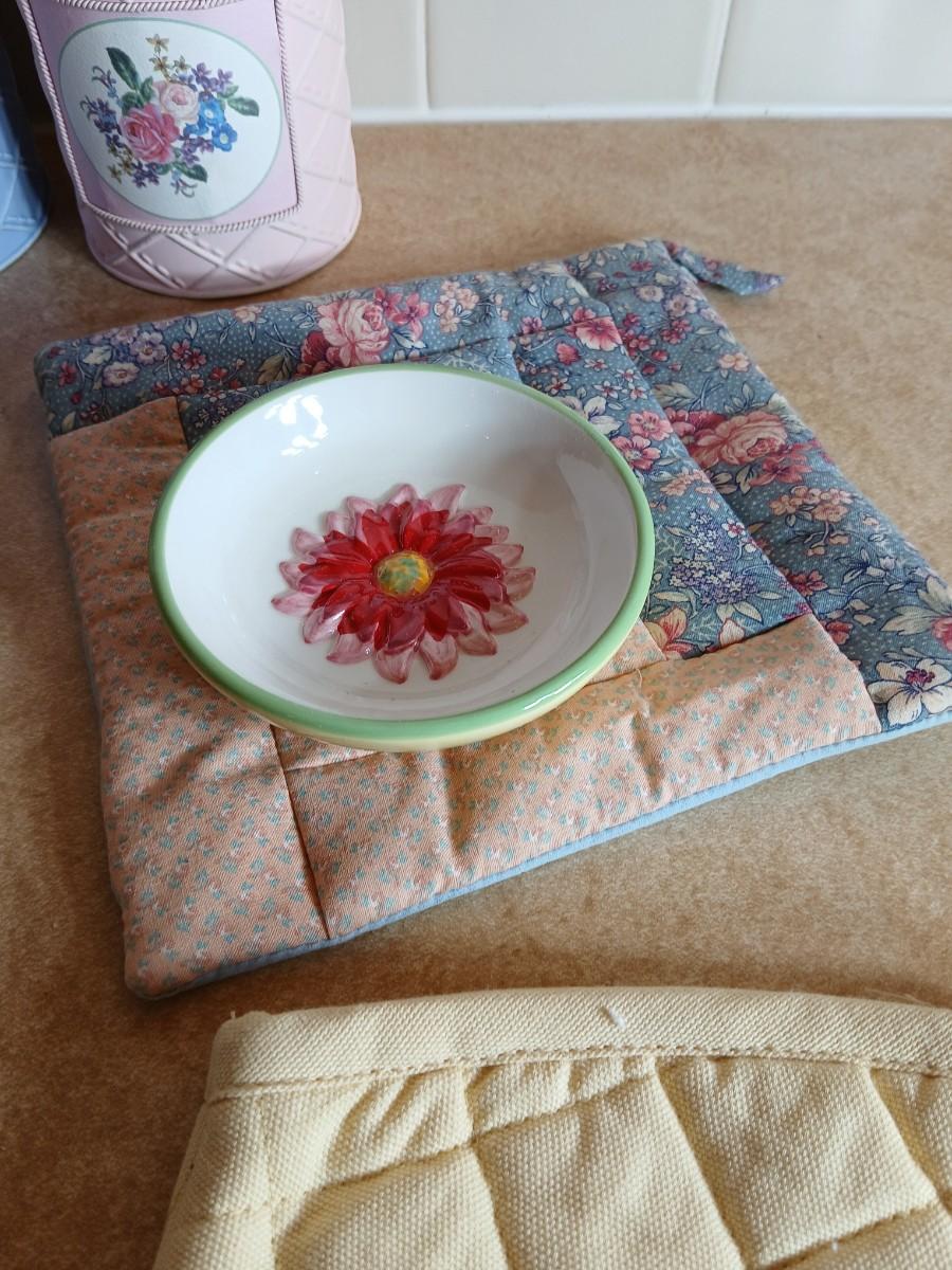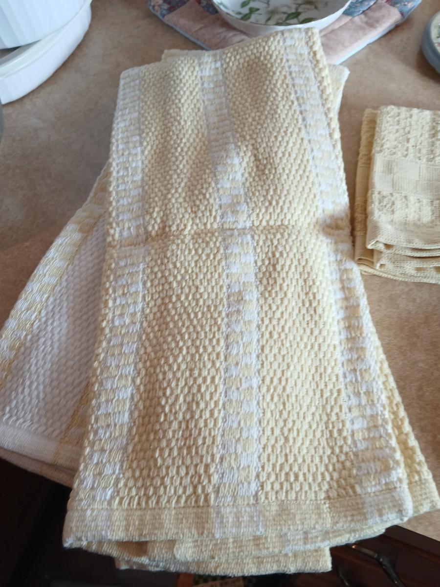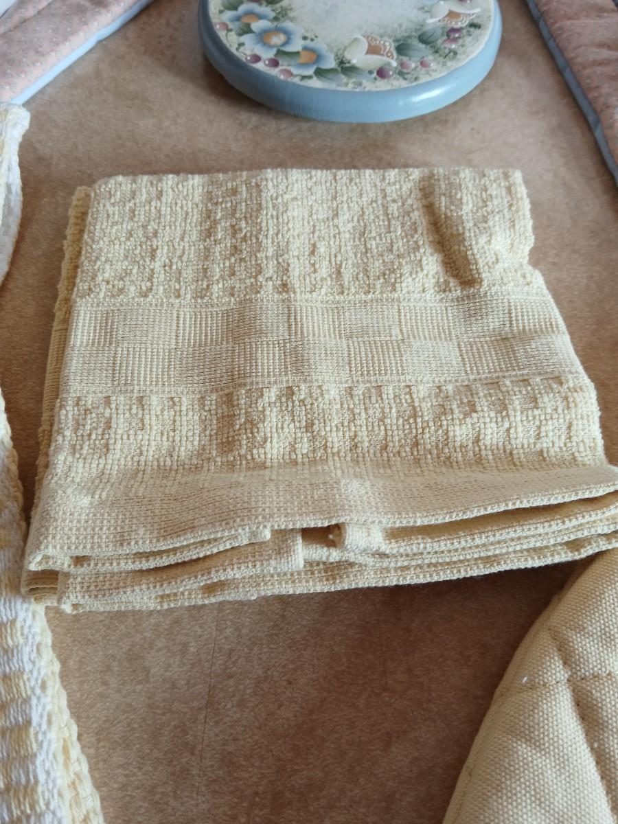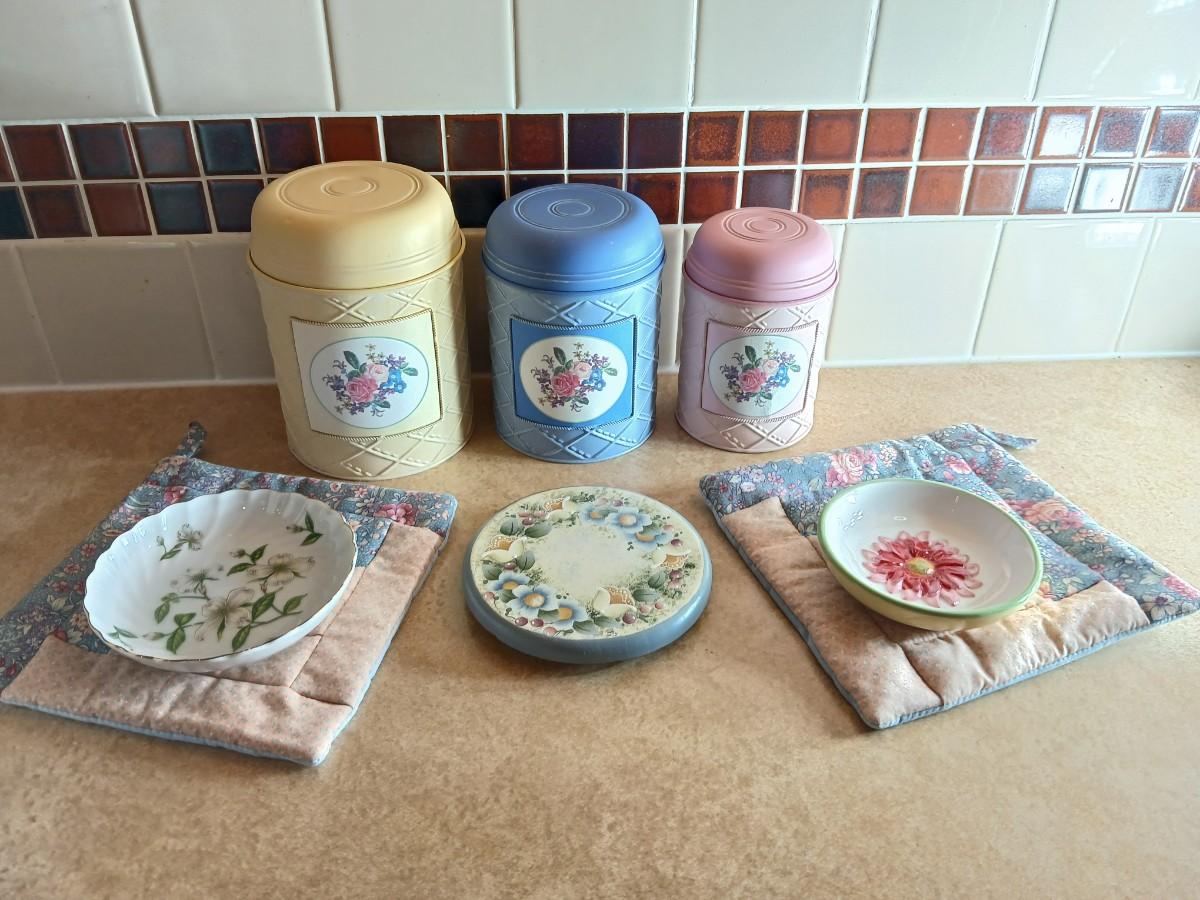 Small metal kitchen canister set with new kitchen towels and hot hand pad