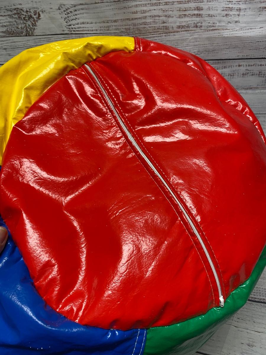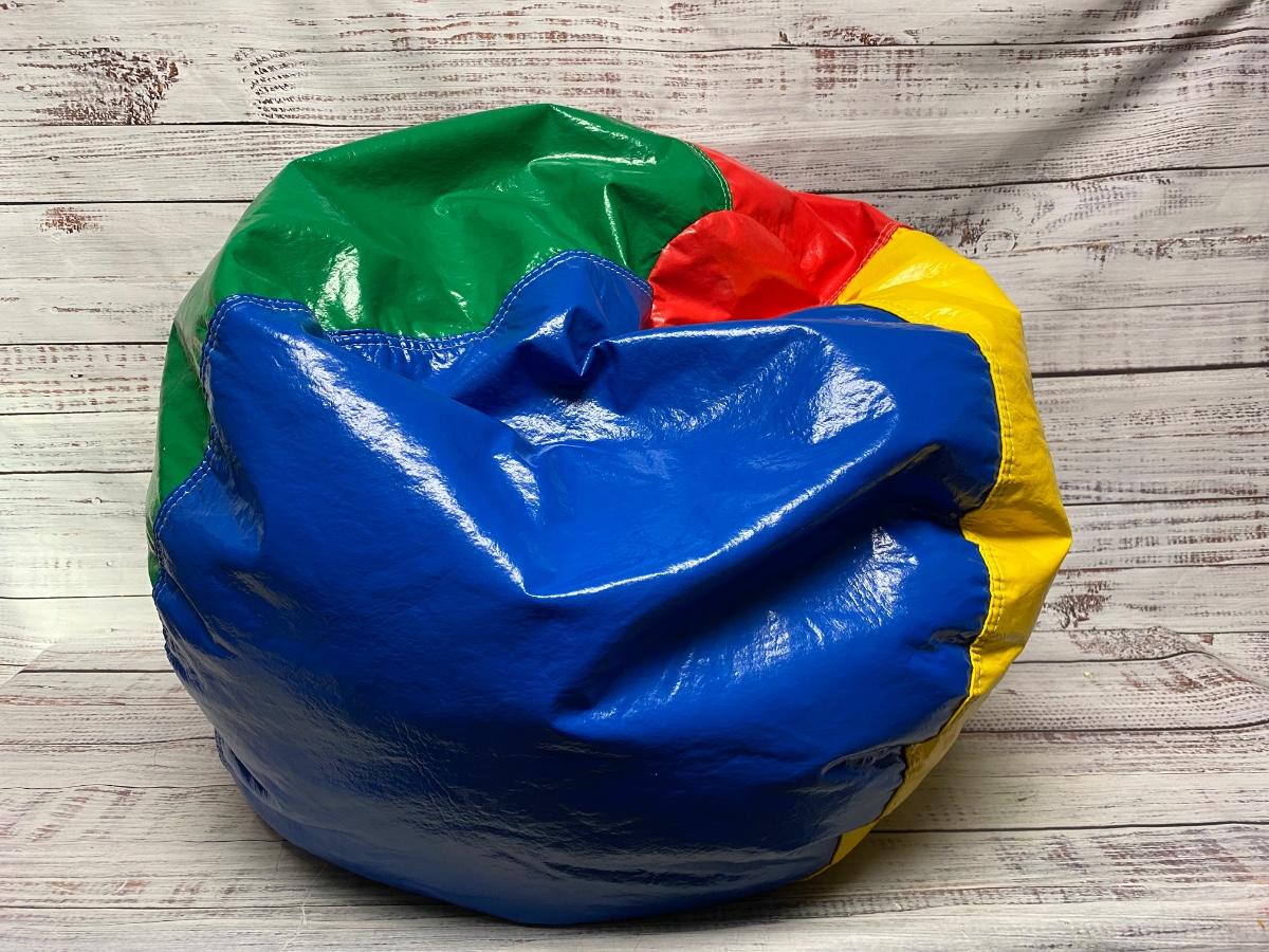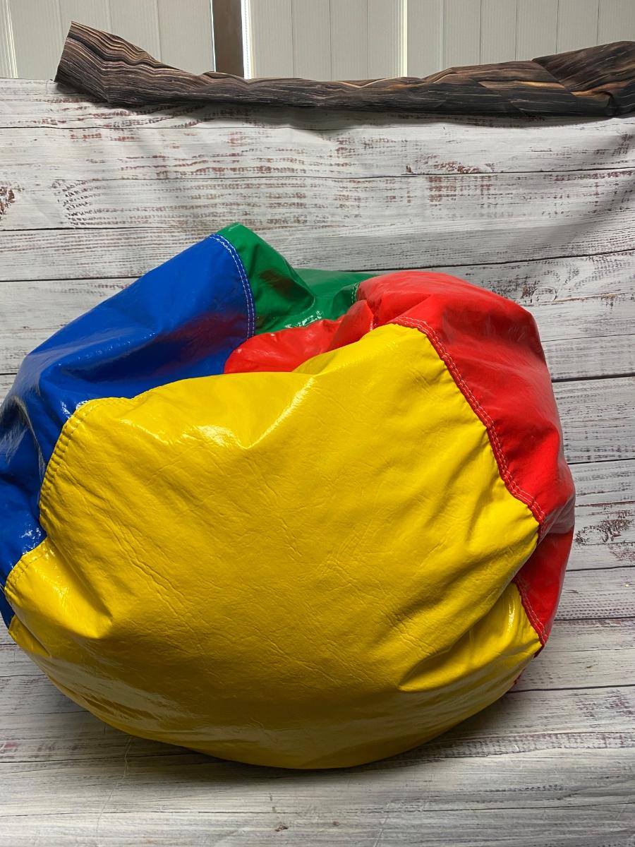 Small Multicolored Vinyl Bean Bag, there are no significant rips or tears to the bean bag and is in good useable condition. Measures to about two and half feet wide.
